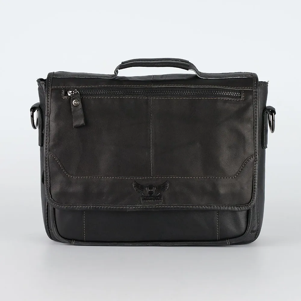 Современная мужская сумка от бренда Poshete выполнена из натуральной кожи в чёрном цвете. Сумка горизонтальной прямоугольной формы, вместительная. Снаружи одна ручка для переноски, съёмный плечевой ремень из плотного текстиля и клапан с карманом на молнии, под клапаном ещё карман на молнии и основное отделение с текстильной подкладкой.