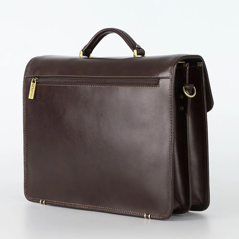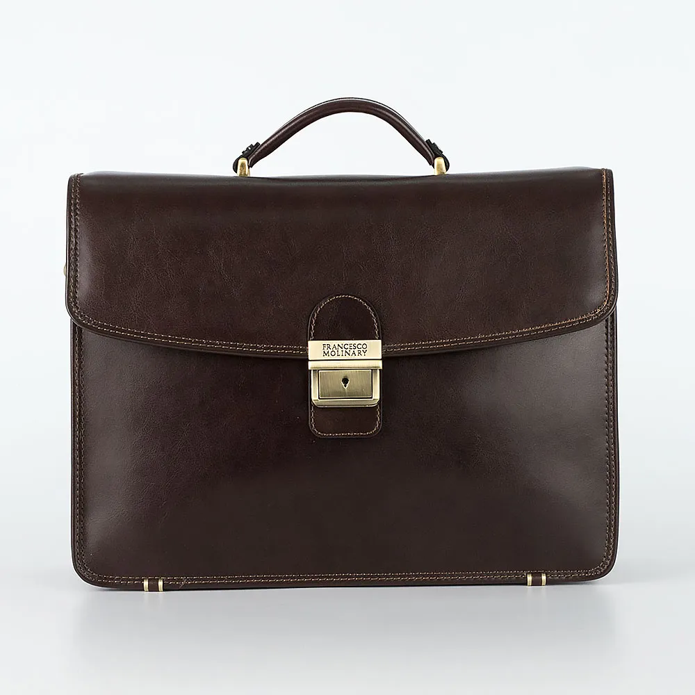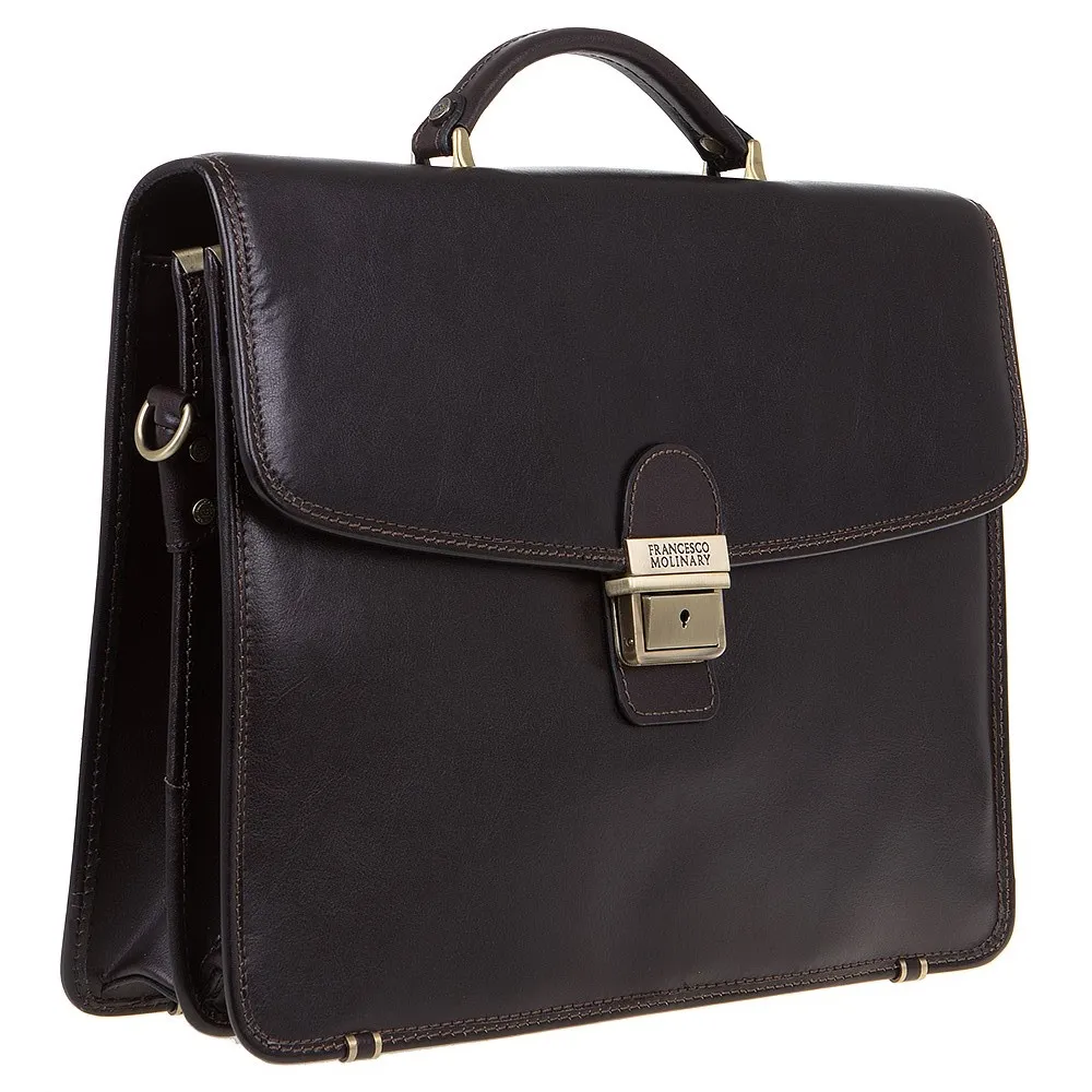 Классический мужской портфель Francesco Molinary из натуральной кожи коричневого цвета. Модель имеет два отдела с текстильной отделкой, разделенных средником на молнии, закрывается на крышку с золотистым металлическим замком-щеколдой. Внутри несколько прорезных карманов под молнией и накладных карманов без застежки, карман на молнии с задней внешней стороны. Фурнитура и ножки на дне портфеля металлические серебристого цвета. В комплекте съемный регулируемый кожаный ремень на плечо.