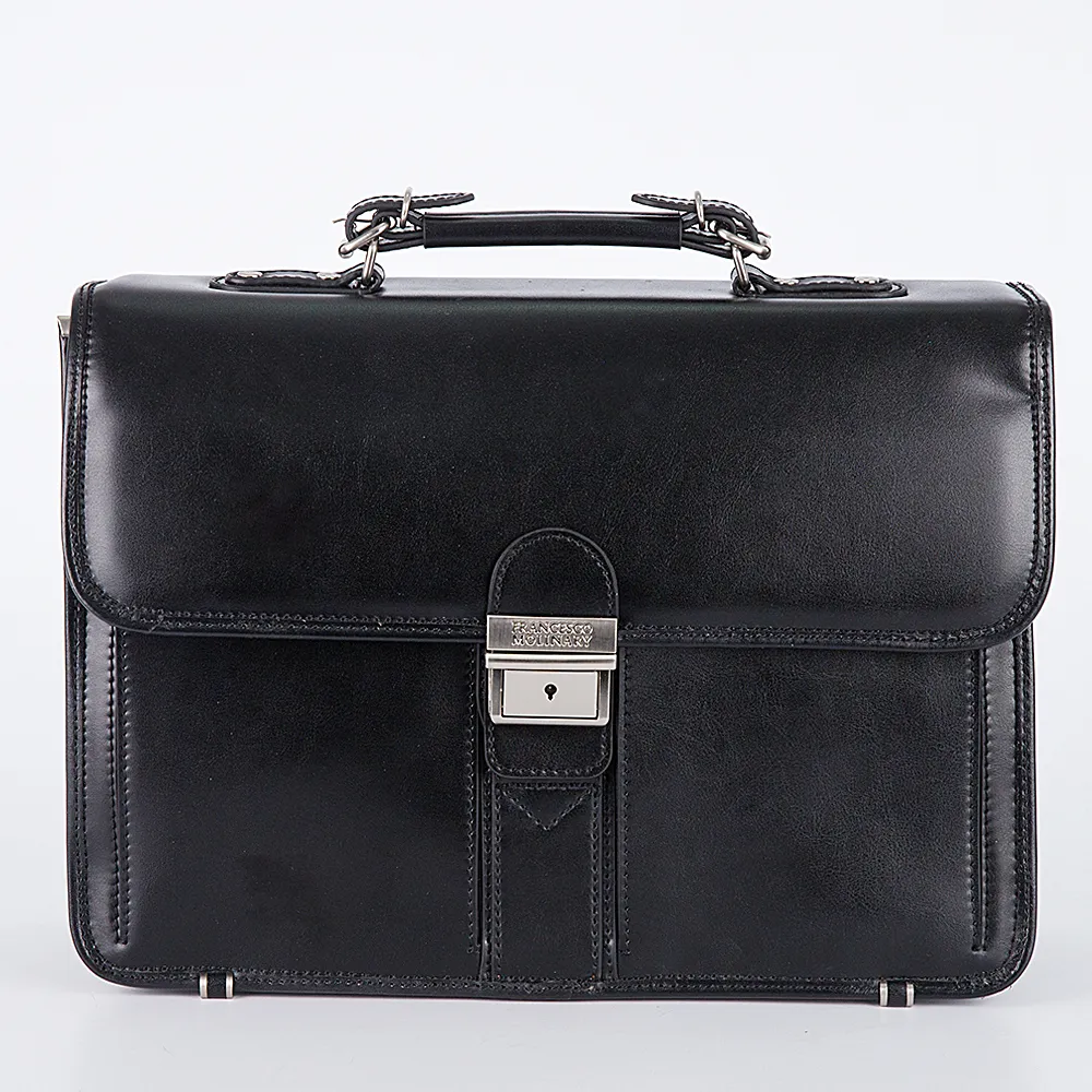 Мужской классический портфель Francesco Molinary из натуральной глянцевой кожи коричневого цвета. Внутри портфеля два больших отделения, в отделяющей их перегородке карман на молнии. Также имеются карманы для визиток, ручки и телефона. Застежка на откидной клапан с замком на ключе. Под клапаном три кармана, один большой, два боковых закрываются на кнопку. На задней стенке портфеля внешний и внутренний карманы на молнии. В комплекте плечевой ремень из натуральной кожи.