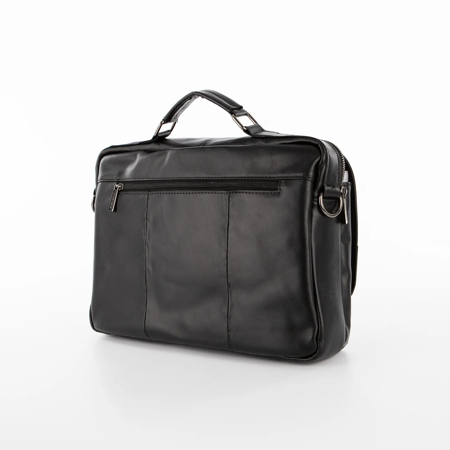 Портфель от торговой марки Poshete из натуральной кожи черного цвета. Модель с ручкой и съемным регулируемым плечевым ремнем. Отделение на молнии. Внутри: фирменная подкладка, карман на молнии. На лицевой стороне – накладной карман с клапаном. На задней стороне – карман на молнии.