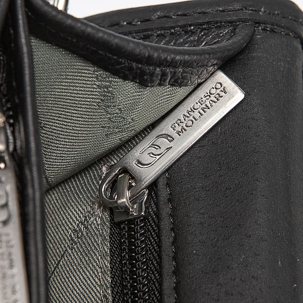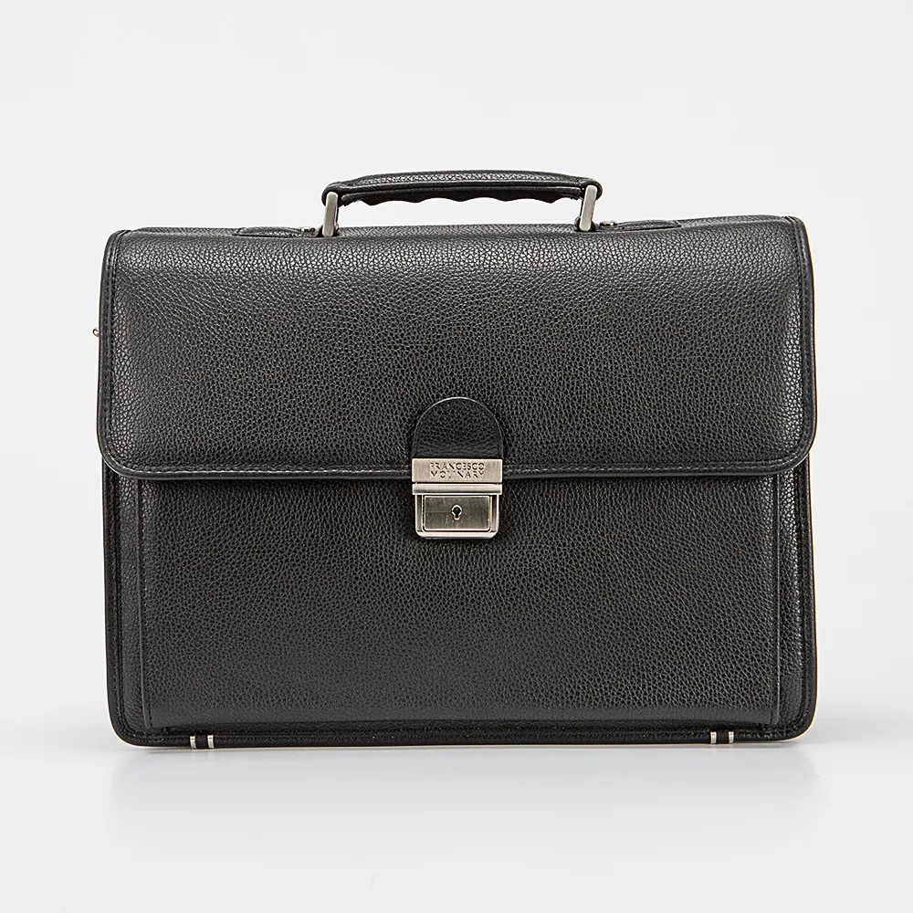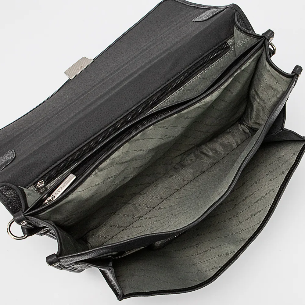 Портфель от торговой марки Francesco Molinary из натуральной кожи черного цвета. Практичная функциональная модель с одной ручкой и съемным регулируемым плечевым ремнем с наплечником. Клапан на цупферном замке с замком (в комплекте имеется ключ) закрывает накладной карман и отделение с фирменной подкладкой. В накладном кармане – органайзер для канцелярских принадлежностей и ремешок для крепления ключей. В отделении – три отсека, один из которых на молнии; имеется карман на молнии. На задней стороне – карман на молнии. Дно с накладками для защиты от износа.