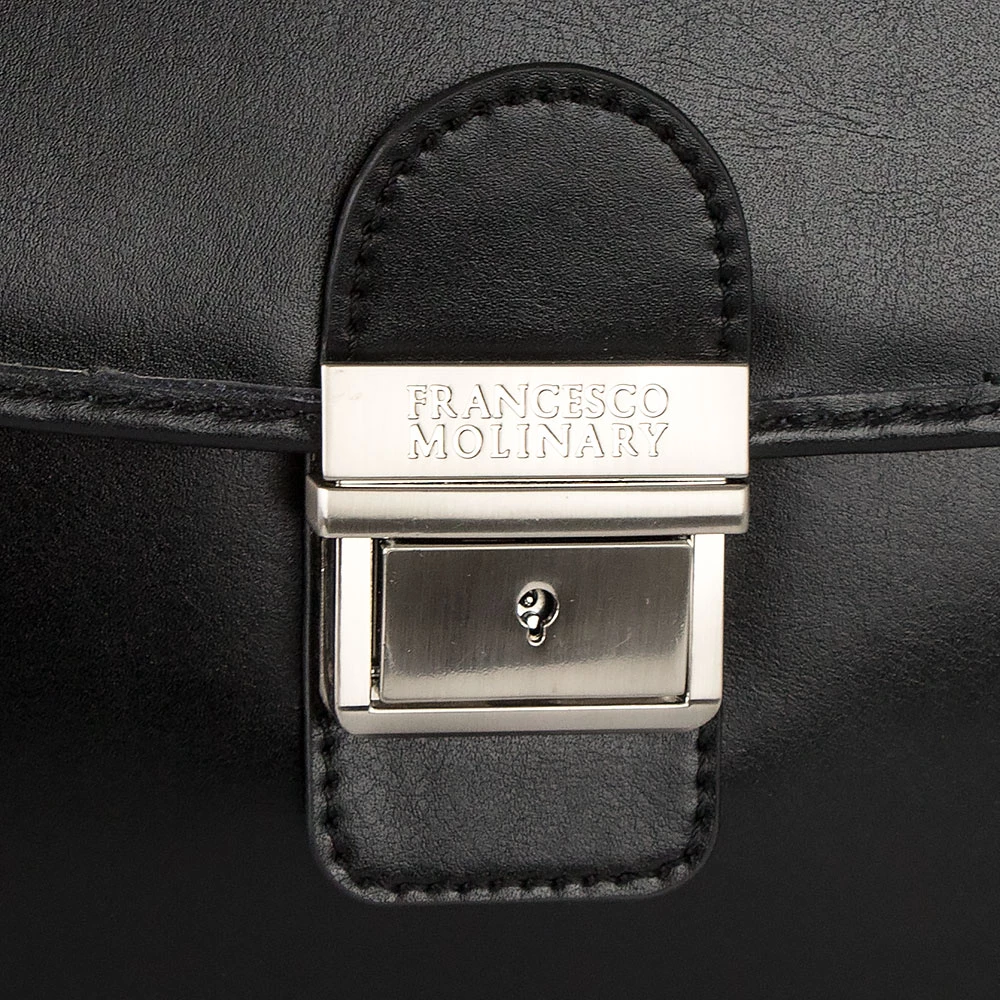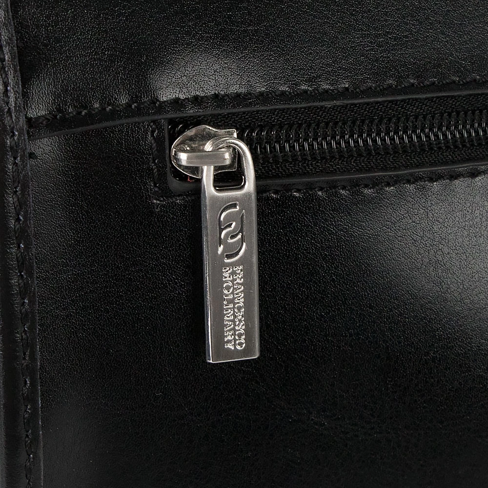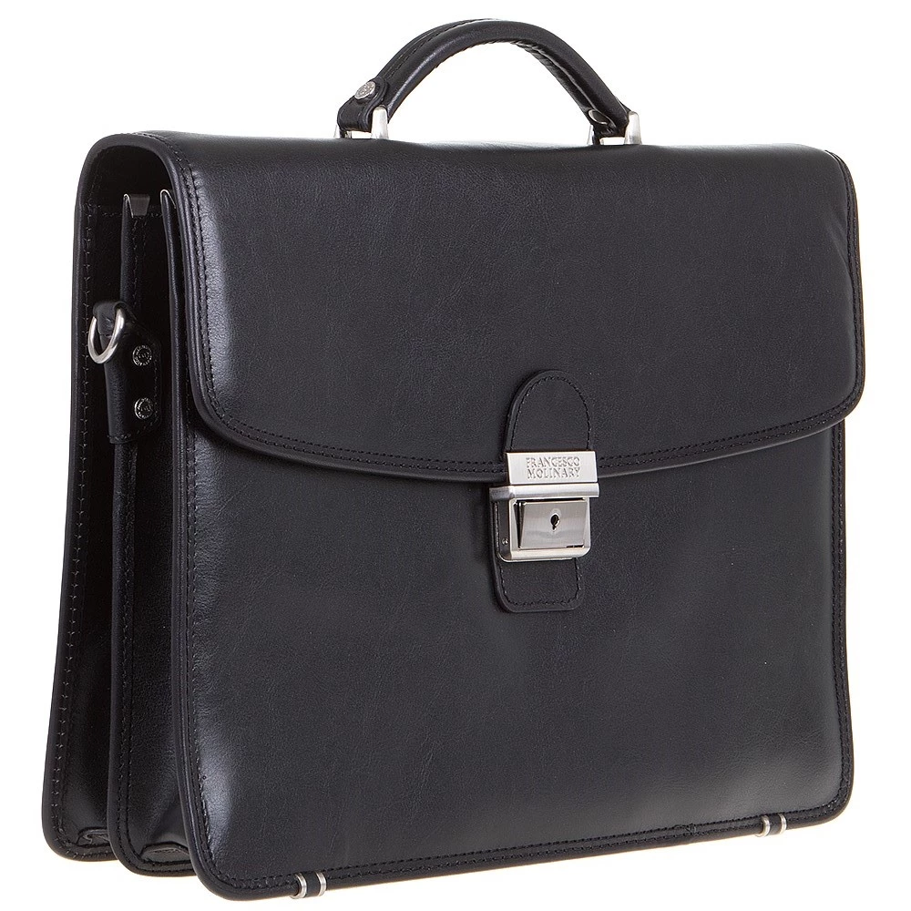 Классический мужской портфель от бренда Francesco Molinary из натуральной кожи черного цвета. Модель имеет два отдела с текстильной отделкой, разделенных средником на молнии, закрывается на крышку с серебристым металлическим замком-щеколдой. Внутри несколько прорезных карманов под молнией и накладных карманов без застежки, карман на молнии с задней внешней стороны. Фурнитура и ножки на дне портфеля металлические серебристого цвета. В комплекте съемный регулируемый кожаный ремень на плечо.