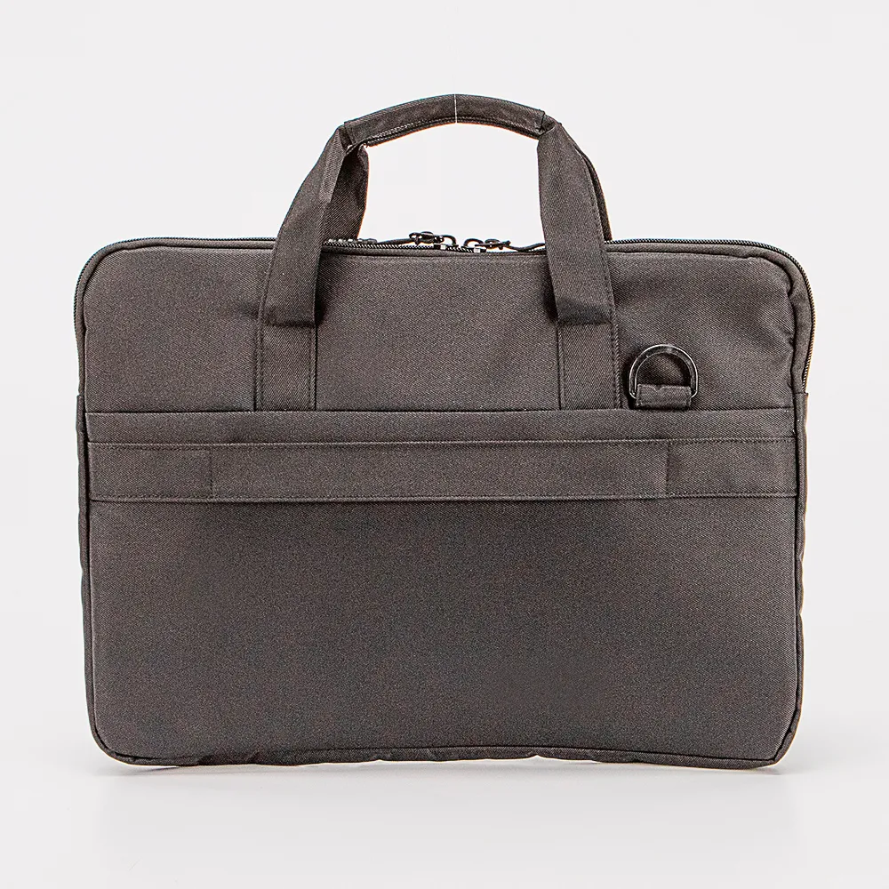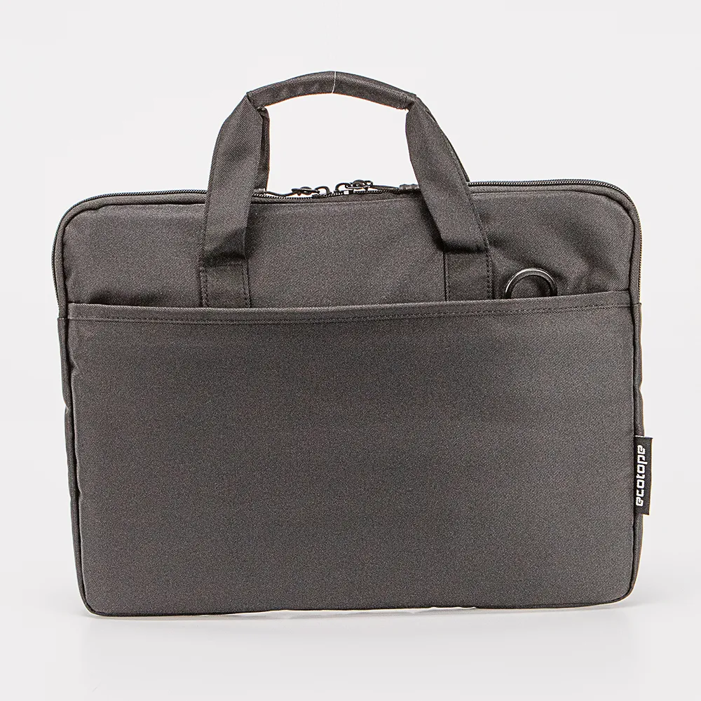Сумка от торговой марки Ecotope из практичного текстильного материала. Плоская модель для ноутбука диагональю 14 дюймов, с двумя ручками, съемным регулируемым плечевым ремнем. Стенки сумки уплотнены. Отделение на молнии, с текстильной подкладкой. На лицевой стороне – карман на скрытой молнии. На задней стороне имеется лямка для крепления на выдвижную ручку чемодана.