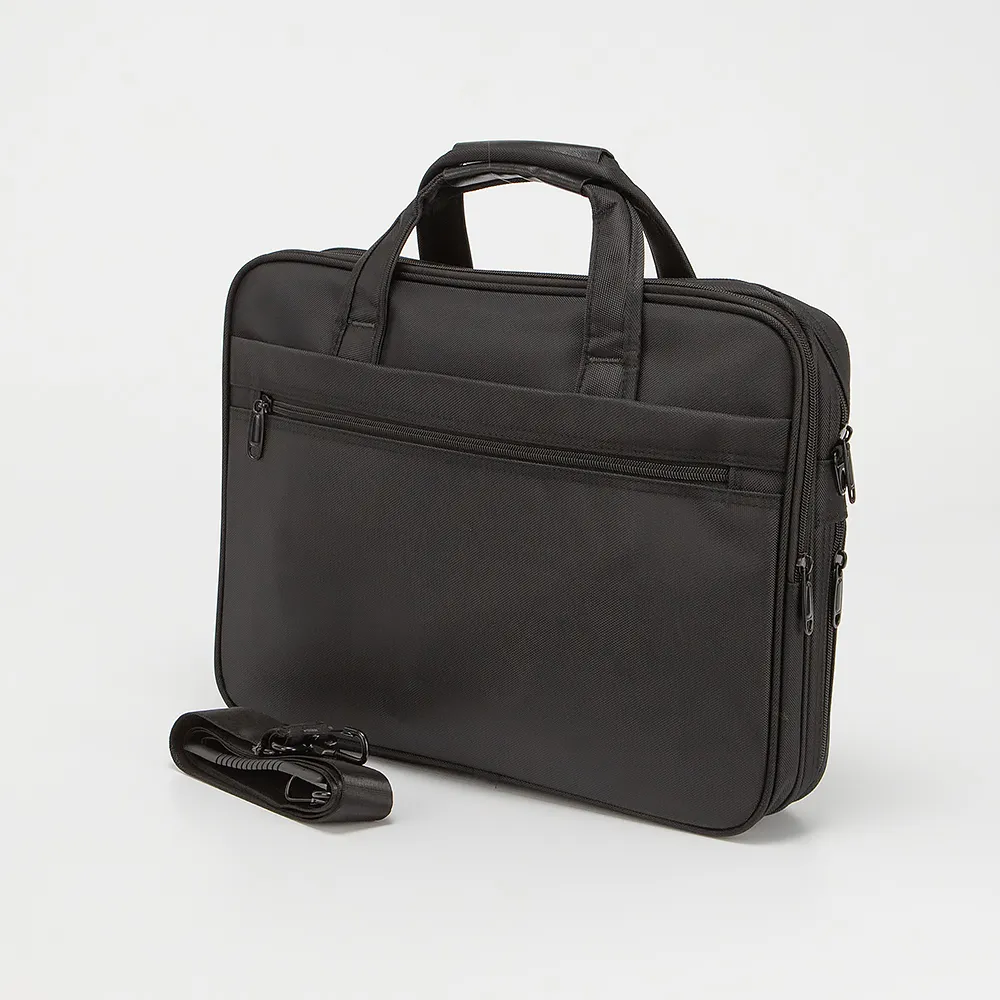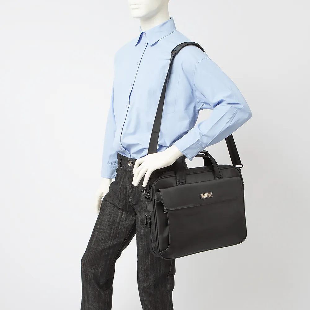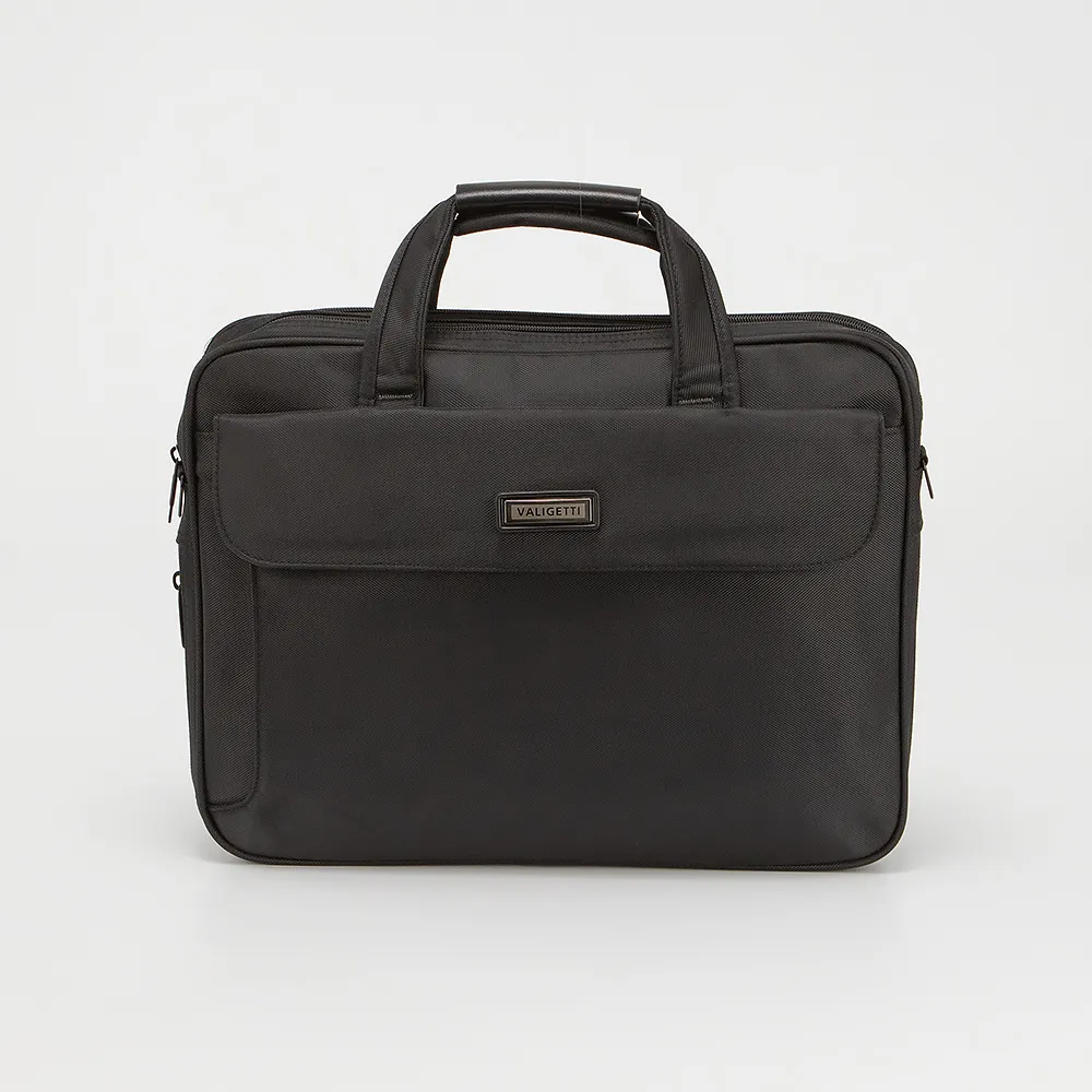 Стильная и практичная сумка для ноутбука от бренда Valigetti. Модель выполнена из плотного текстиля черного цвета. Два отделения на молнии. Снаружи большой накладной карман под откидным клапаном и вертикальный карман на молнии. Модель на двух удобных ручках для переноса, дополнена съемным регулируемым плечевым ремнем. На задней стороне - карман на молнии.