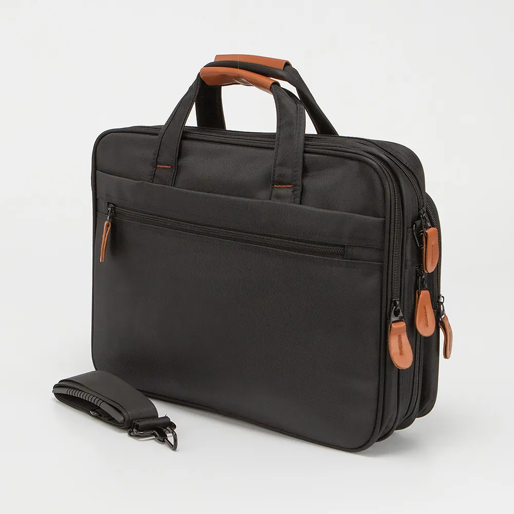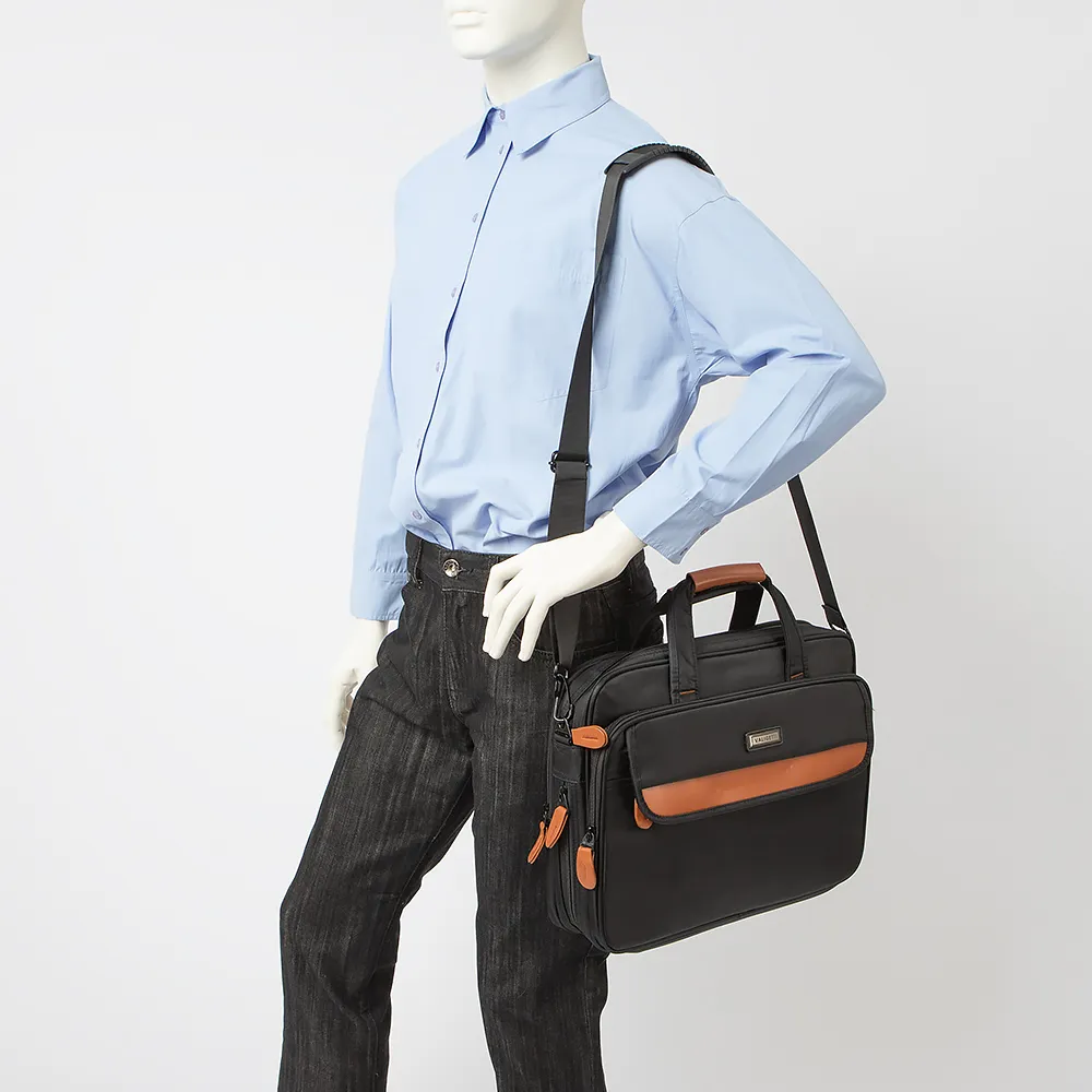 Стильная и практичная сумка для ноутбука от бренда Valigetti. Модель выполнена из плотного текстиля черного цвета и дополнена коричневыми вставками. Два отделения на молнии. Снаружи большой накладной карман под откидным клапаном и карман на молнии. Модель на двух удобных ручках для переноса, дополнена съемным регулируемым плечевым ремнем. На задней стороне - карман на молнии. Имеется молния для увеличения объема.