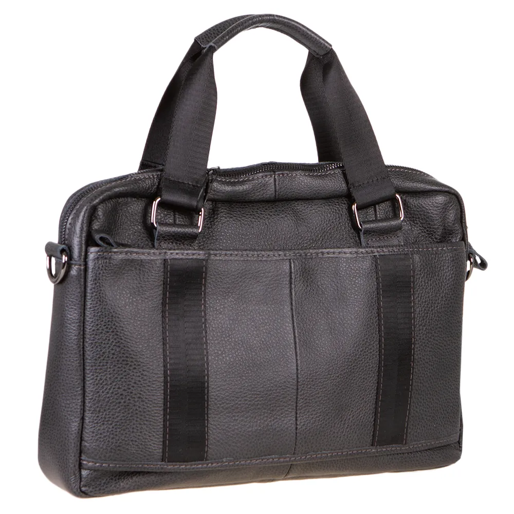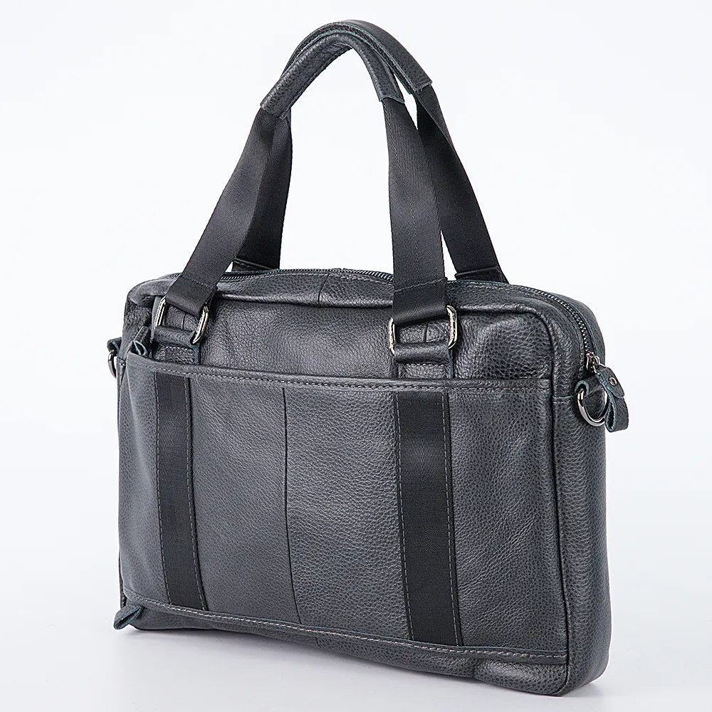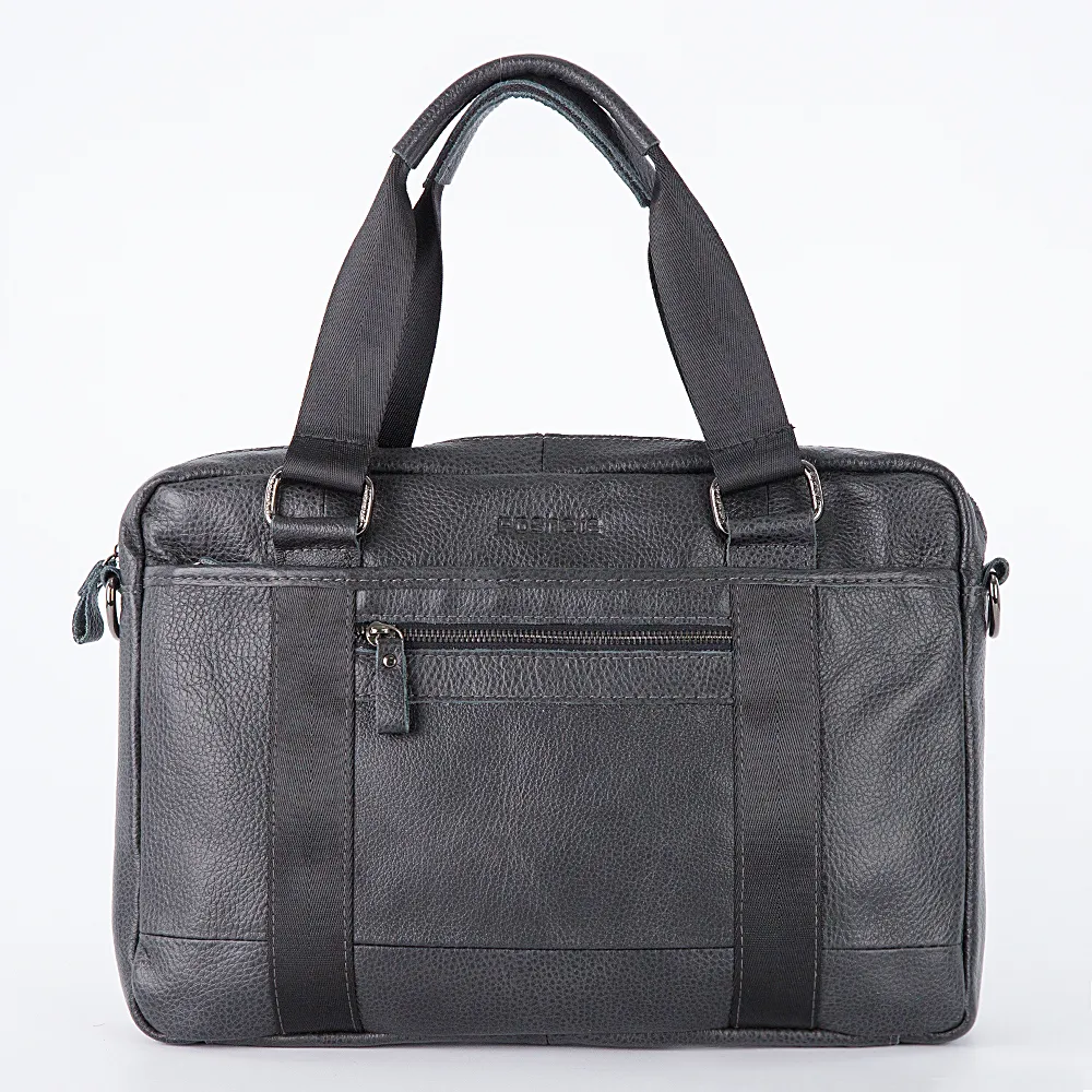 Стильная сумка под ноутбук от бренда Poshete выполнена из натуральной крупнозернистой кожи темно-серого цвета. Модель с двумя черными текстильными ручками с кожаными вставками, съемным плечевым ремнем. Отделение на молнии, с текстильной подкладкой и карманами, включая отделение для ноутбука. На передней стороне – карман на молнии.