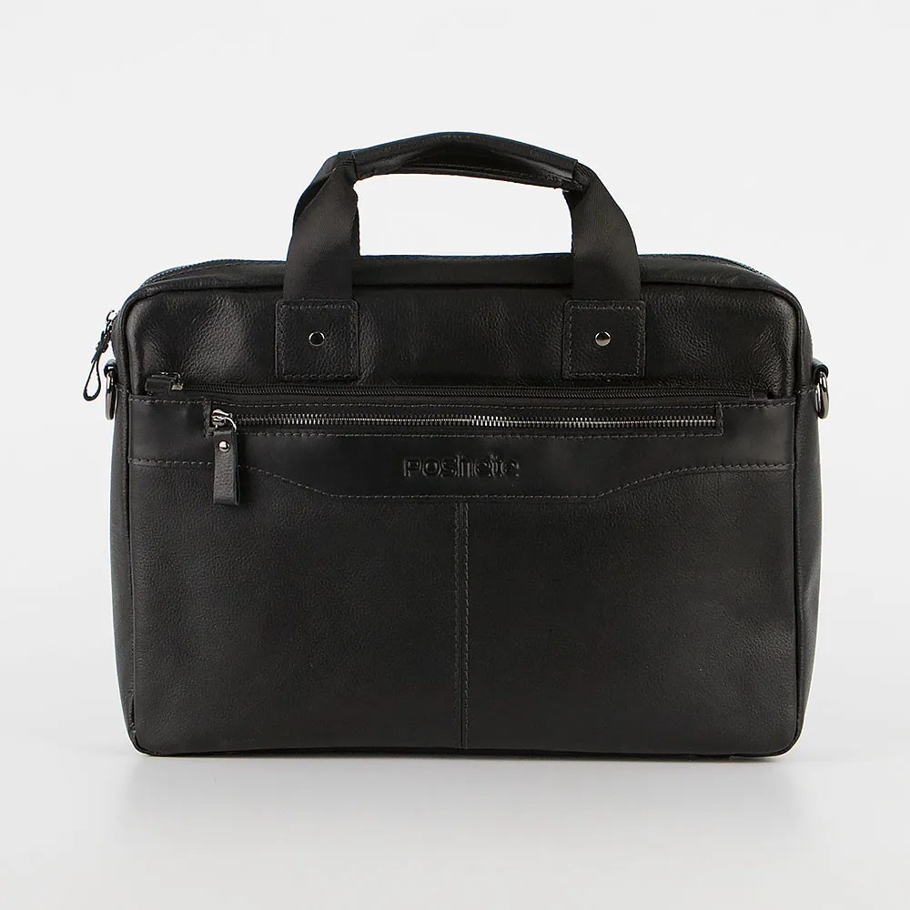 Сумка от торговой марки Poshete из натуральной кожи черного цвета. Модель с двумя ручками и съемным регулируемым плечевым ремнем. Отделение на молнии. Внутри: фирменная подкладка, карман на молнии, два накладных кармана. На лицевой стороне – два кармана на молнии. На задней стороне – карман на молнии, лямка для крепления сумки на выдвижную ручку чемодана.