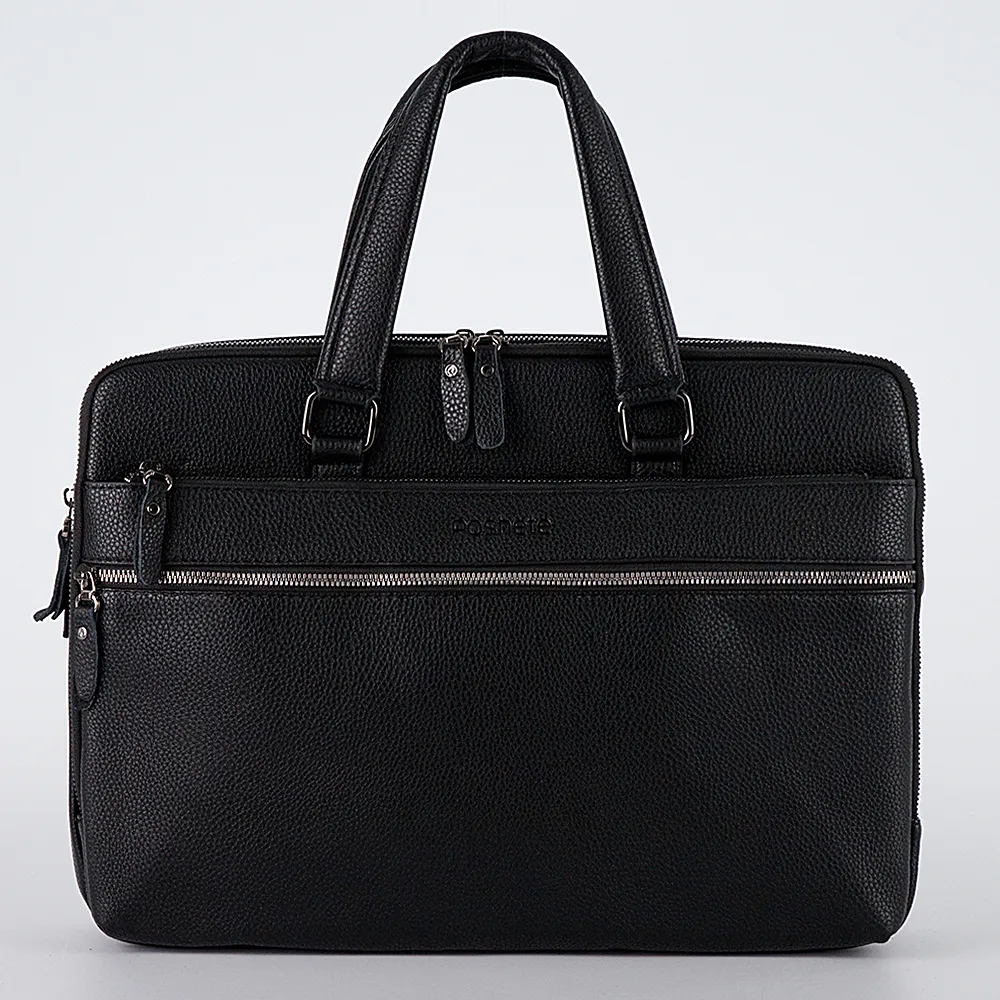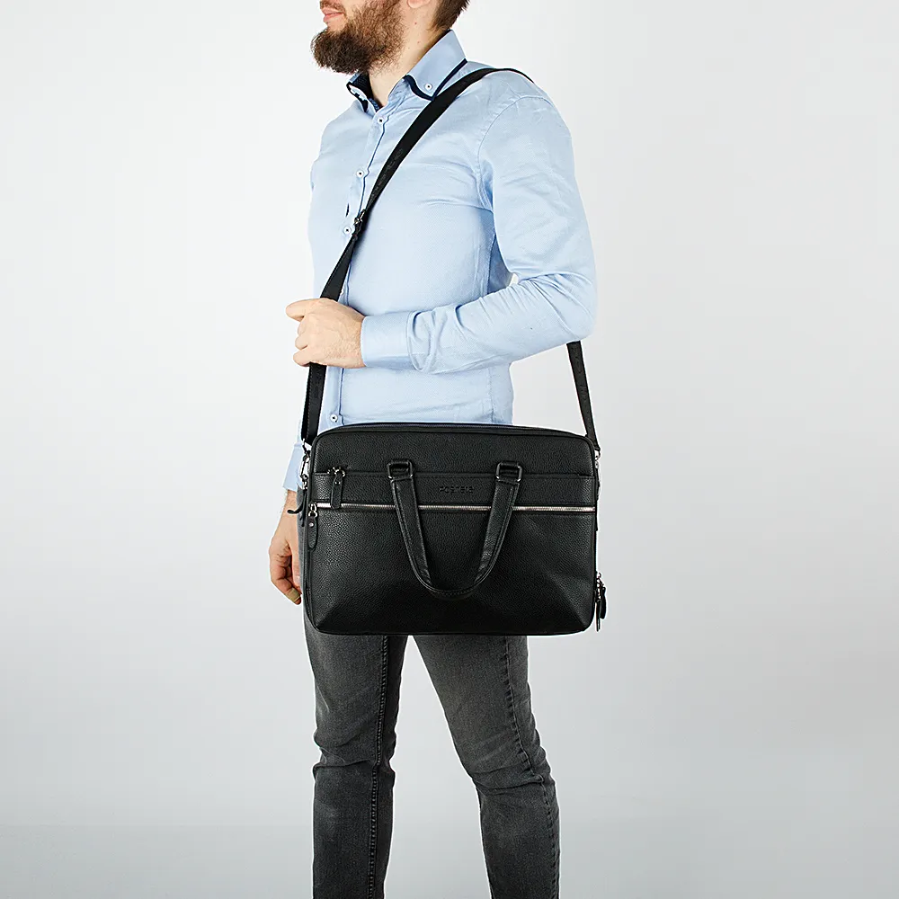 Сумка деловая с отсеком для ноутбука представлена брендом Poshete, выполнена в чёрном цвете из искусственной кожи с текстильной подкладкой. Сумка с двумя отделениями на молниях, снаружи два кармана на молниях и две ручки для переноски, в комплекте предусмотрен плечевой ремень.