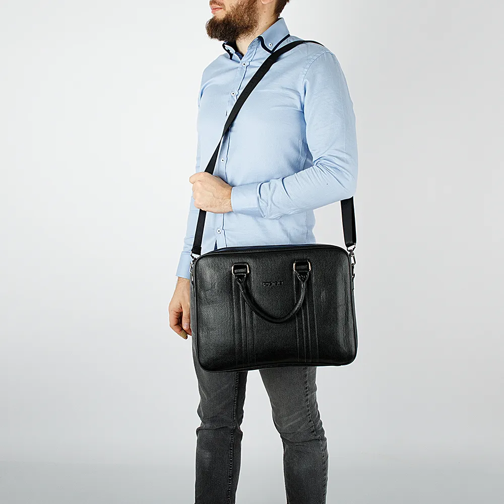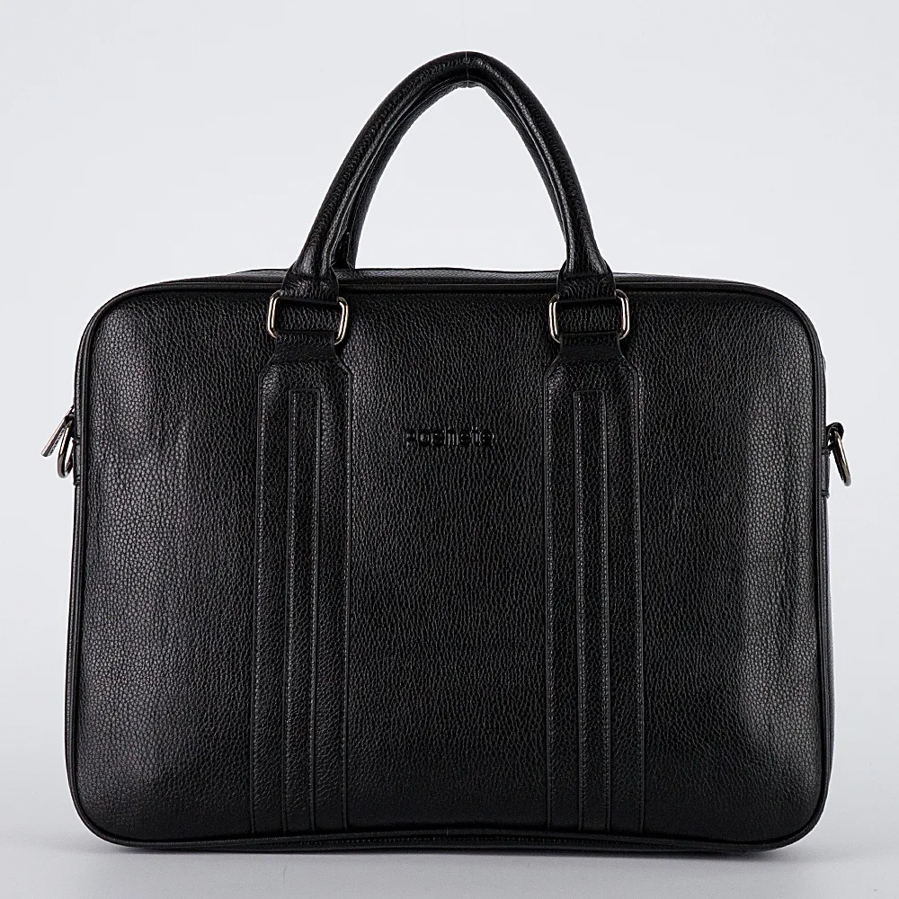 Сумка предназначена для ноутбука, имеет крепкие ручки, молния основного отделения заходит на бока, сзади карман на вертикальной молнии. Модель имеет толщину и держит форму. Представлена брендом Poshete и выполнена из искусственной фактурной кожи. Также туда поместится папка с документами.