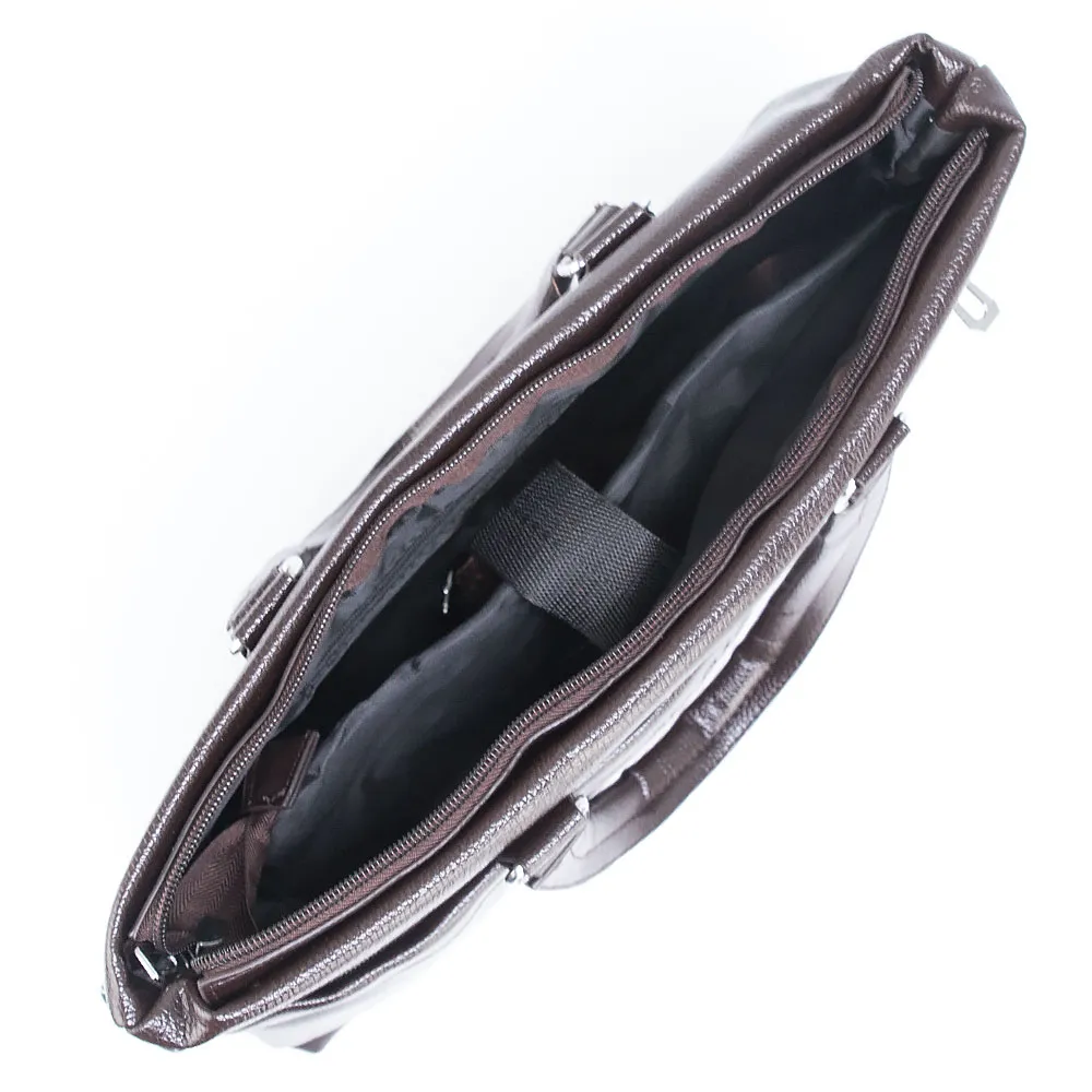 Сумка от торговой марки Mr.Bag из искусственной кожи коричневого цвета. Модель с двумя ручками и съемным регулируемым плечевым ремнем, выполненным из текстильного материала. Отделение на молнии. Внутри: текстильная подкладка, карман на молнии, накладной карман с уплотненной стенкой для ноутбука. На лицевой и задней сторонах – карман на молнии. Размер подходит под документы формата А4.