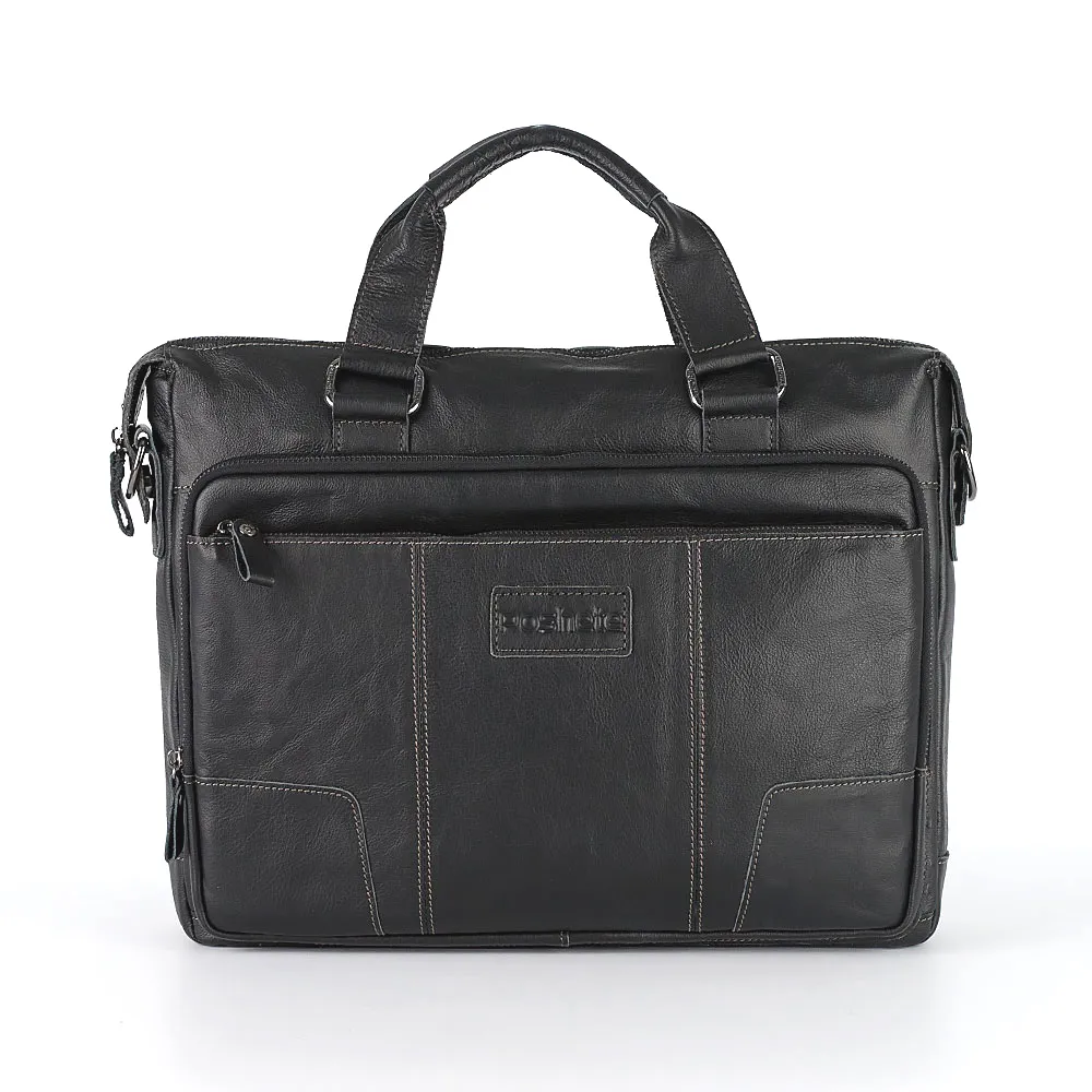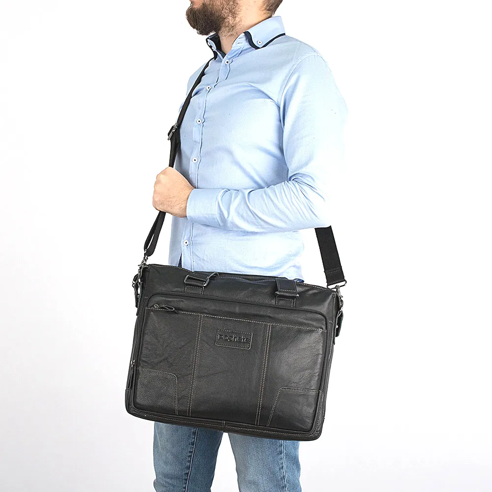 Мужская сумка под ноутбук от торговой марки Poshete выполнена из натуральной кожи черного цвета. Модель с двумя ручками и съемным регулируемым плечевым ремнем. Отделение на молнии, которая по бокам фиксируется магнитами. Внутри: подкладка, отсек для ноутбука, закрывающийся ремешком на кнопке, карман на молнии. На лицевой стороне – два кармана на молнии, на задней – карман на молнии.