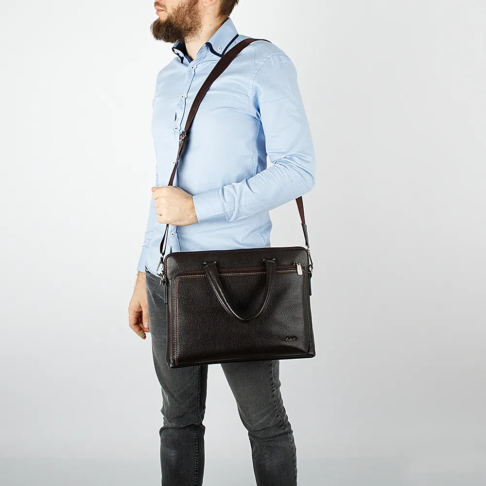 Современная мужская сумка-портфель Poshete выполнена в тёмно-коричневом цвете из мягкой и фактурной искусственной кожи. Модель в деловом стиле. Сзади прорезной карман на молнии. Спереди накладной карман на молнии, которая расстёгивается по двум сторонам. Основное отделение на молнии, внутри три дополнительных кармашка и отсек на липучке для ноутбука. Сумка имеет две эргономичные ручки и плечевой текстильный ремень, съёмный, регулируемый.