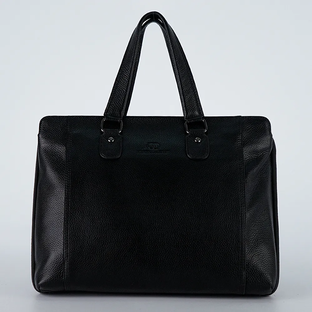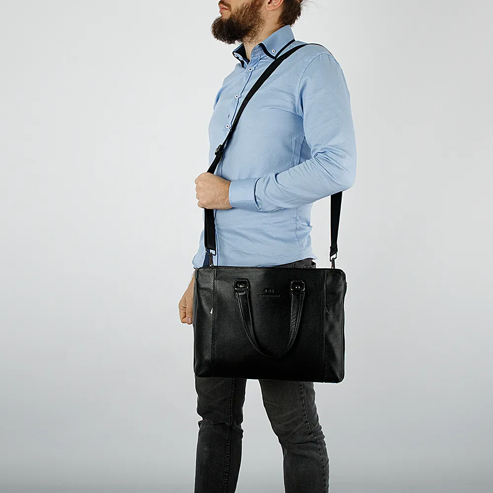 Деловая сумка от бренда Francesco Molinary выполнена из натуральной кожи с качеством и элегантностью. Модель чёрного цвета, прямоугольной формы. Снаружи карман на скрытой молнии и две короткие ручки, в комплекте есть плечевой ремень. Сумка с тремя независимыми отделениями на молниях, внутри текстильная подкладка и кармашки. Средняя часть широко распахивается, благодаря молнии по трём сторонам. Практичная, хорошо подойдёт для ноутбука и документов.