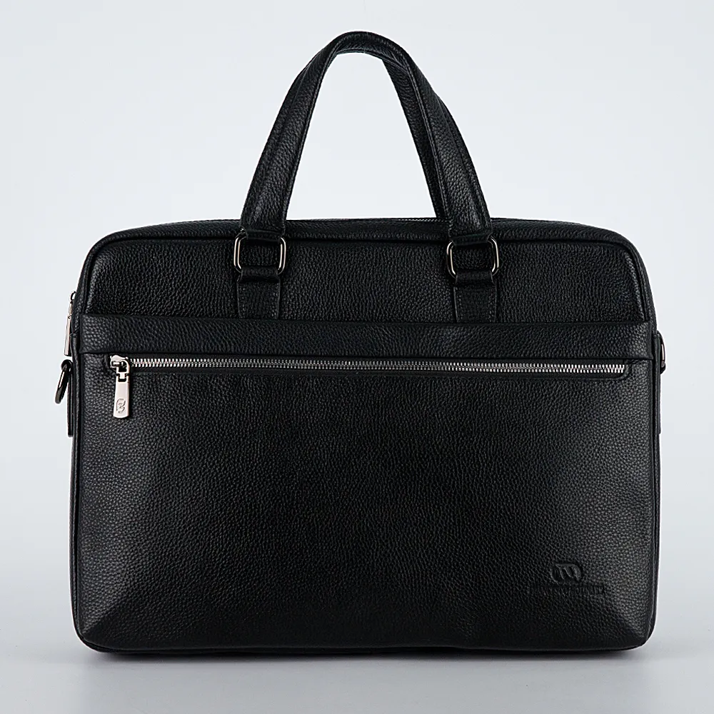 Деловая сумка от торговой марки Francesco Molinary из натуральной кожи черного цвета. Модель с двумя ручками и съемным регулируемым плечевым ремнем. Два отделения на молнии с фирменной подкладкой. В основном отделении: карман на молнии, карман для ноутбука с уплотненной стенкой. На лицевой стороне – два кармана на молнии. На задней – карман на молнии.