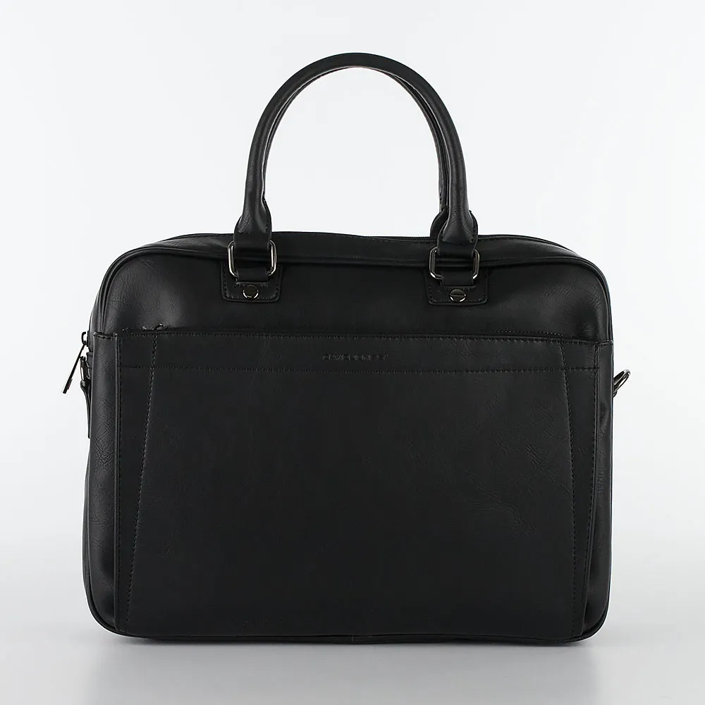 Стильная деловая сумка от бренда David Jones выполнена из искусственной кожи черного цвета с эффектом «пулл-ап». Модель прямоугольной закругленной формы, с двумя короткими ручками на кольцах-держателях, со съемным регулируемым плечевым ремнем. Отделение на молнии, с текстильной подкладкой. Внутри: отделение под ноутбук на липучке, два накладных кармана. На передней стороне – накладной карман на молнии, на задней – карман на молнии.