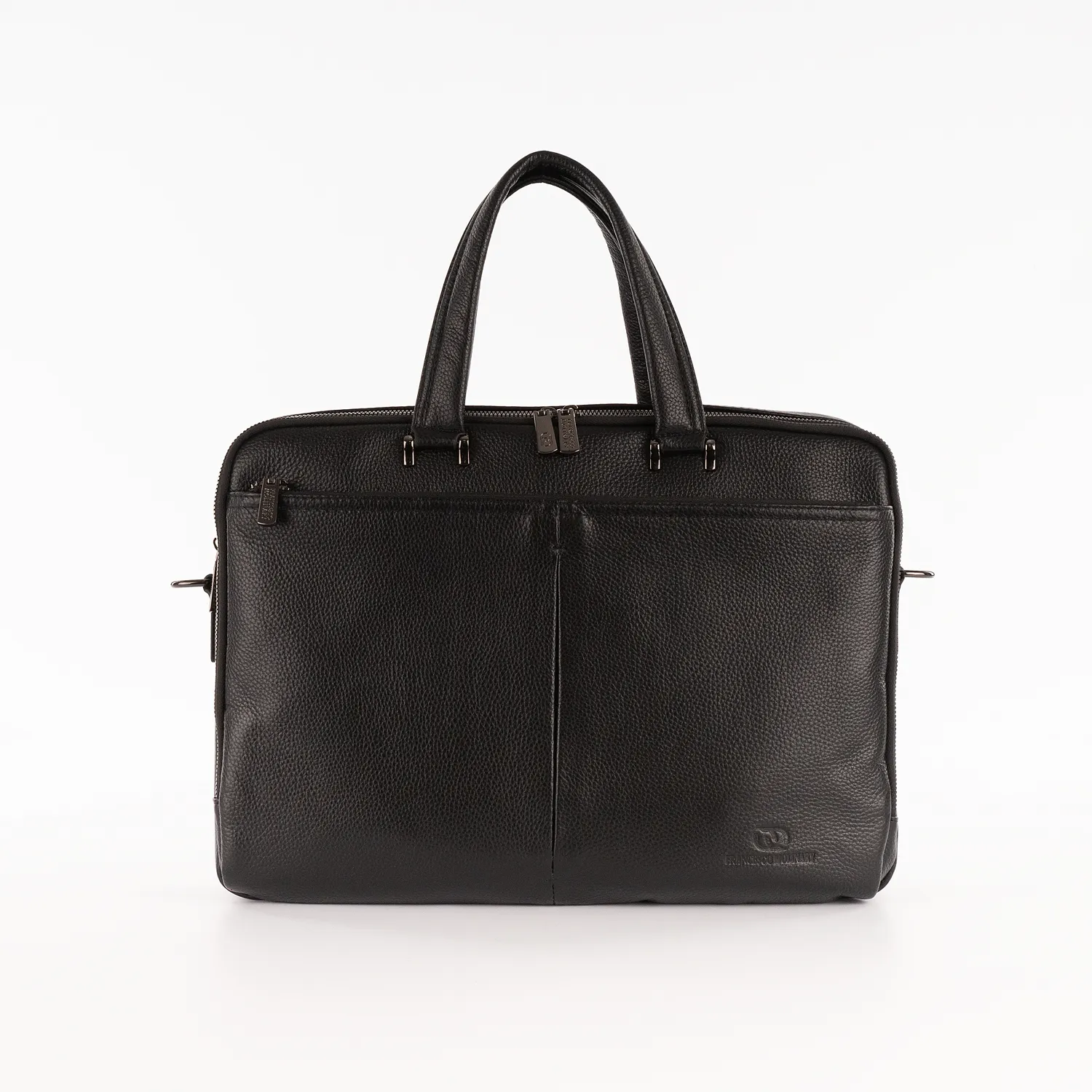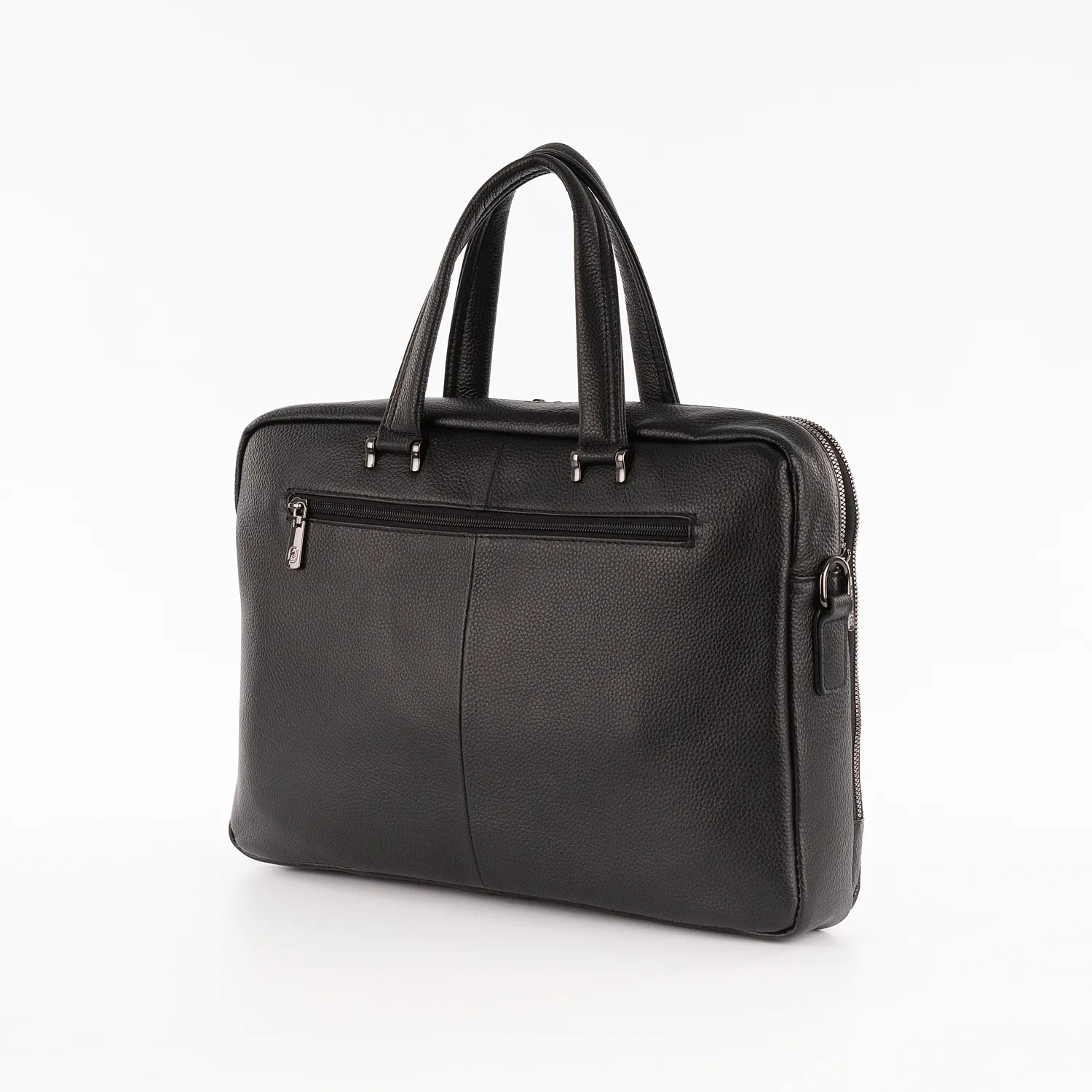 Сумка от торговой марки Francesco Molinary из натуральной кожи черного цвета. Модель с двумя ручками и съемным регулируемым плечевым ремнем, выполненным из текстильного материала. Два отделения на молнии, с фирменной подкладкой. Переднее отделение широко раскрывается благодаря молнии по трем сторонам. В заднем – карман на молнии, два накладных кармана, накладной карман с уплотненной стенкой для ноутбука. На лицевой и задней сторонах – карман на молнии.