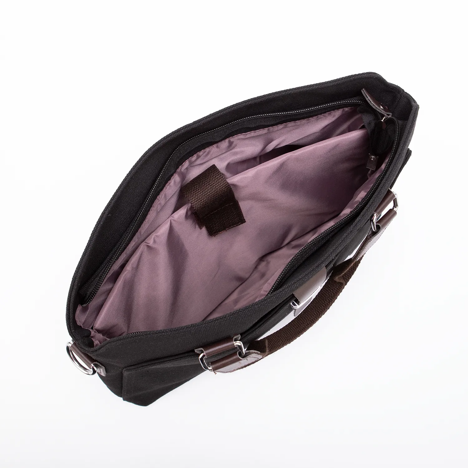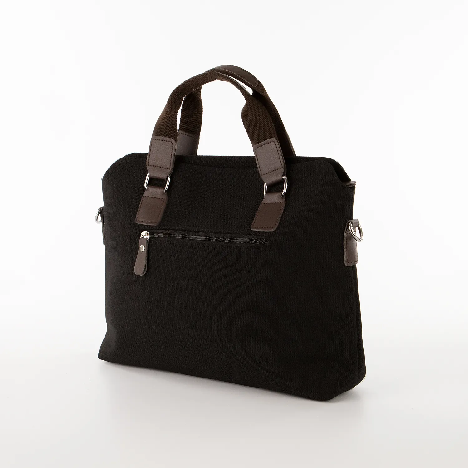 Сумка от торговой марки Ecotope из плотной брезентовой ткани черного цвета и искусственной кожи коричневого цвета. Модель с двумя ручками и съемным регулируемым плечевым ремнем. Отделение на молнии. Внутри: текстильная подкладка, накладной карман с уплотненной стенкой, карман на молнии и два накладных кармана. На лицевой стороне – накладной карман с хлястиком. На задней стороне – карман на молнии.