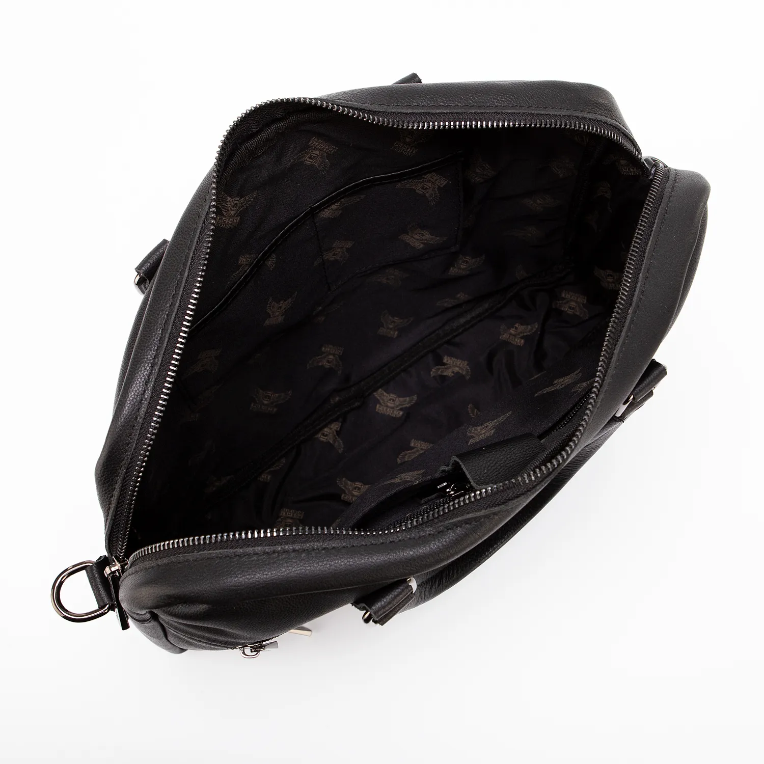 Сумка от торговой марки Poshete из натуральной кожи черного цвета. Модель с двумя ручками и съемным плечевым ремнем. Отделение на молнии. Внутри: фирменная подкладка, накладной карман с уплотненной стенкой для ноутбука, карман на молнии. На задней стороне – карман на молнии, который также можно использовать в качестве лямки для крепления на выдвижную ручку чемодана, расстегнув нижнюю молнию.