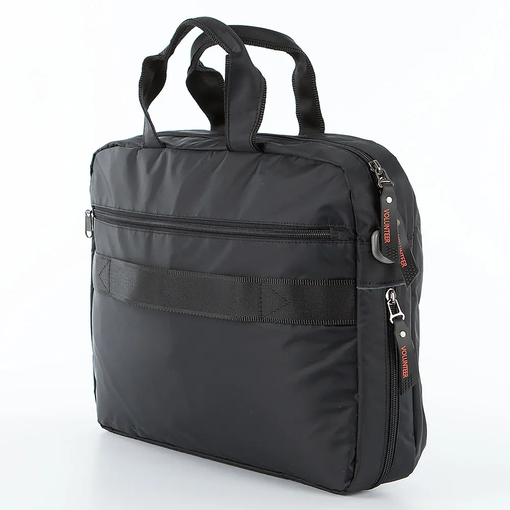 Сумка от торговой марки Volunteer из практичного текстильного материала черного цвета. Модель с двумя ручками и съемным регулируемым плечевым ремнем. Отделение на молнии. Внутри: текстильная подкладка, накладной карман с уплотненной стенкой для ноутбука, органайзер, карман на молнии. На лицевой стороне – два кармана на молнии, кольцо для крепления. На задней стороне – карман на молнии, лямка для крепления на выдвижную ручку чемодана. В нижней части имеется раздвижка на молнии для увеличения объема.