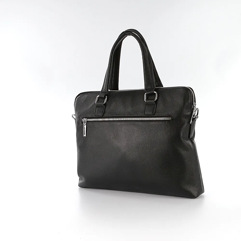 Сумка от торговой марки Poshete из натуральной кожи черного цвета. Плоская модель с двумя ручками и съемным регулируемым плечевым ремнем, выполненным из текстильного материала. Отделение на молнии. Внутри: фирменная подкладка, карман на молнии, два накладных кармана, карман с уплотненной стенкой для ноутбука. На задней стороне – карман на молнии. Размер подходит для документов формата А4.