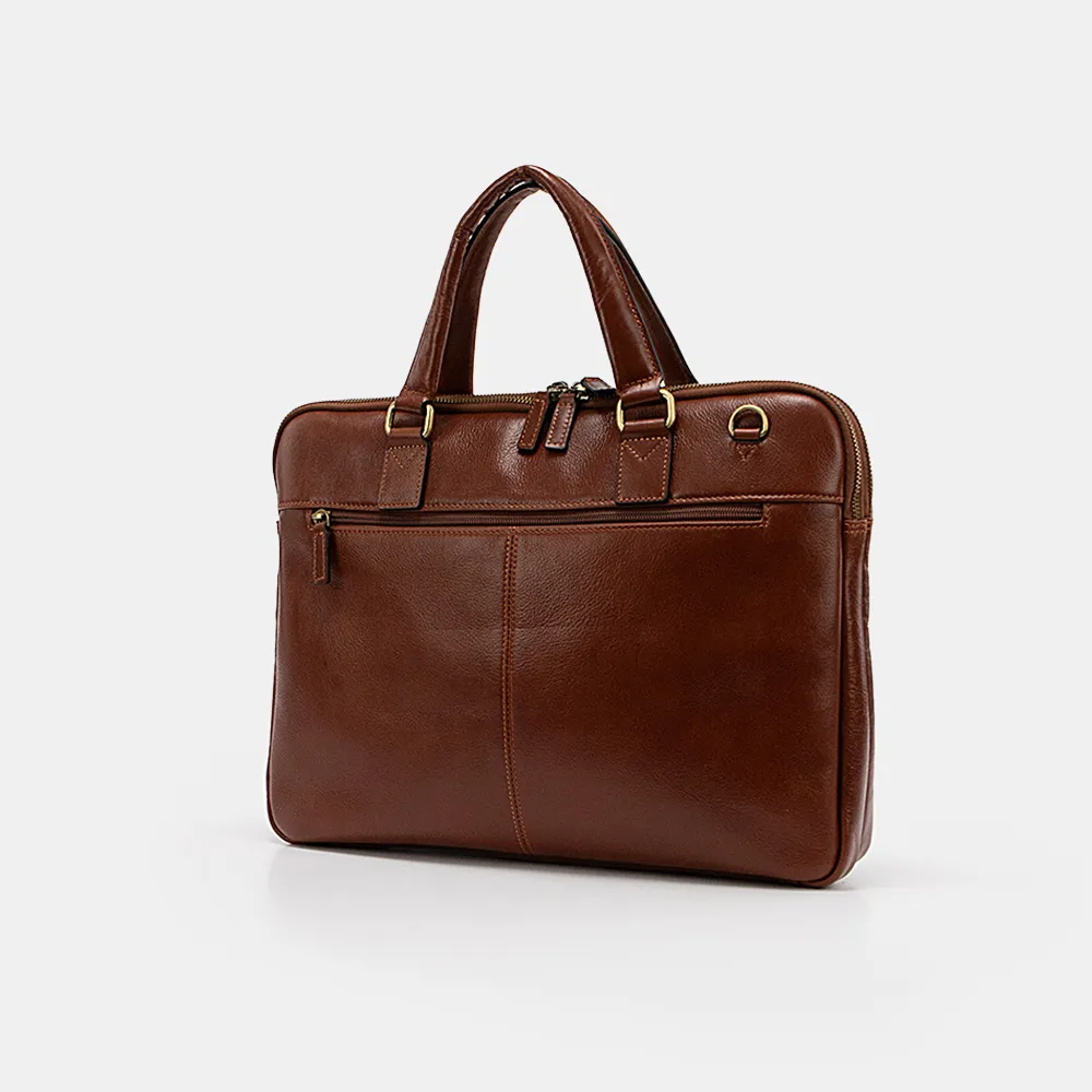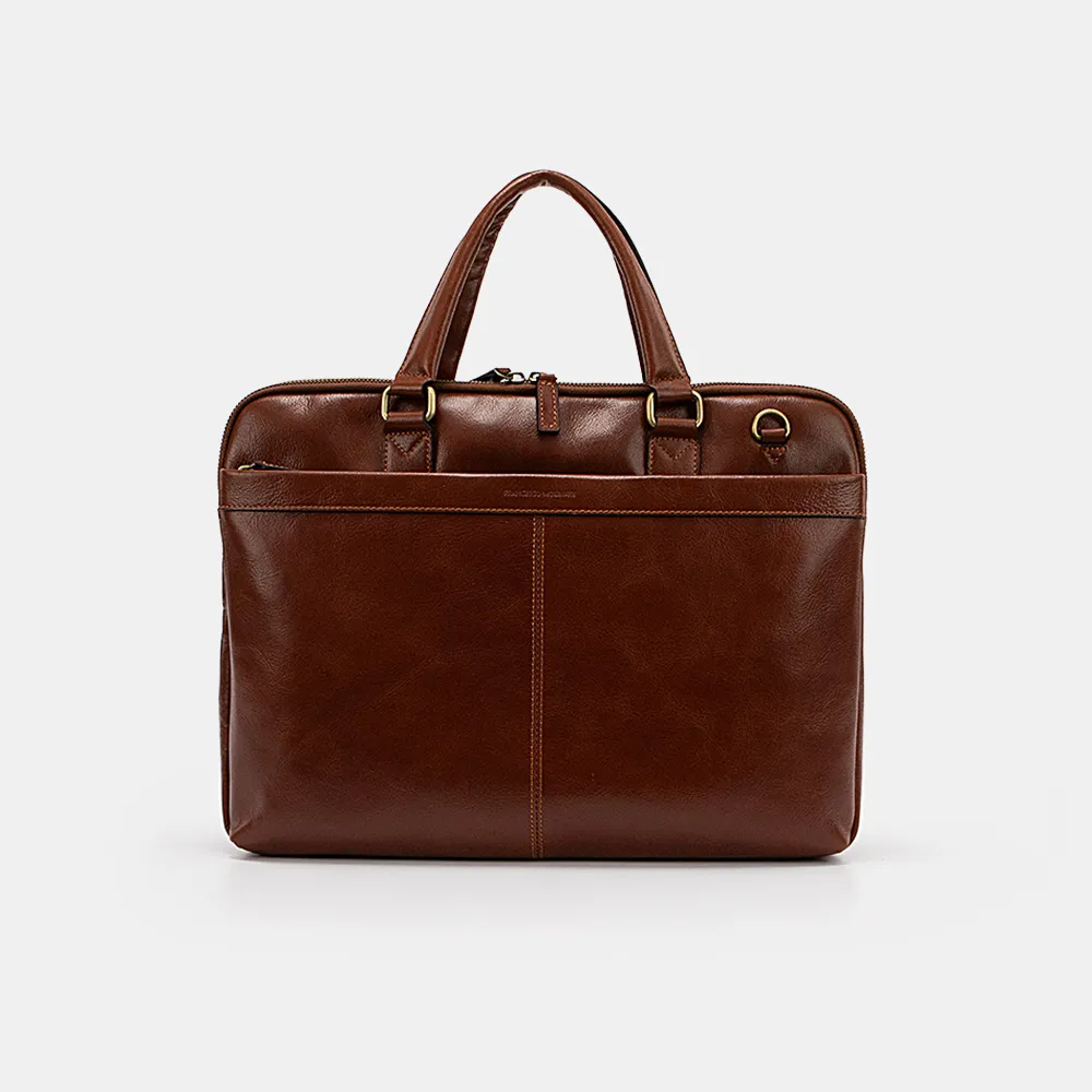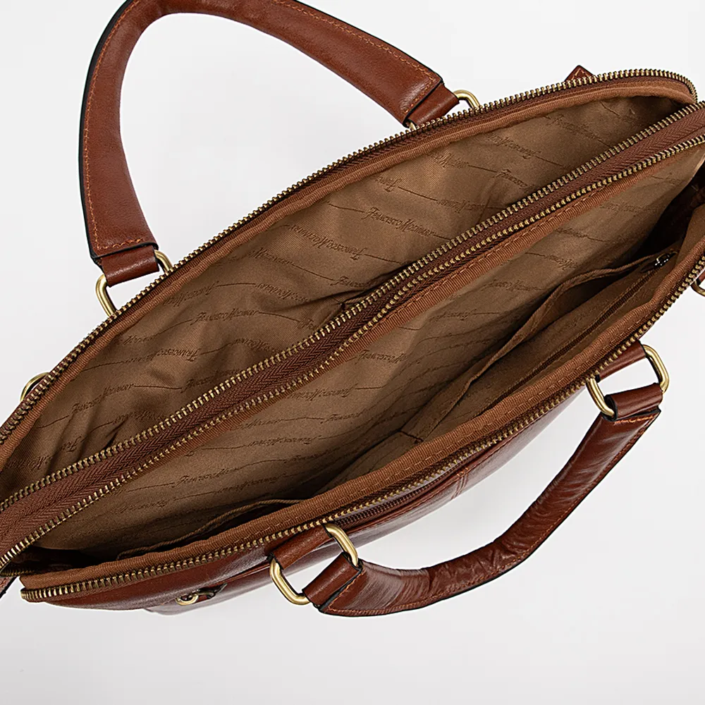 Сумка от торговой марки Francesco Molinary из натуральной кожи коричневого цвета. Вместительная модель с двумя ручками и широким съемным регулируемым плечевым ремнем, выполненным из текстильного материала. Два отделения на молнии, с фирменной подкладкой. В переднем – карман на молнии, два накладных кармана, в заднем – накладной карман с уплотненной стенкой для ноутбука, два накладных кармана. На лицевой стороне – карман на молнии. На задней стороне – карман на молнии; внутри имеется лямка для крепления на выдвижную ручку чемодана.