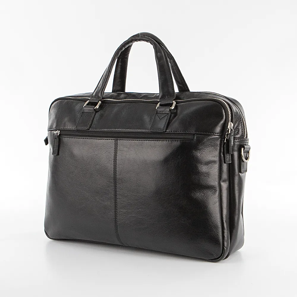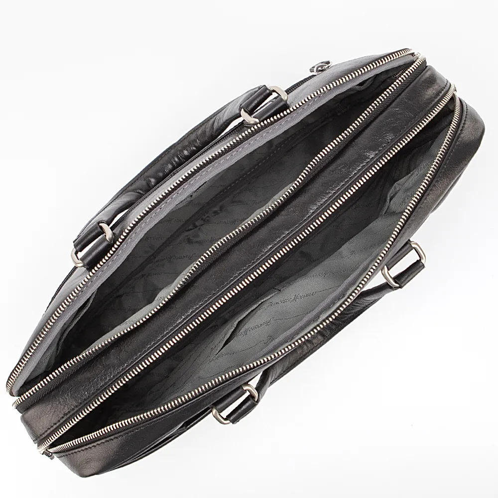 Мужская сумка от торговой марки Francesco Molinary из натуральной кожи черного цвета. Вместительная модель с двумя ручками и широким съемным регулируемым плечевым ремнем, выполненным из текстильного материала. Два отделения на молнии, с фирменной подкладкой. В основном отделении – два накладных кармана, карман на молнии. В заднем отделении – два накладных кармана. На лицевой и задней сторонах – карман на молнии; в заднем кармане имеется лямка для крепления на выдвижную ручку чемодана. На дне имеются нашивки для защиты от износа.