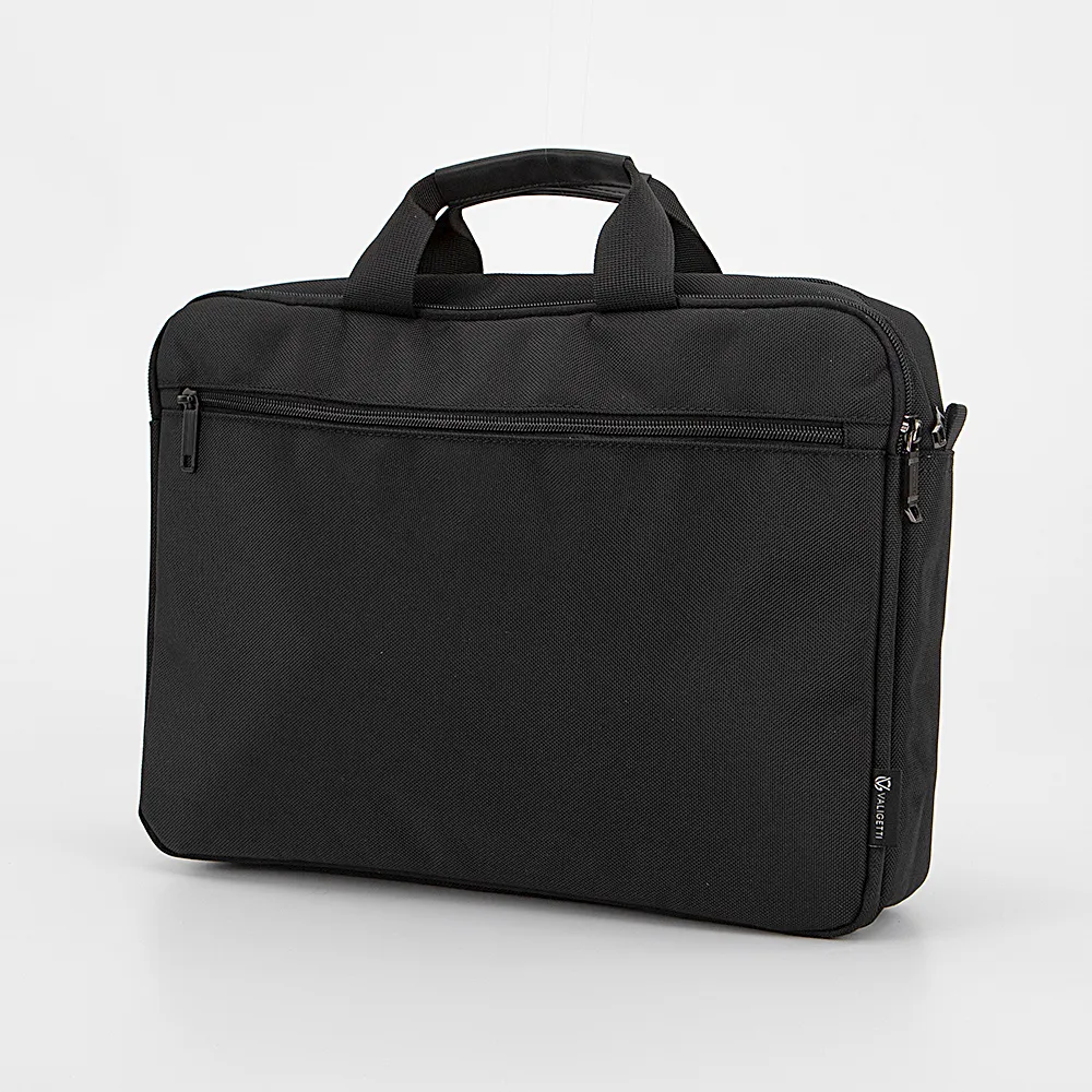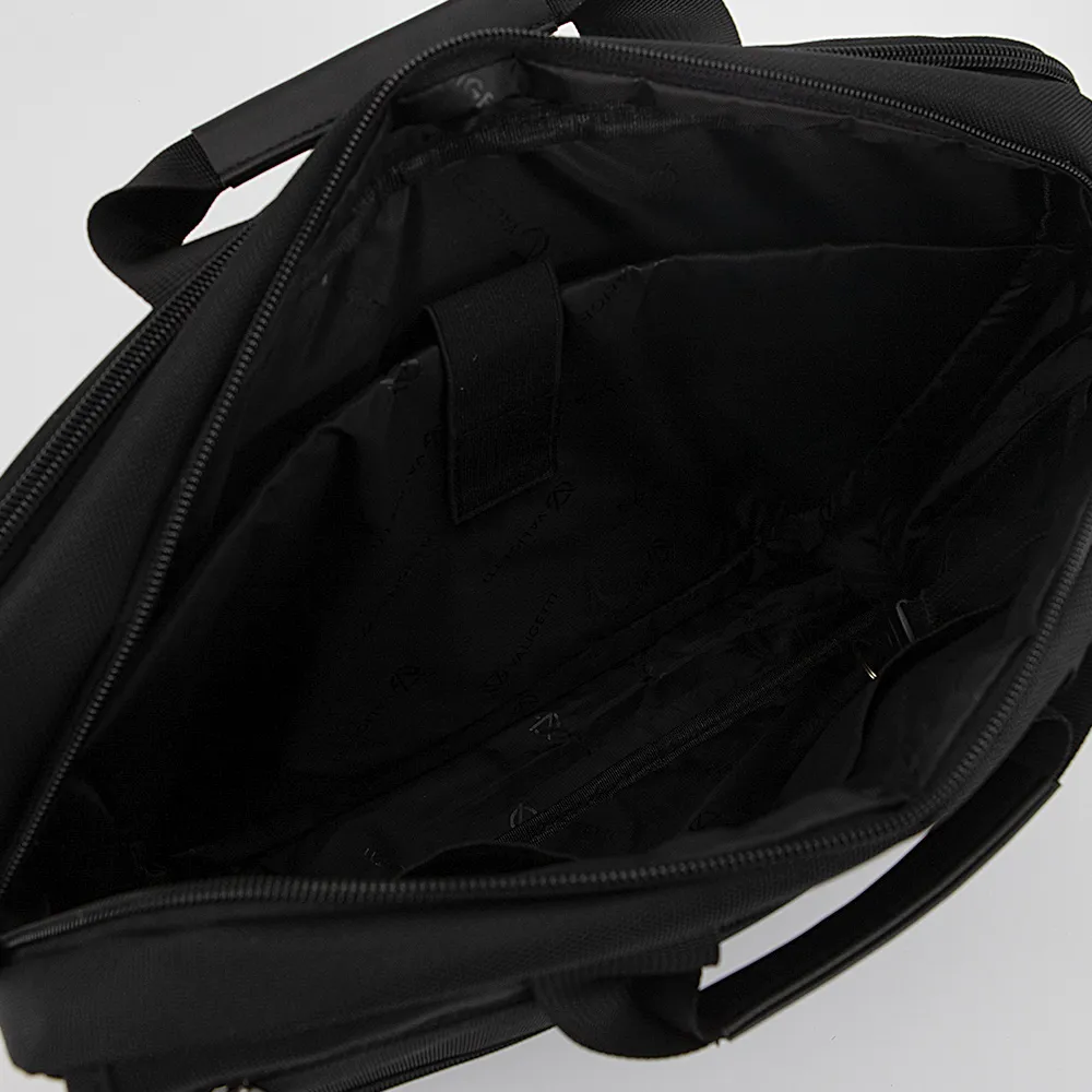 Сумка от торговой марки Valigetti из прочной текстильной ткани черного цвета. Модель с двумя ручками и съемным регулируемым плечевым ремнем с наплечником. Два отделения на молнии, с текстильной подкладкой. В переднем отделении: накладной карман с уплотненной стенкой для ноутбука, органайзер, крепление для ключей. На лицевой стороне – два кармана на молнии, накладной карман с клапаном на липучке. На задней стороне – карман на молнии. Размер подходит для документов формата А4.