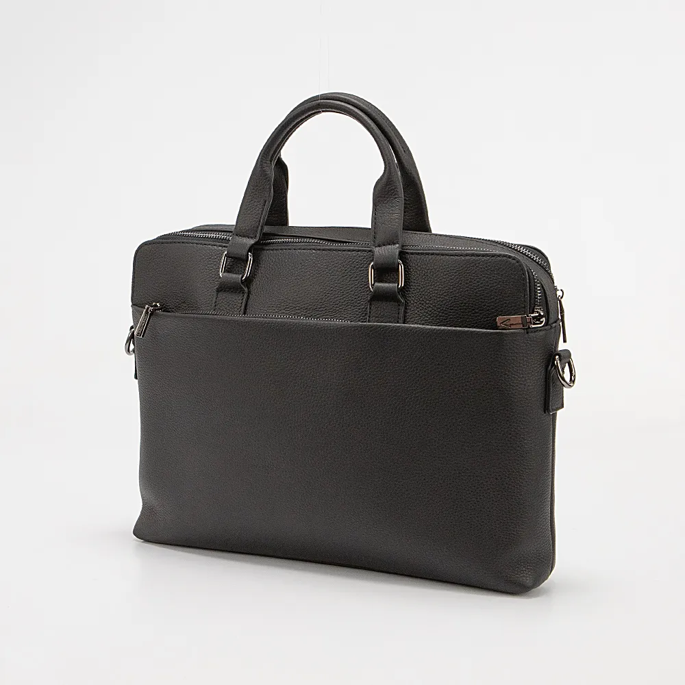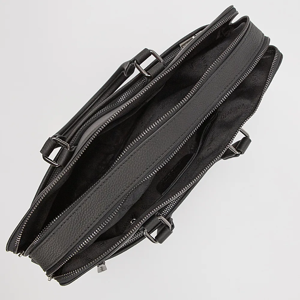 Деловая сумка от торговой марки Valigetti из натуральной кожи черного цвета. Модель с двумя ручками и съемным регулируемым плечевым ремнем, выполненным из текстильного материала. Два отделения на молнии, с текстильной подкладкой. В заднем отделении – карман на молнии. В переднем – накладной карман. На лицевой и задней сторонах – вместительные карманы на молнии.