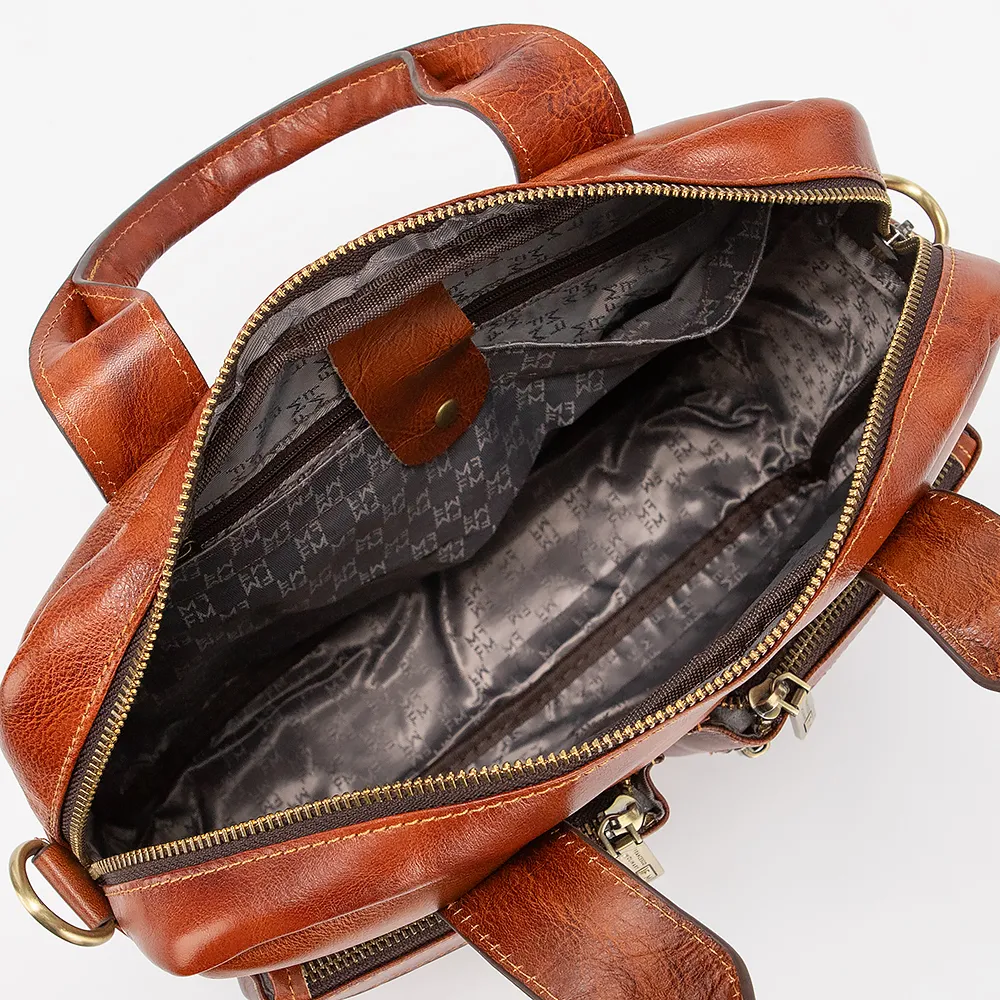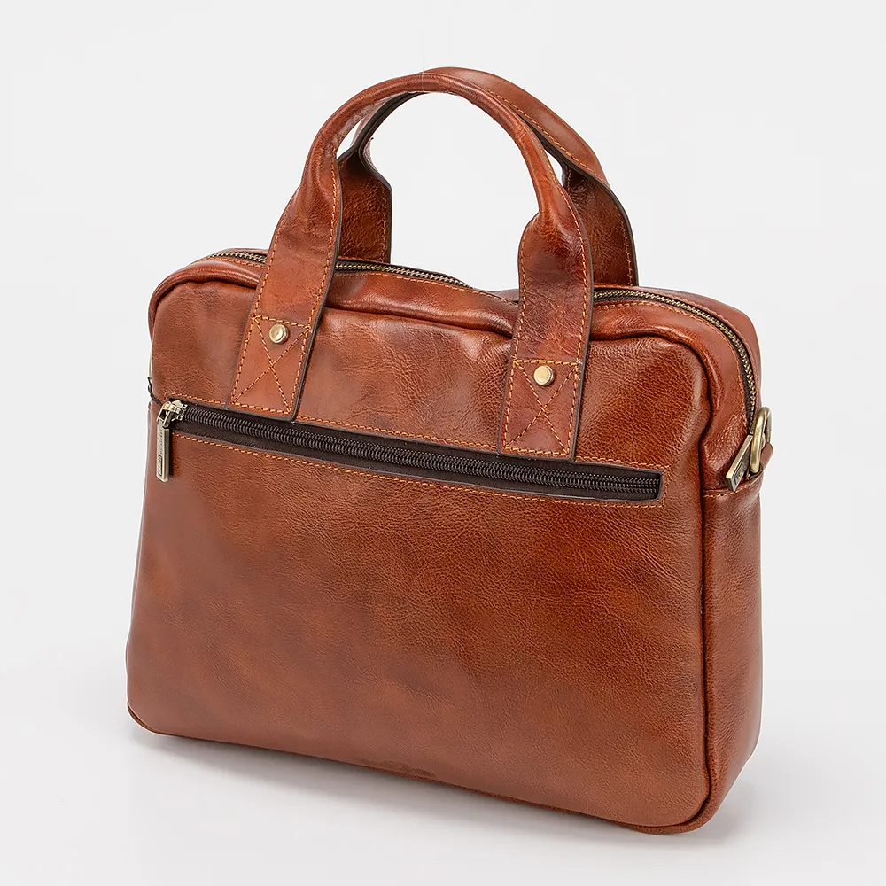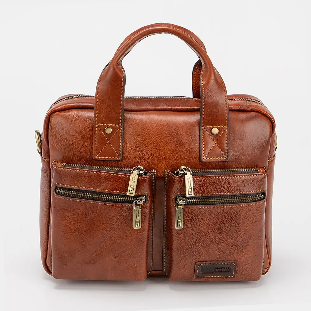 Деловая сумка от торговой марки Francesco Molinary из натуральной кожи коричневого цвета. Функциональная вместительная модель с двумя плотными ручками, съемным регулируемым плечевым ремнем, выполненным из текстильного материала. Одно отделение на молнии с фирменной подкладкой. Внутри - накладной карман на молнии и карман на кнопке. На лицевой стороне - 4 кармана на молнии. На задней стороне – карман на молнии. Дно оснащено накладками для защиты от износа.