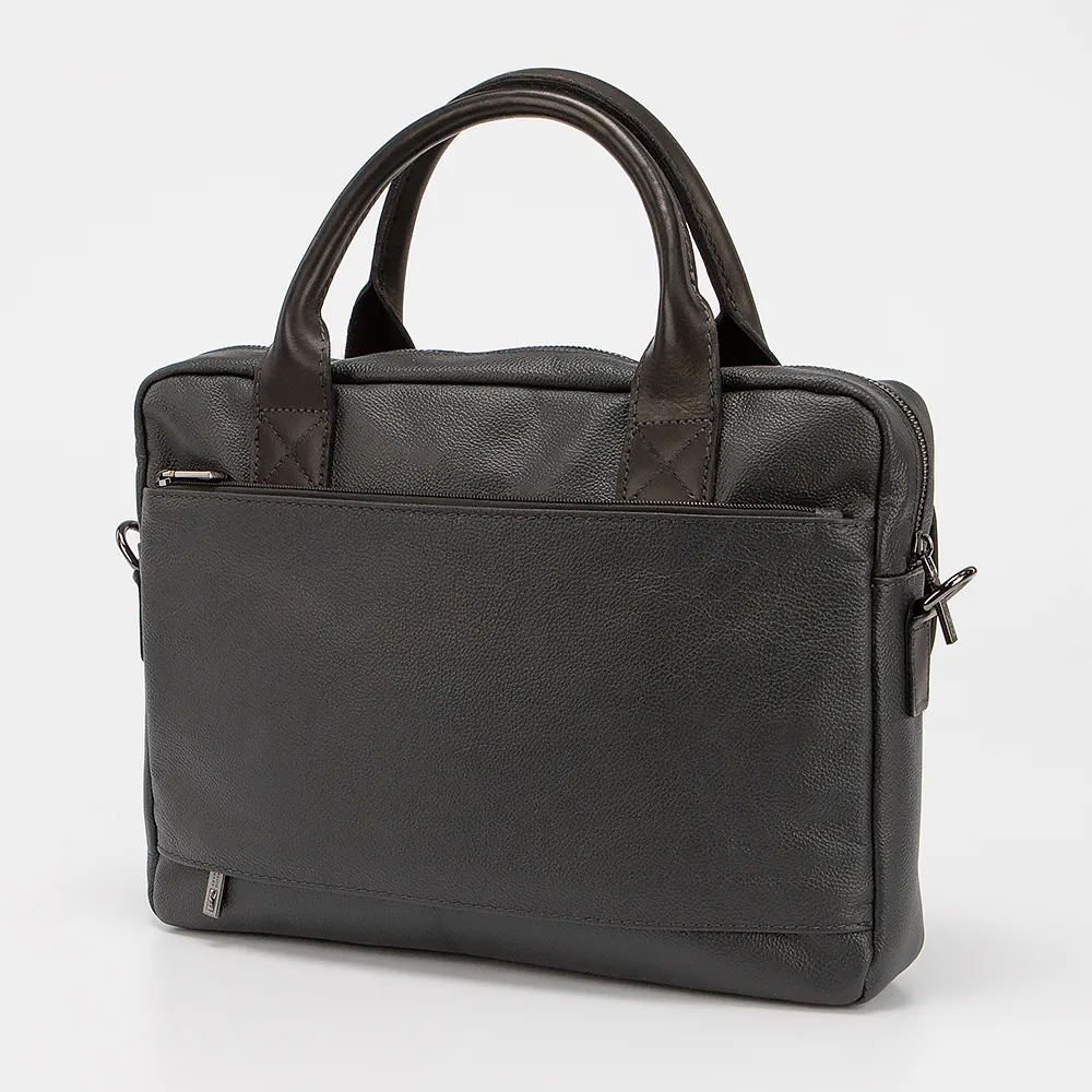 Сумка от торговой марки Francesco Molinary из натуральной кожи черного цвета. Модель с двумя ручками и съемным регулируемым плечевым ремнем. Отеление на молнии, внутри фирменная подкладка, накладной карман, карман на молнии и отделение для ноутбука с хлястиком на кнопке. На лицевой стороне два накладных кармана на магнитной кнопке. На задней стороне - карман на молнии, который можно использовать как лямку для крепления на ручку чемодана.