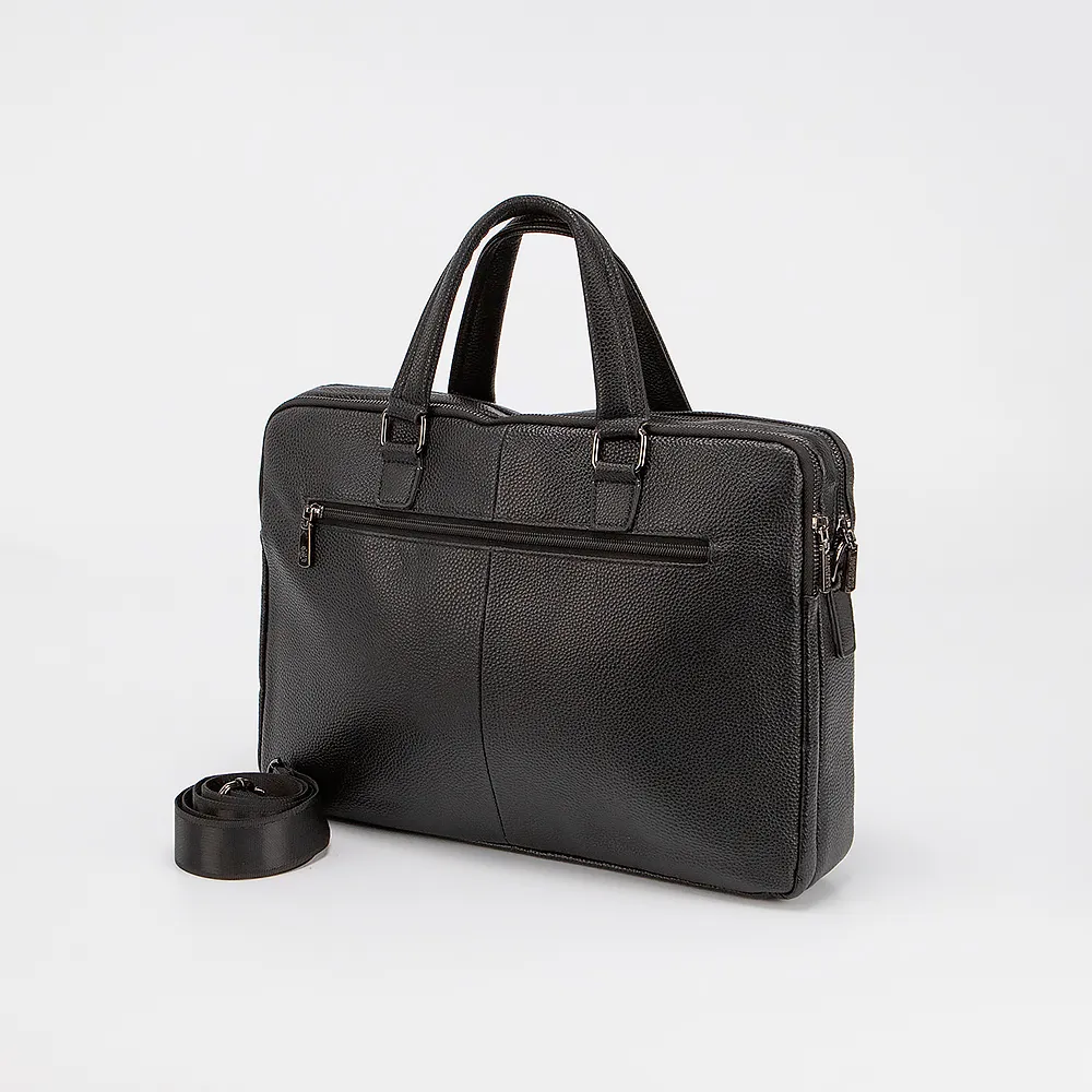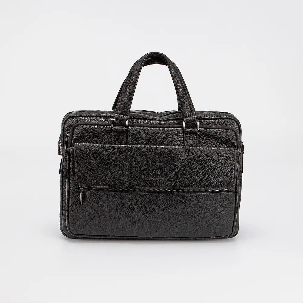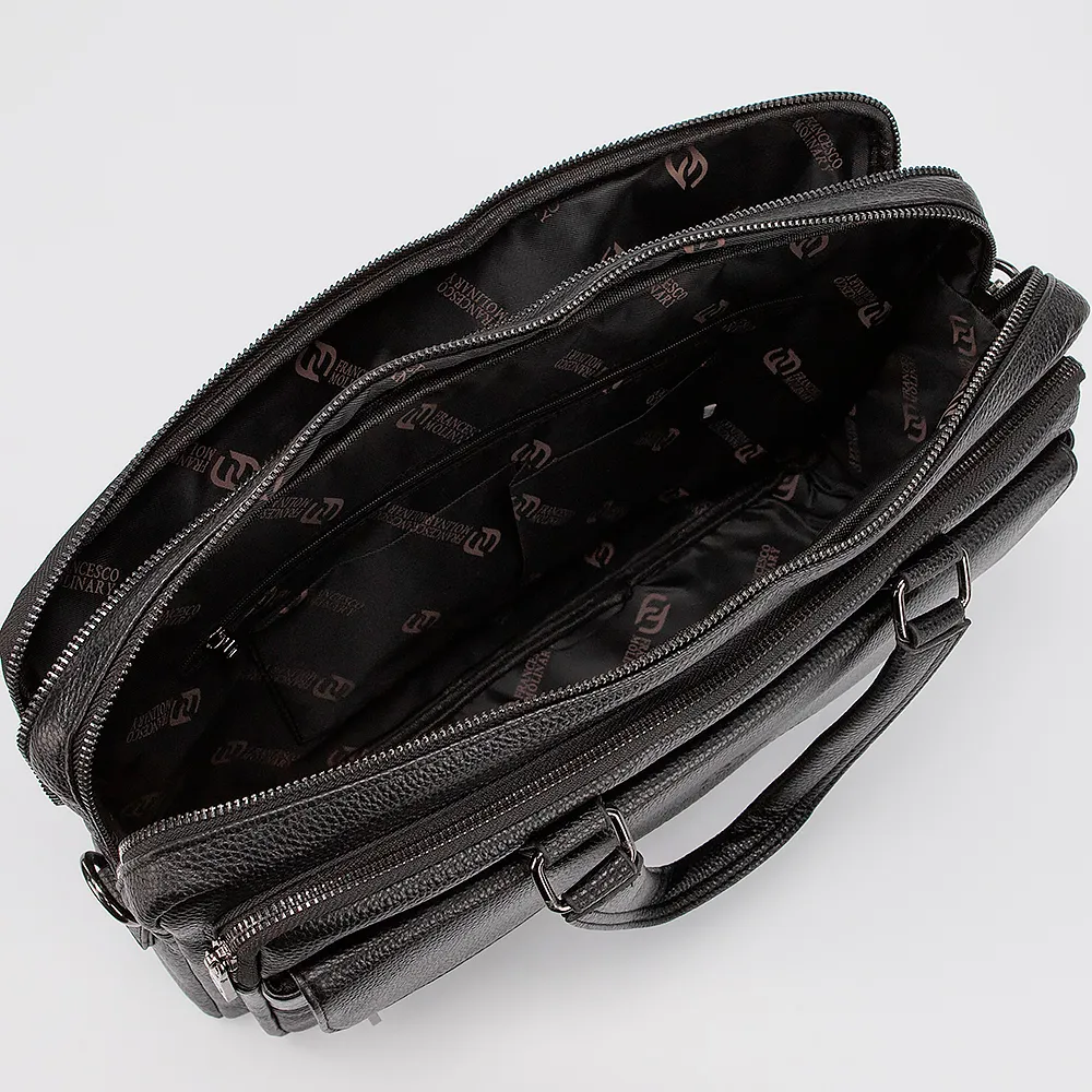 Сумка от торговой марки Francesco Molinary выполнена из натуральной зернистой кожи черного цвета. Модель с двумя ручками и съемным регулируемым плечевым ремнем из текстильного материала. Два отделения на молнии. Внутри: фирменная текстильная подкладка, карман на молнии, накладные карманы. На лицевой стороне - два кармана на молнии и накладной карман с клапаном. На задней стороне - карман на молнии.