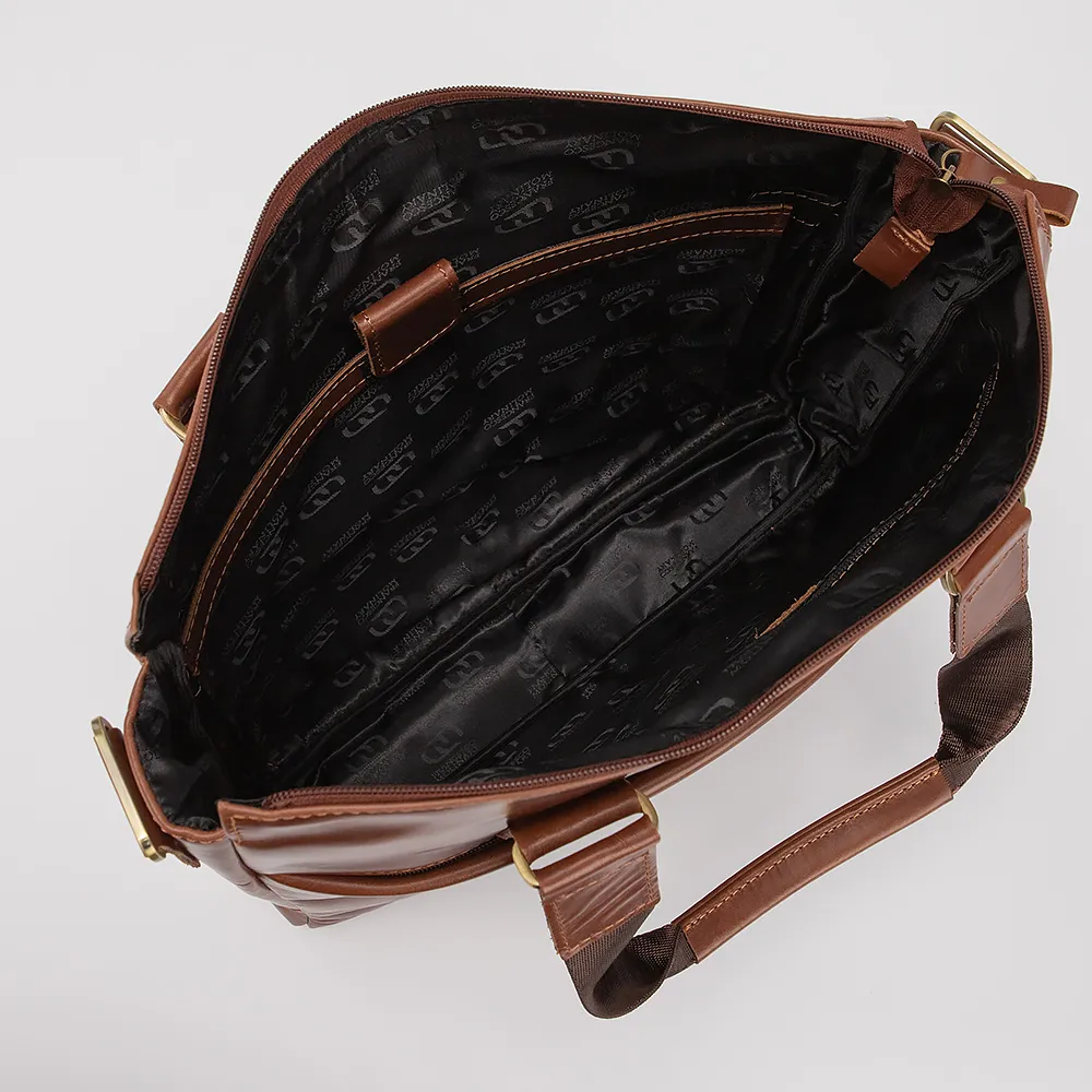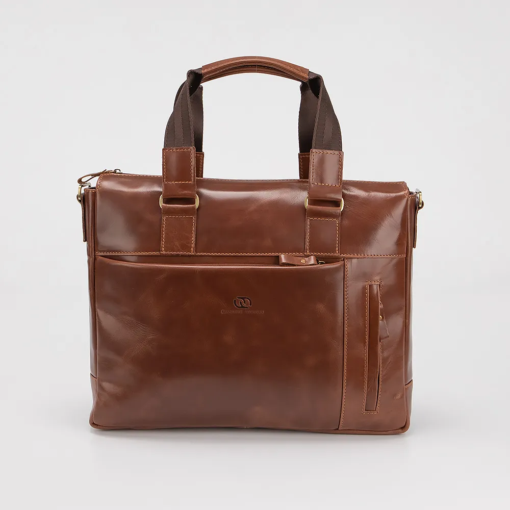Сумка от торговой марки Francesco Molinary из натуральной гладкой кожи коричневого цвета. Функциональная вместительная модель с двумя ручками и съемным регулируемым плечевым ремнем с кожаным наплечником. Отделение на молнии, с фирменной подкладкой. Внутри - накладной карман с уплотненной стенкой для ноутбука. На лицевой стороне - два кармана на молнии. На задней стороне - карман на молнии.
