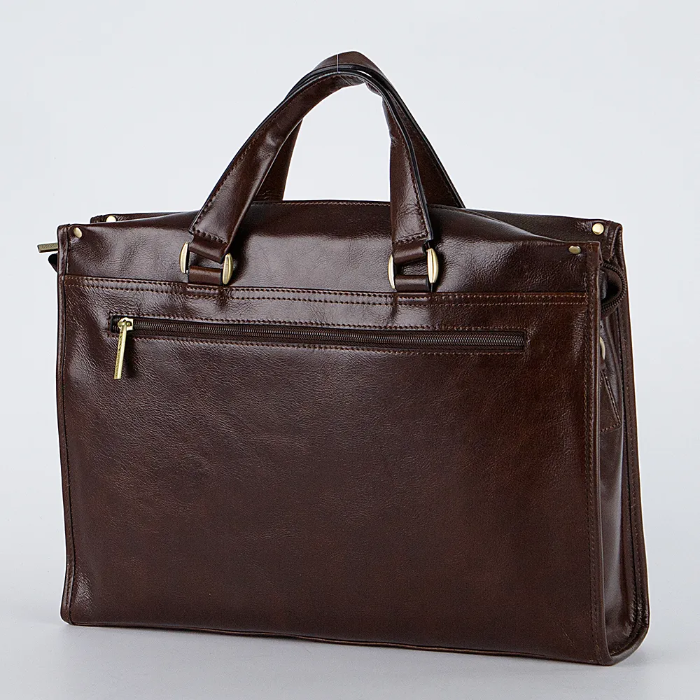 Деловая сумка-портфель от бренда Francesco Molinary из натуральной гладкой кожи. Модель с двумя отделениями под молнией с двойным ходом, внутри карман на молнии, два накладных кармана под телефон и канцелярские принадлежности. Снаружи накладной карман под крышкой на магните и прорезной карман под молнией. Дно портфеля снабжено металлическими ножками для защиты от износа. К модели прилагается съемный регулируемый плечевой ремень с кожаной вставкой.
