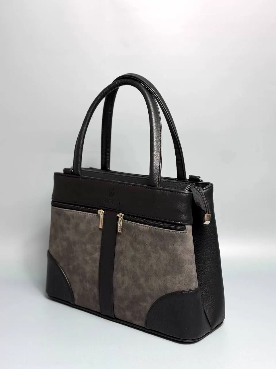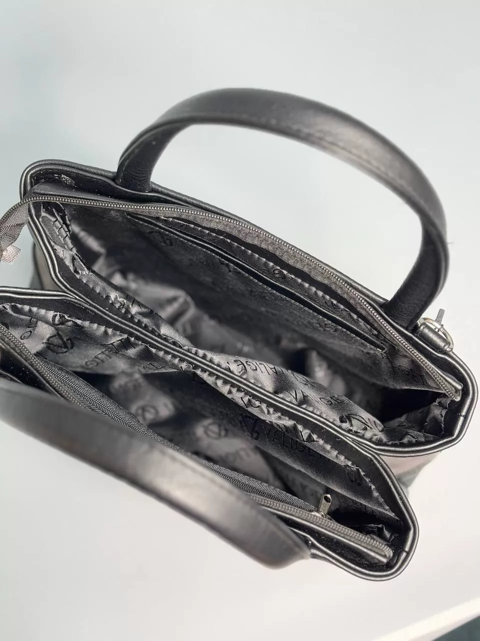 Сумочка имеет два основных отделения, внутри которых находятся три кармана: открытый накладной карман, карман на молнии и ещё один накладной карман, тоже на молнии.