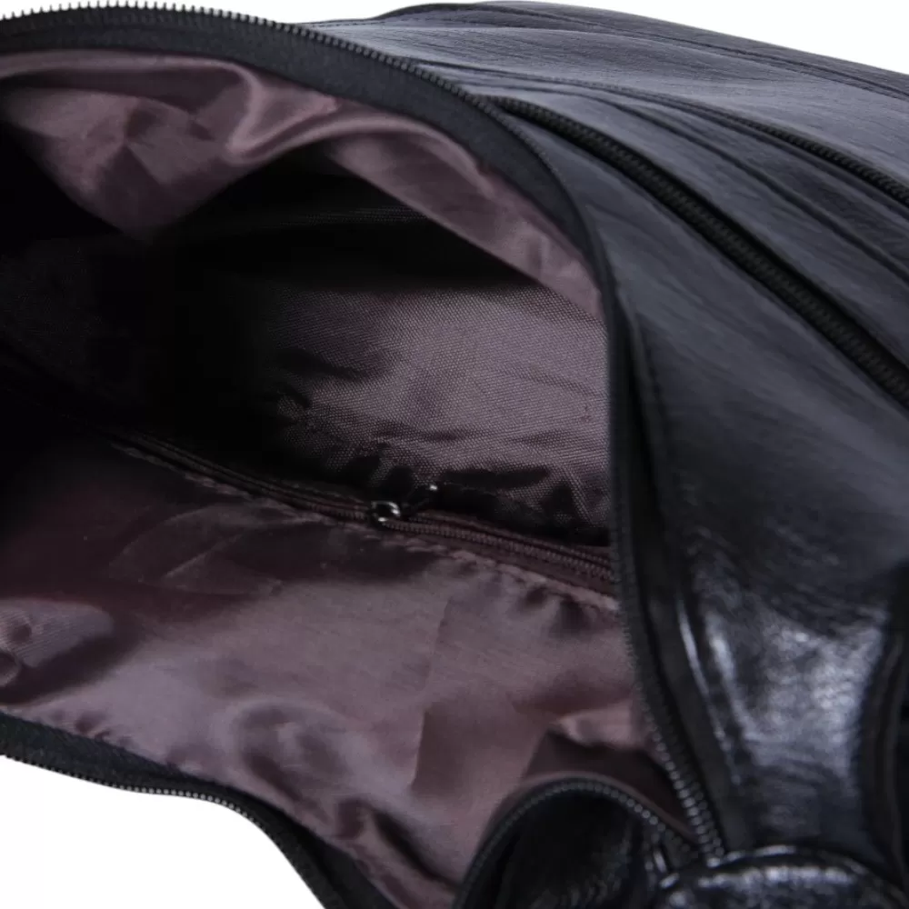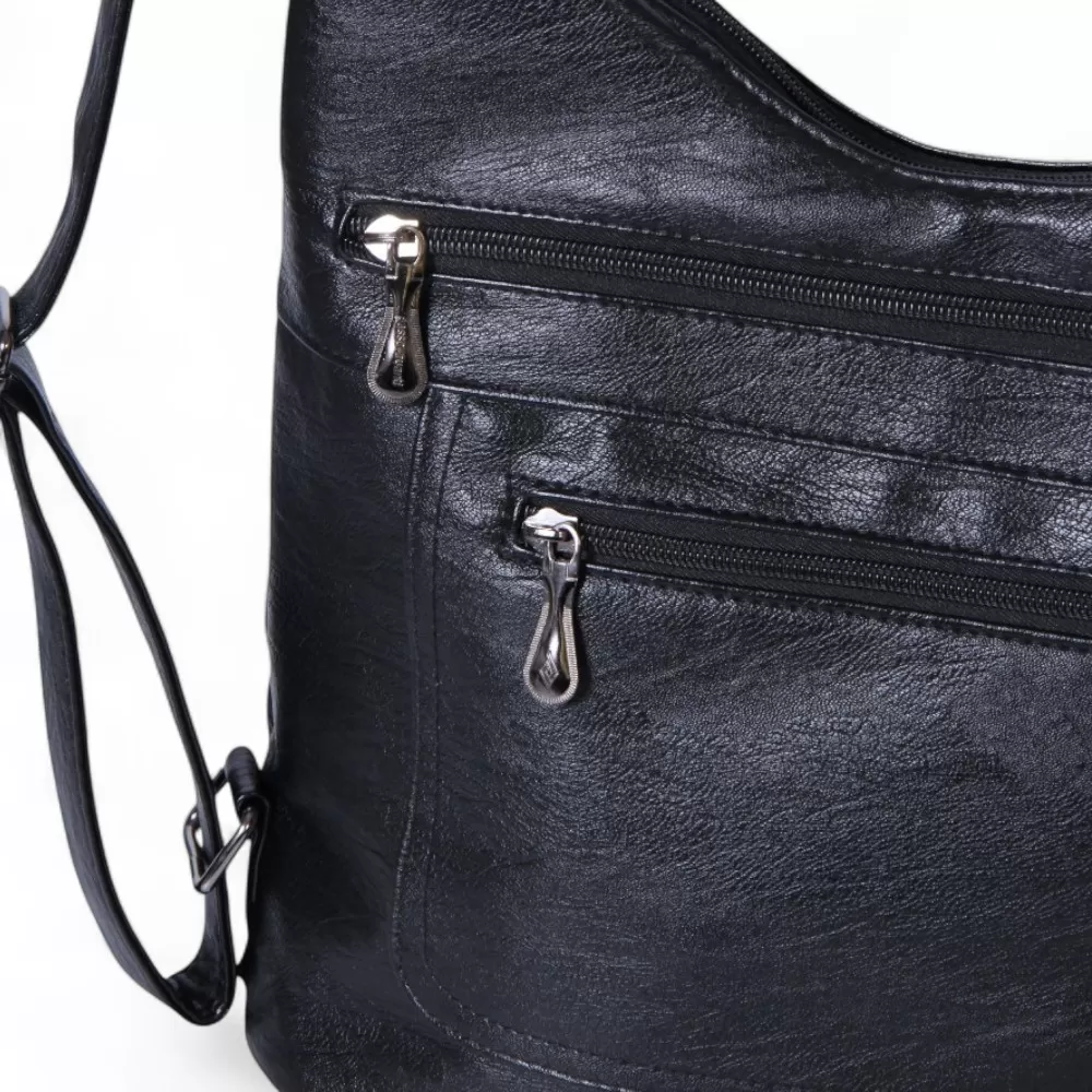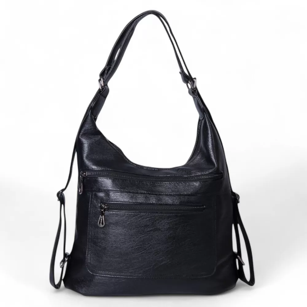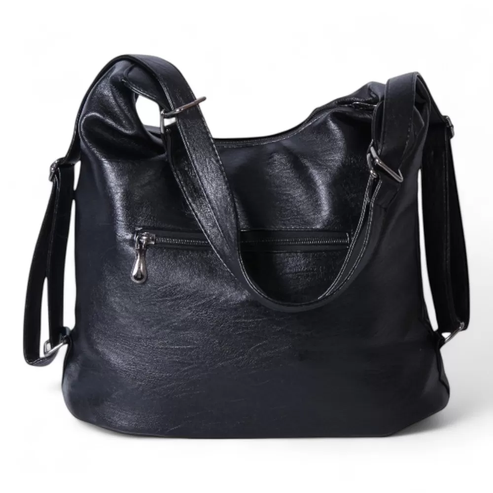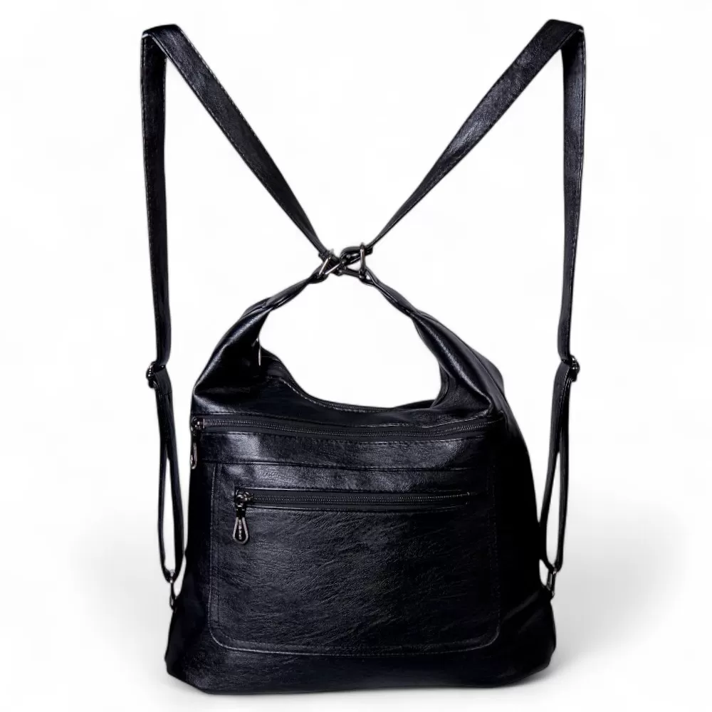 Сумка-рюкзак Passo Avanti из искусственной кожи выполнена в черном цвете. Модель имеет две ручки, которые можно стянуть и превратить в плечевые лямки: это позволит носить сумку как рюкзак. На лицевой стороне два горизонтальных кармана на молнии, сзади один карман на молнии. Внутри вы найдёте текстильную подкладку, средник и карман на молнии. Также в рюкзаке есть два накладных кармана.