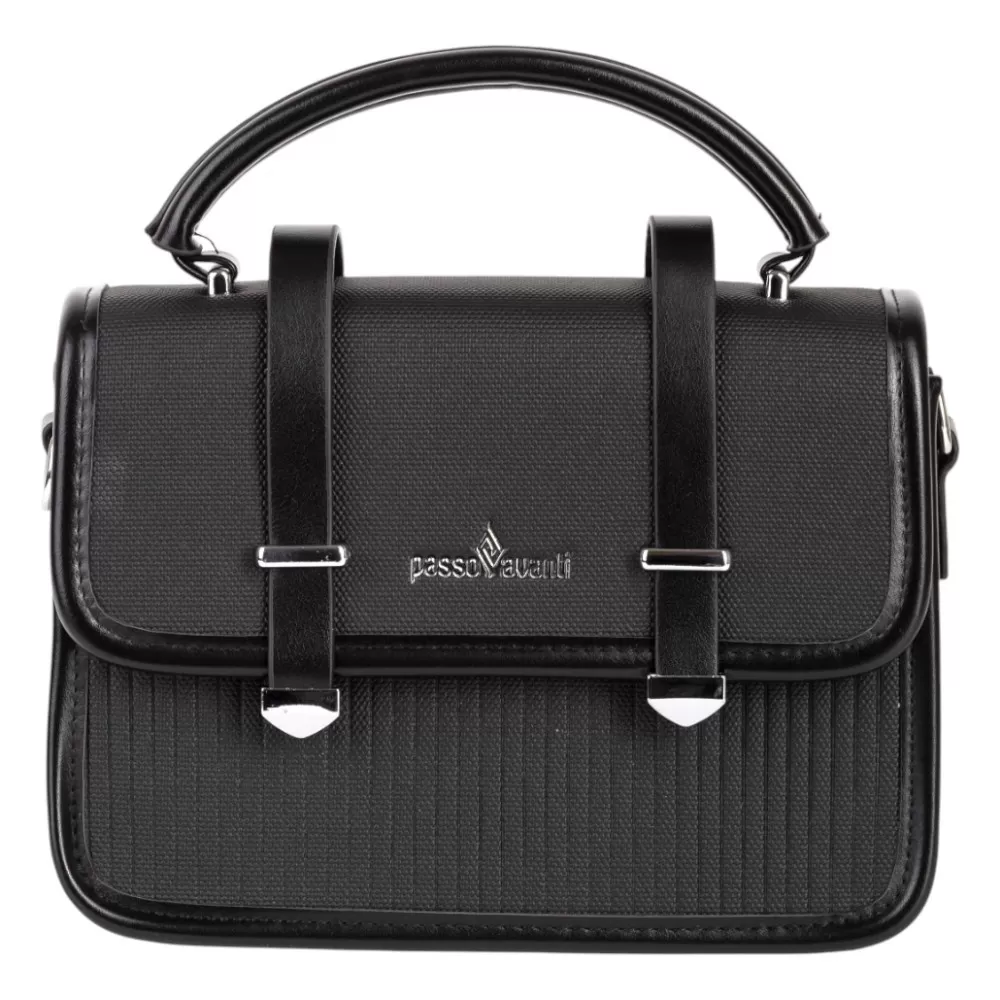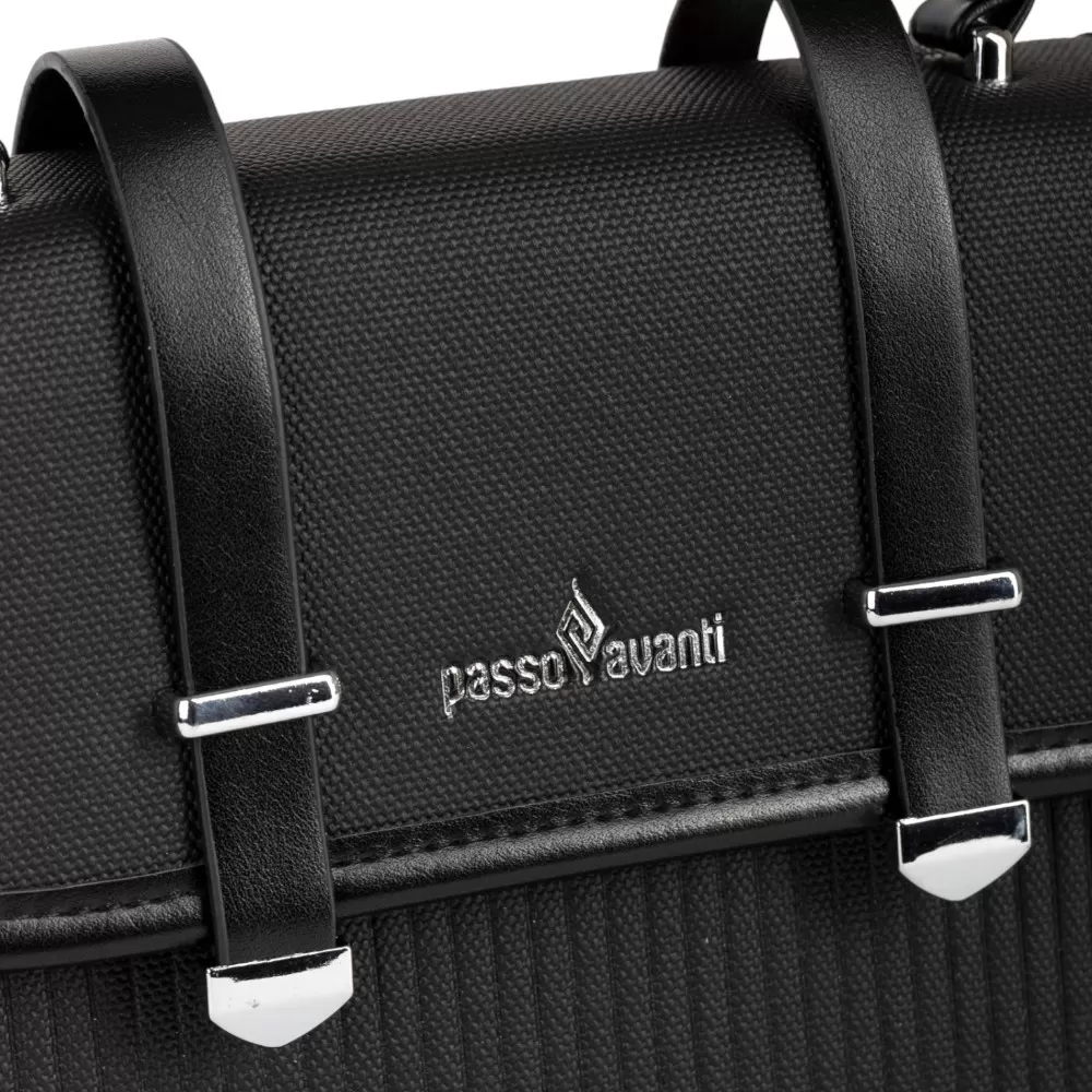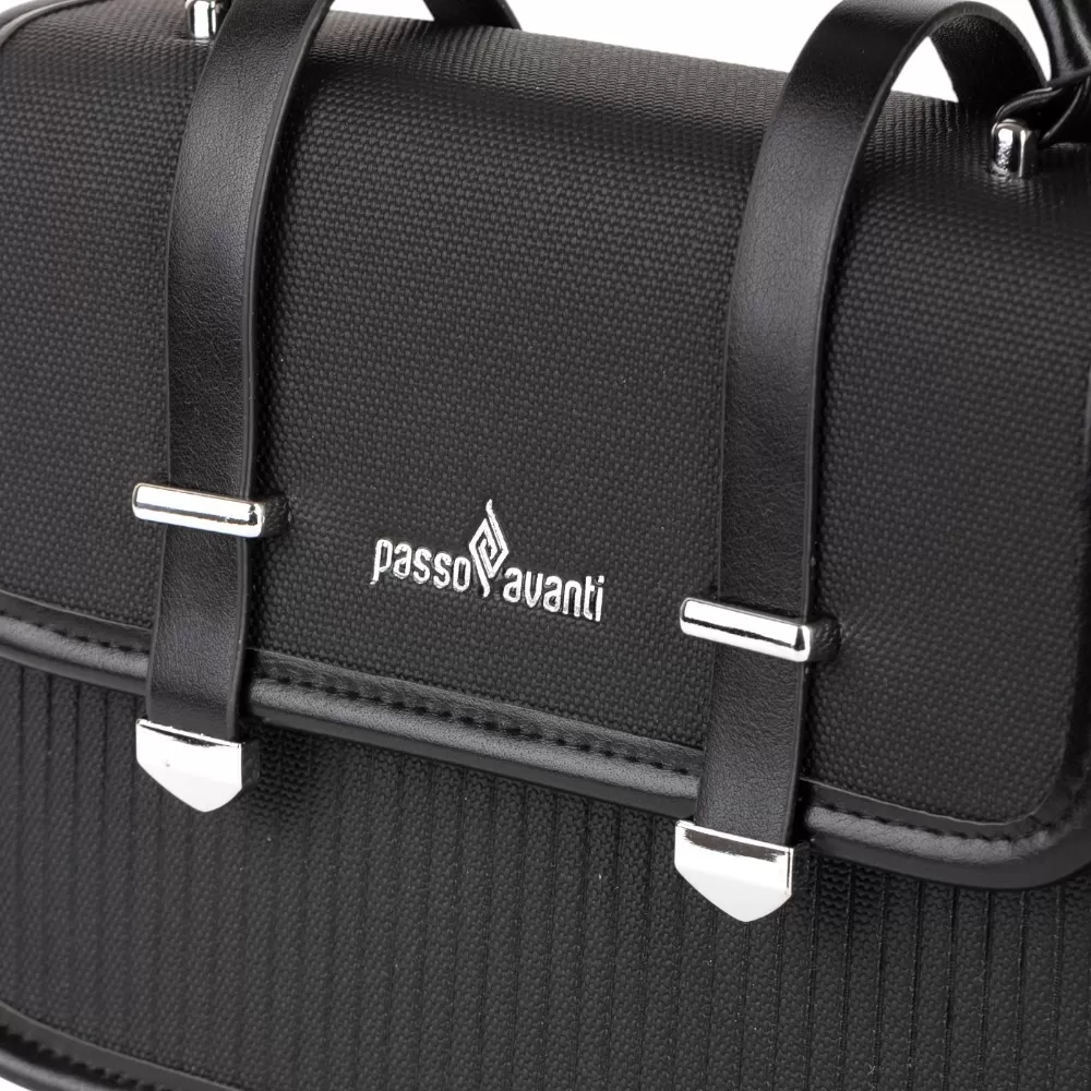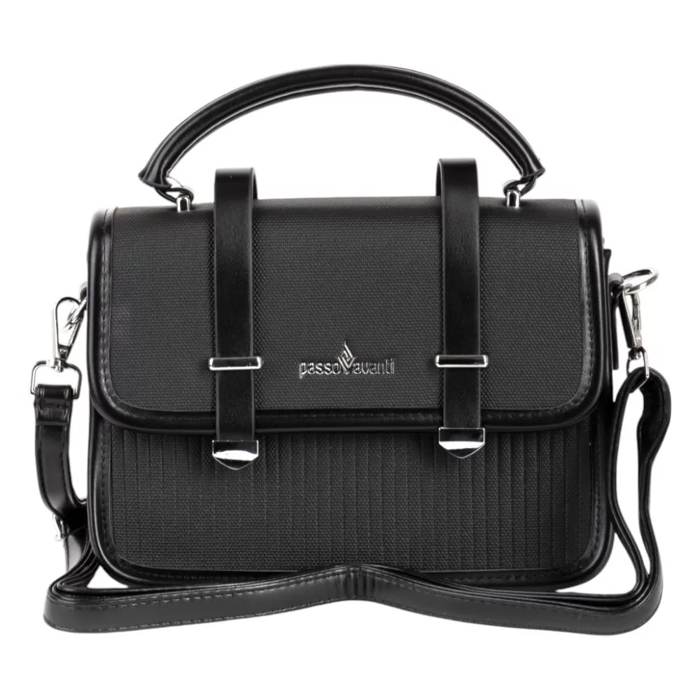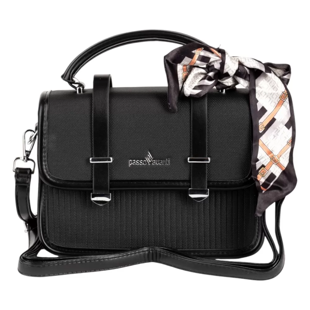 Сумка от бренда Passo Avanti выполнена из искусственной кожи черного цвета. Модель с ручкой и съемным регулируемым плечевым ремнем. Декорирована платком твилли. Клапан на магнитных кнопках закрывает три отделения: среднее — на молнии, боковые — без застежки.