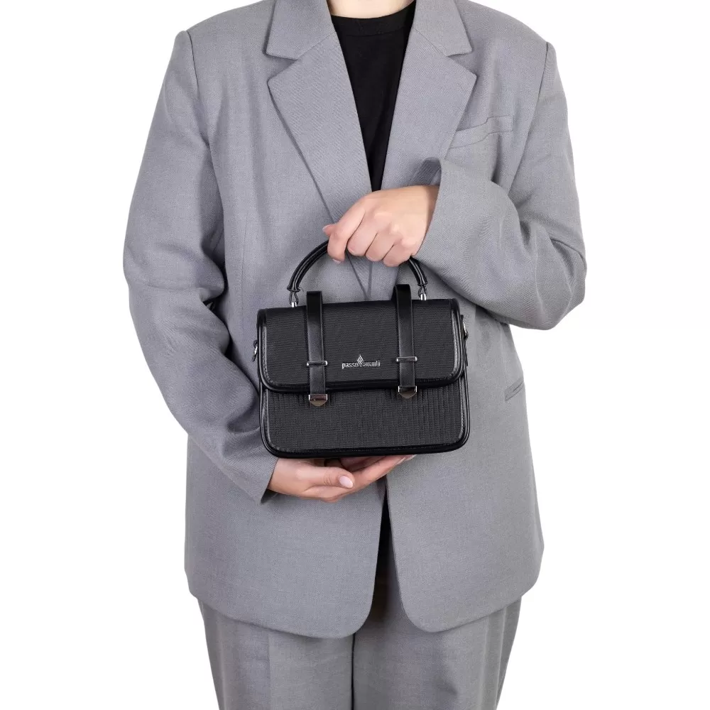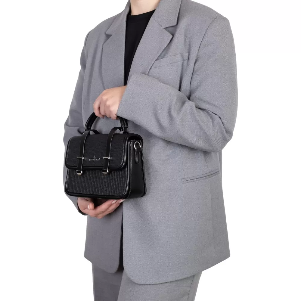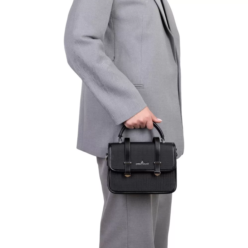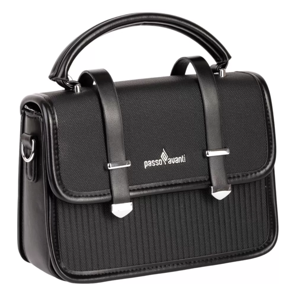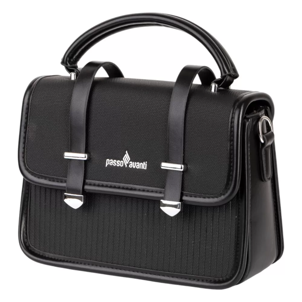 Сумка от бренда Passo Avanti выполнена из искусственной кожи черного цвета. Модель с ручкой и съемным регулируемым плечевым ремнем. Декорирована платком твилли. Клапан на магнитных кнопках закрывает три отделения: среднее — на молнии, боковые — без застежки.