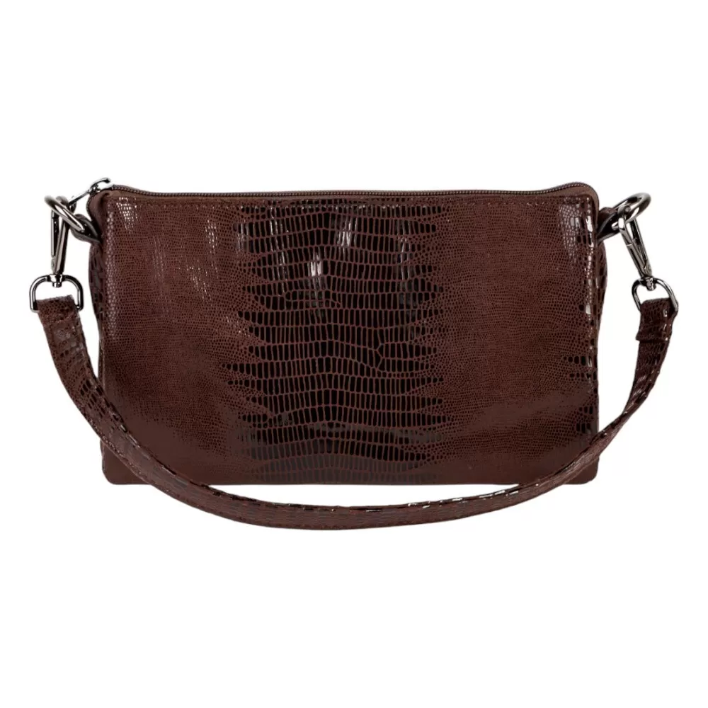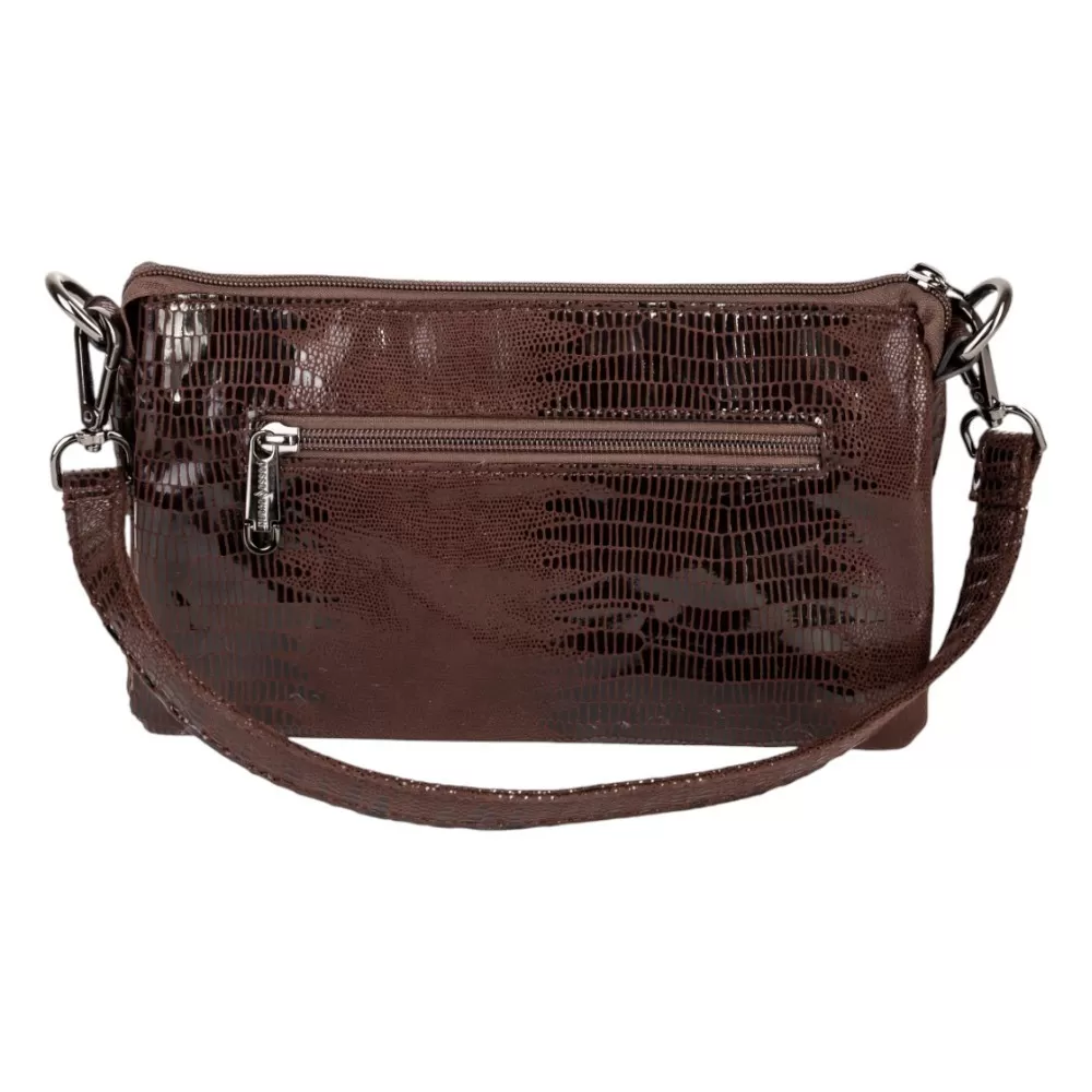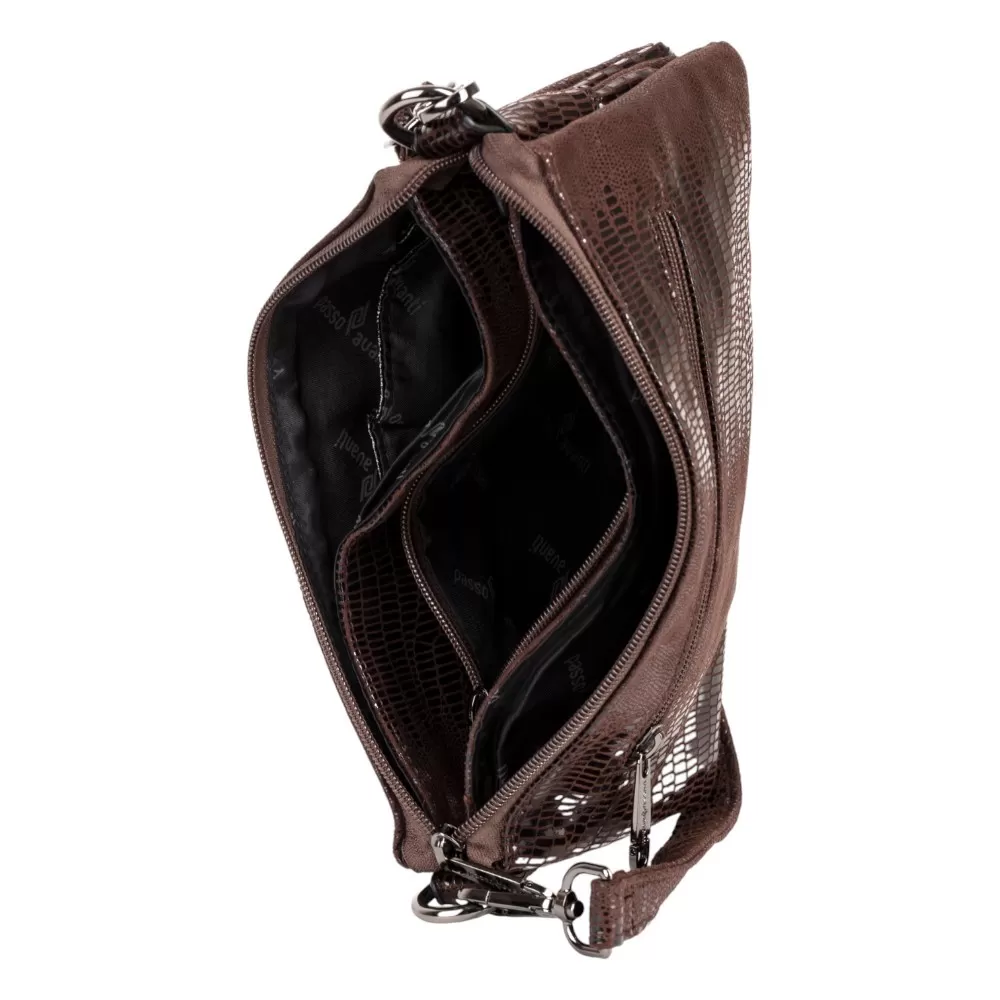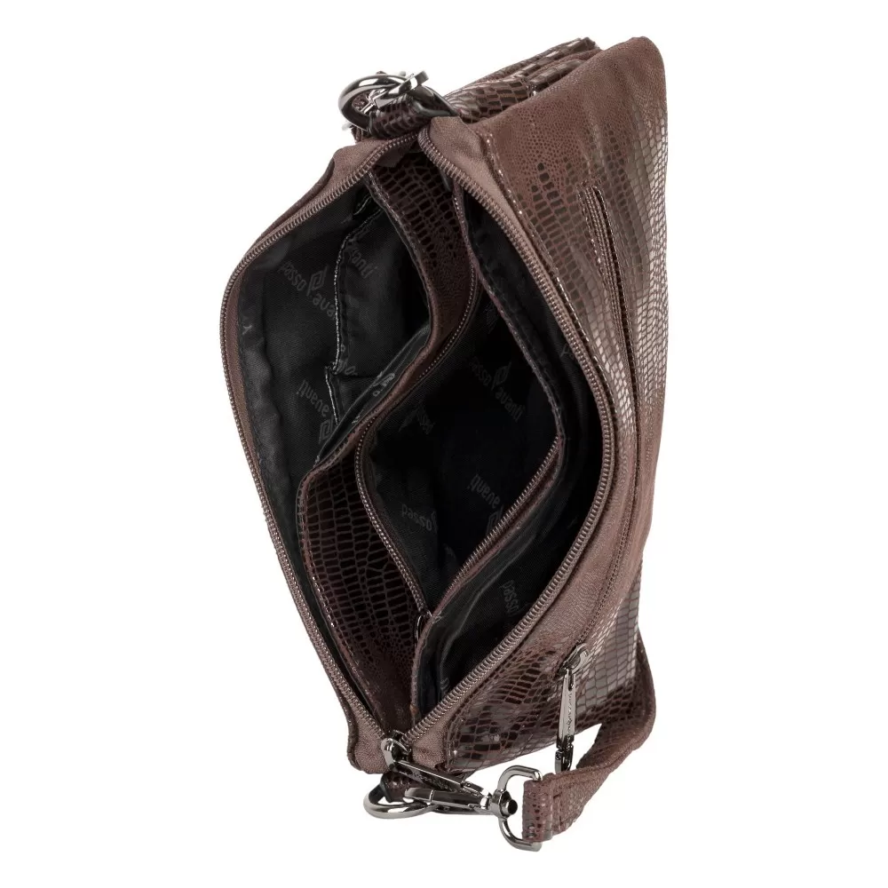 Сумка от бренда Passo Avanti из искусственной кожи коричневого цвета с эффектной лазерной обработкой и тиснением под рептилию. Модель с удлиненной съемной ручкой и съемным регулируемым плечевым ремнем. Клапан на двух магнитных кнопках закрывает накладной карман и отделение на молнии. Внутри: текстильная подкладка, 5 отсеков; в заднем – карман на молнии, в переднем – два накладных кармана, средний отсек на молнии. На задней стороне – карман на молнии.