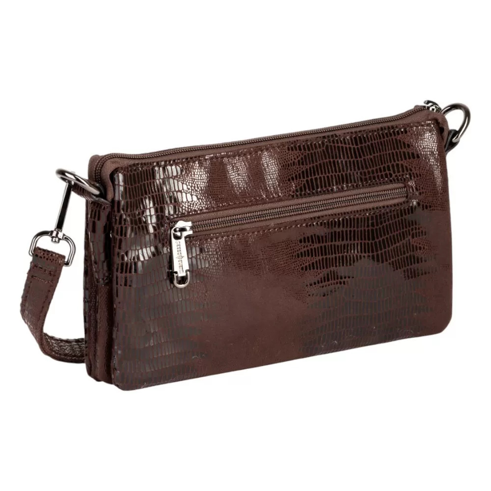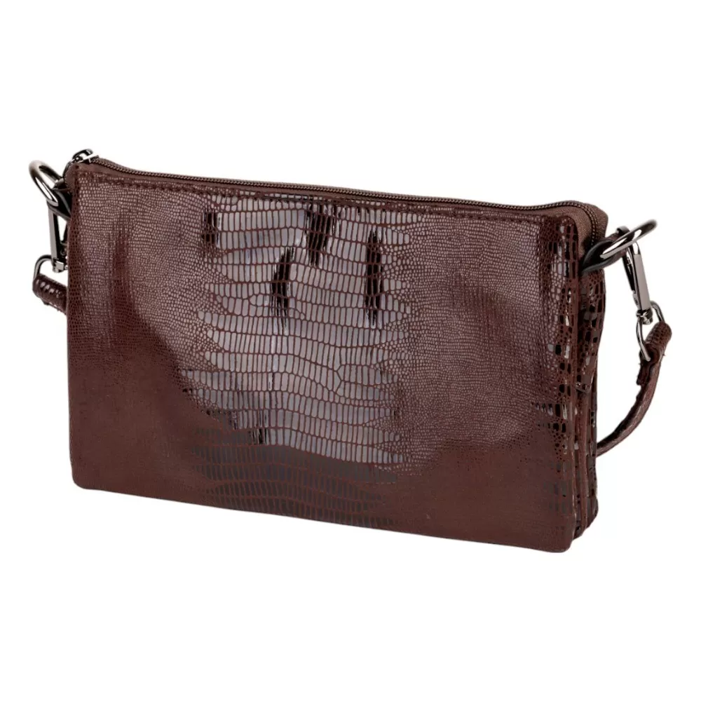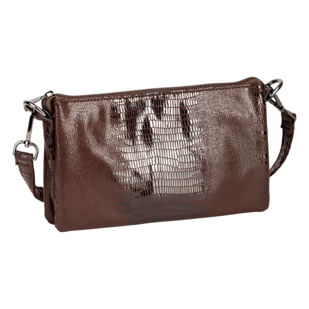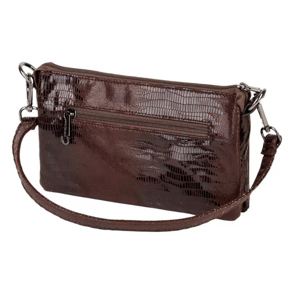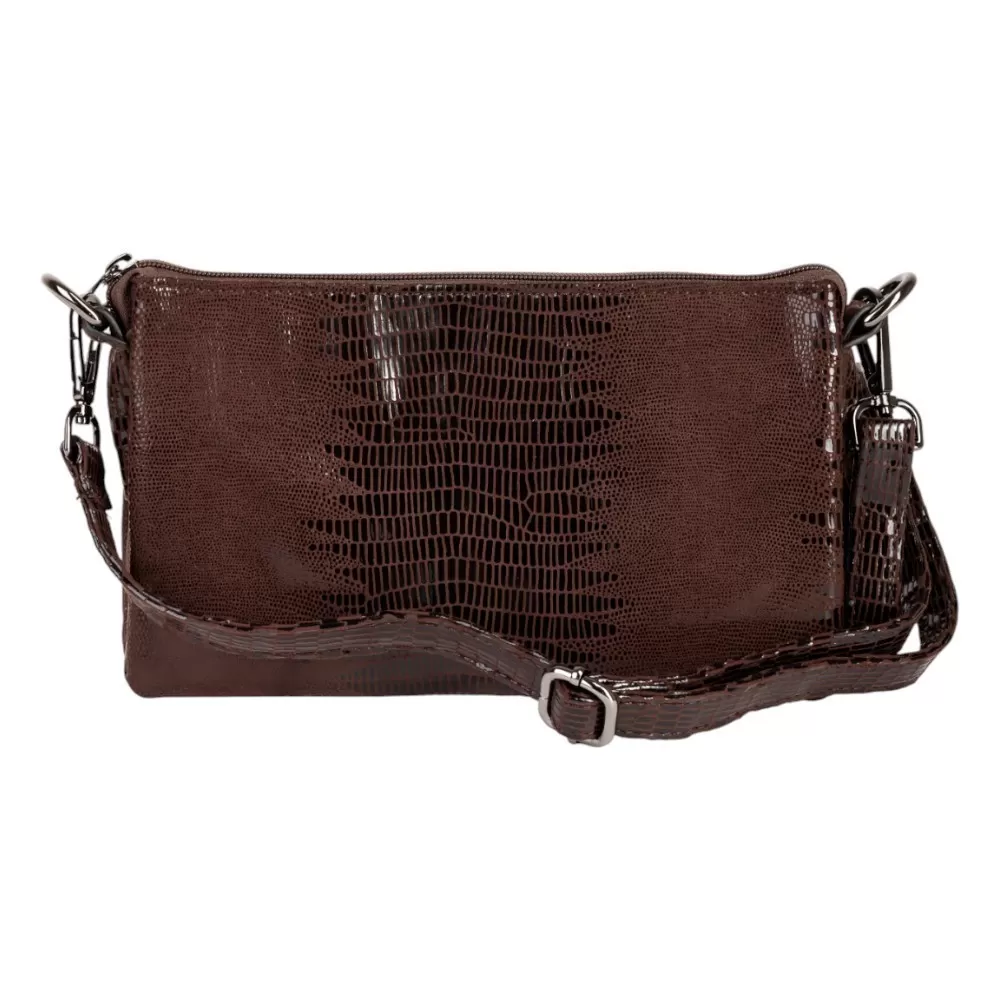 Сумка от бренда Passo Avanti из искусственной кожи коричневого цвета с эффектной лазерной обработкой и тиснением под рептилию. Модель с удлиненной съемной ручкой и съемным регулируемым плечевым ремнем. Клапан на двух магнитных кнопках закрывает накладной карман и отделение на молнии. Внутри: текстильная подкладка, 5 отсеков; в заднем – карман на молнии, в переднем – два накладных кармана, средний отсек на молнии. На задней стороне – карман на молнии.