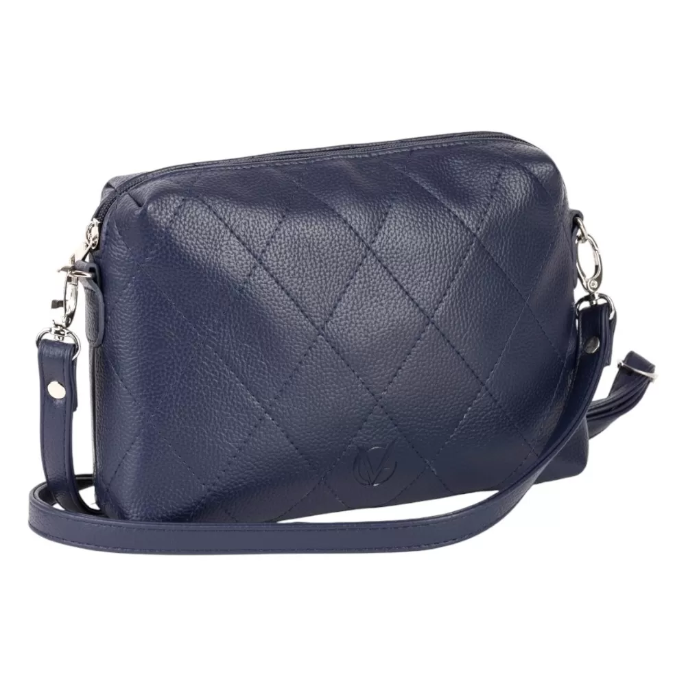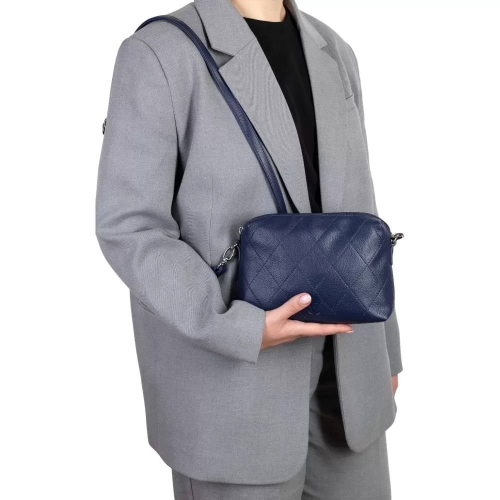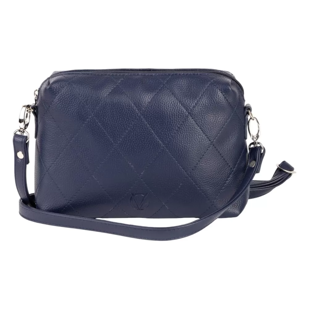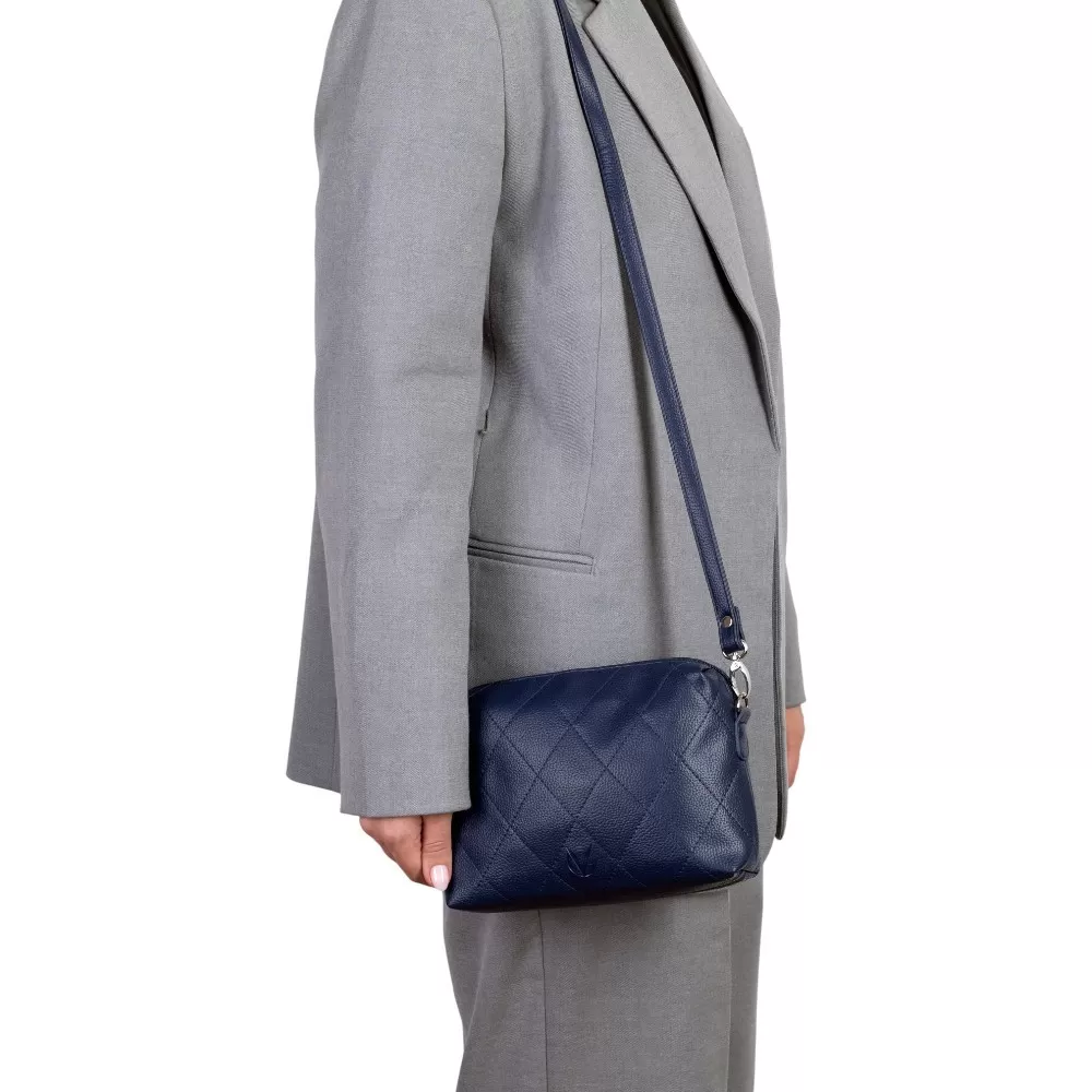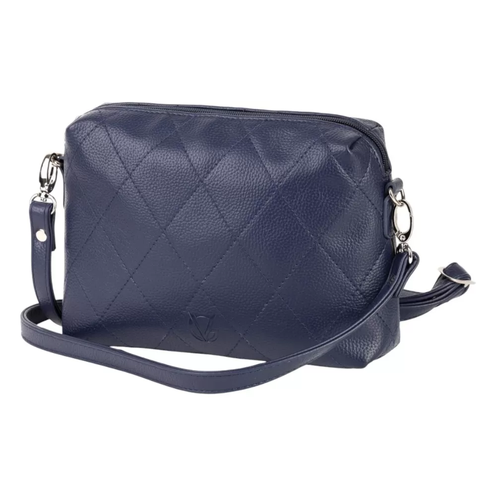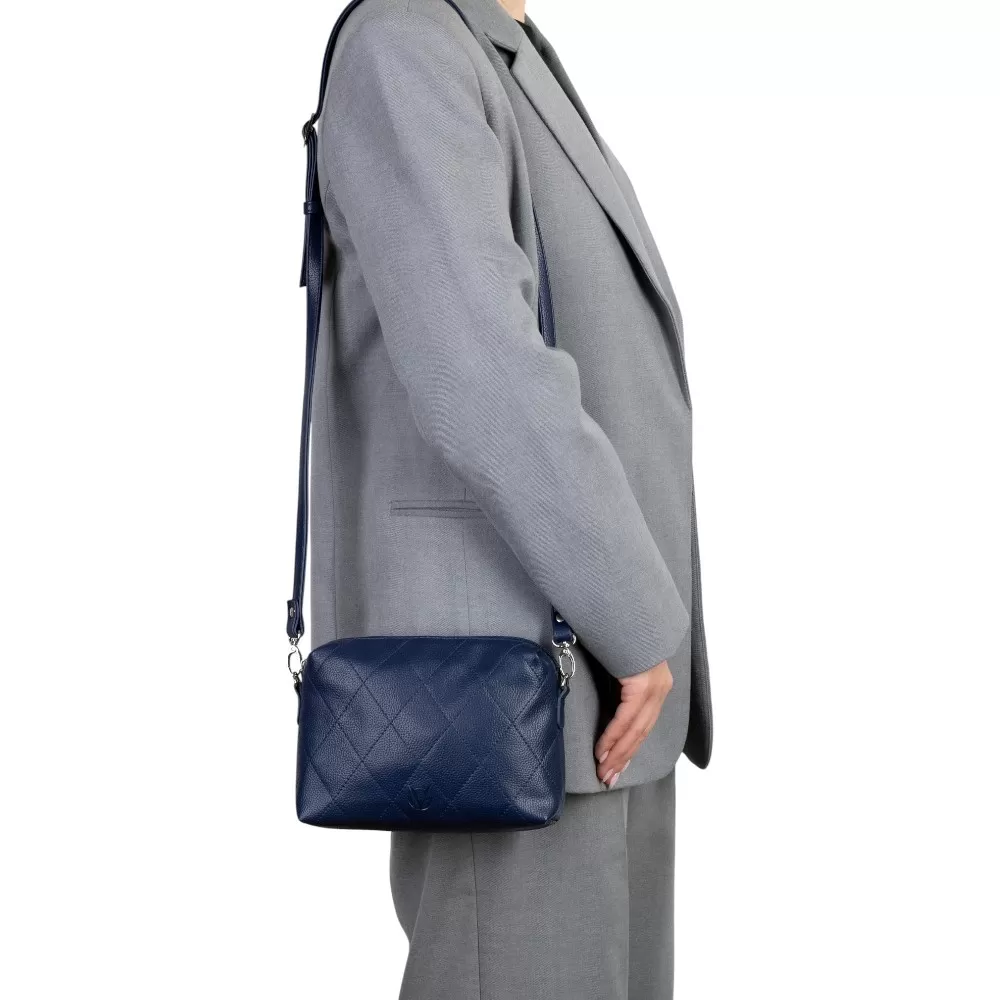 Сумка от бренда Valigetti выполнена из искусственной кожи в синем цвете. Модель со съемным регулируемым плечевым ремнем, на задней стороне сумки расположен горизонтальный карман быстрого доступа на молнии, основное отделение закрывается на молнию, внутри: текстильная подкладка, накладной карман на молнии и открытый накладной карман.