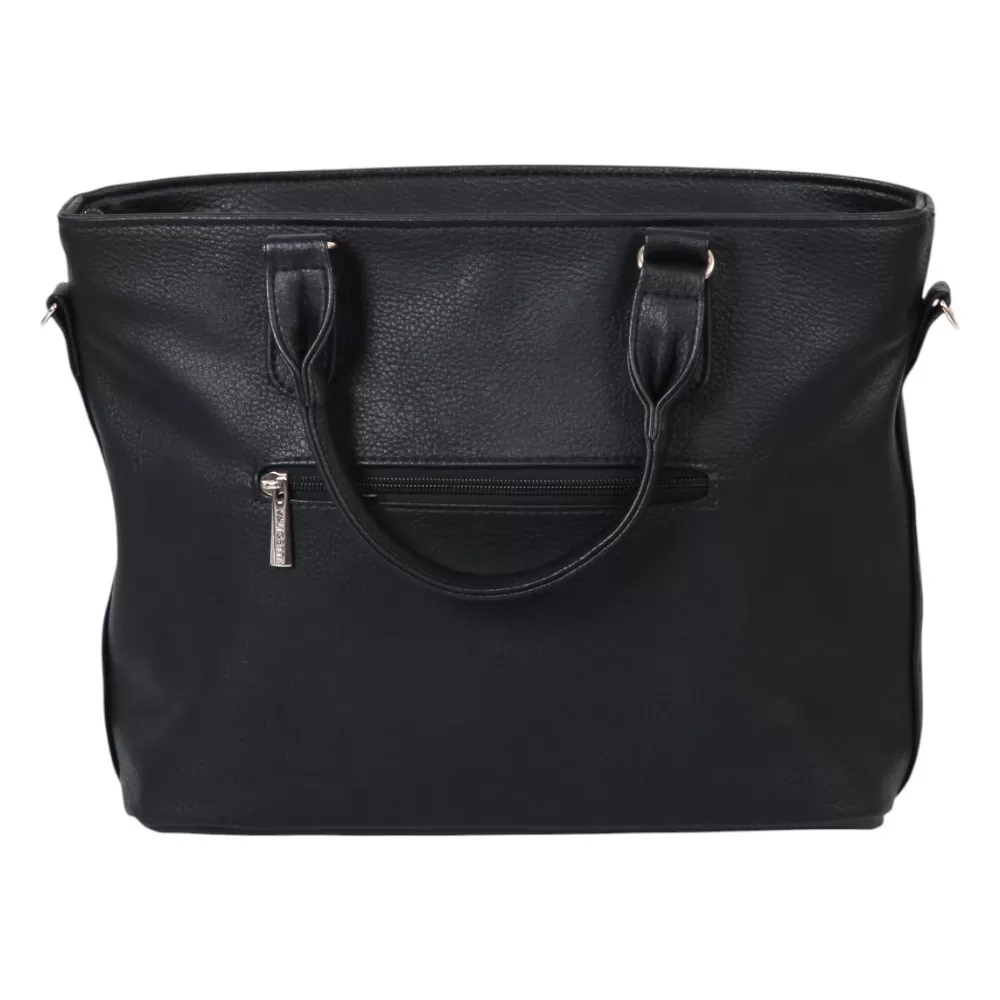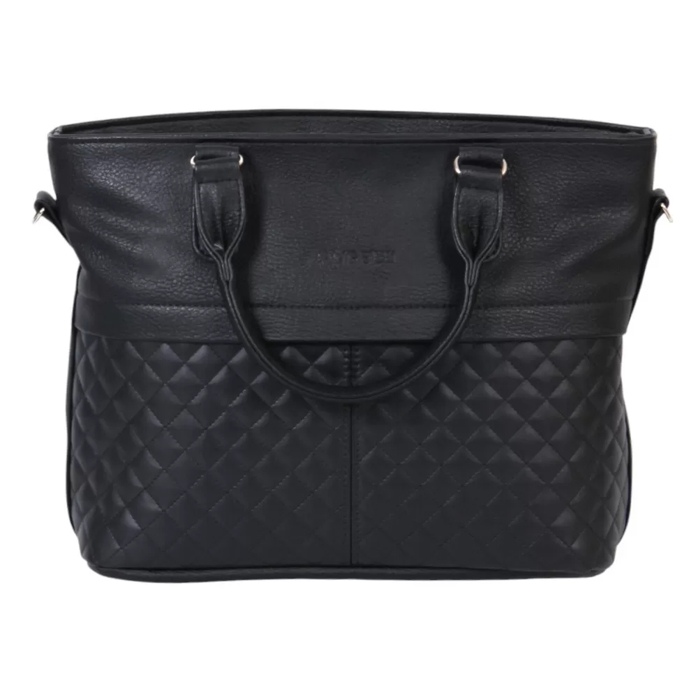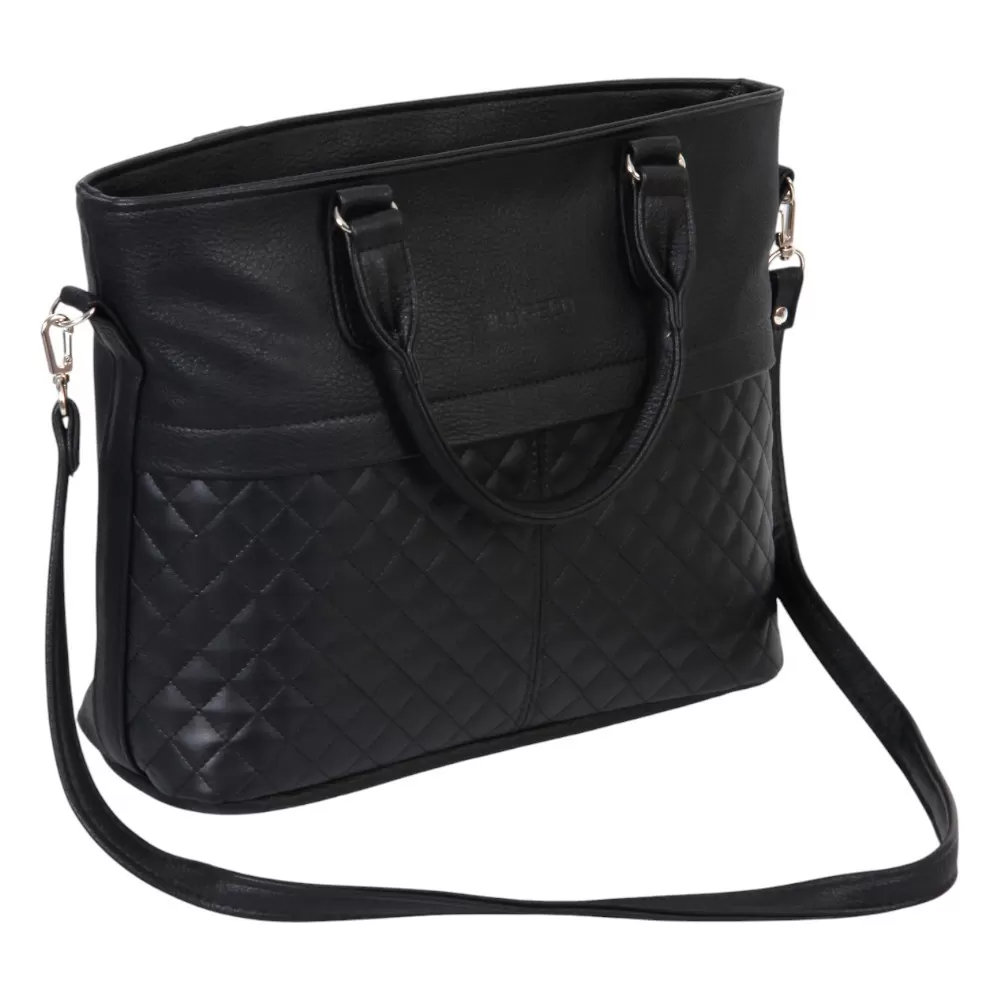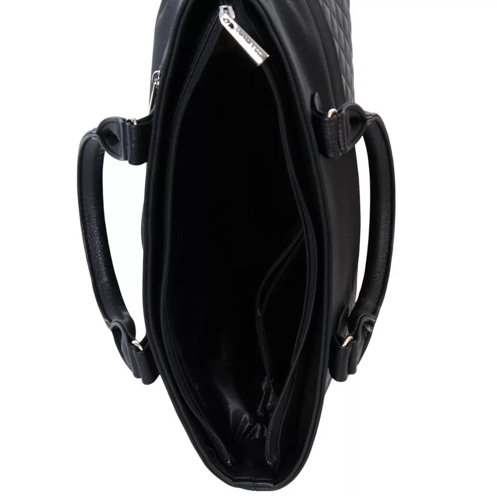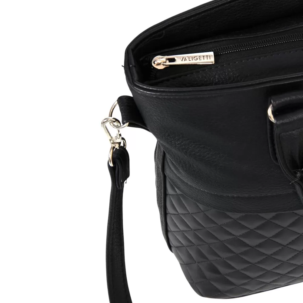 Сумка от бренда Valigetti выполнена из искусственной кожи в черном цвете. Декорирована ромбовидной стежкой. Модель с двумя ручками и съемным нерегулируемым плечевым ремнем. Сумка с одним отделением, внутри фирменная текстильная подкладка, накладной открытый карман, средник на молнии и маленький накладной карман на молнии. На задней стороне сумки расположен карман.
