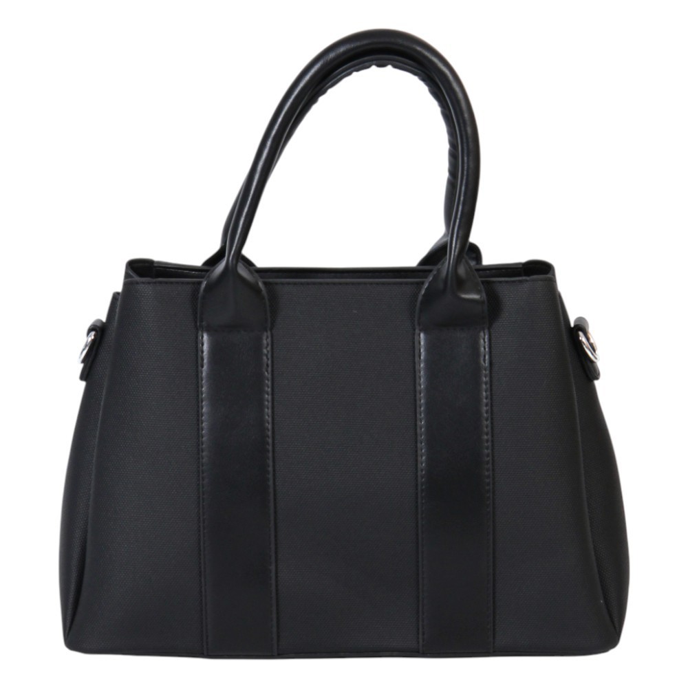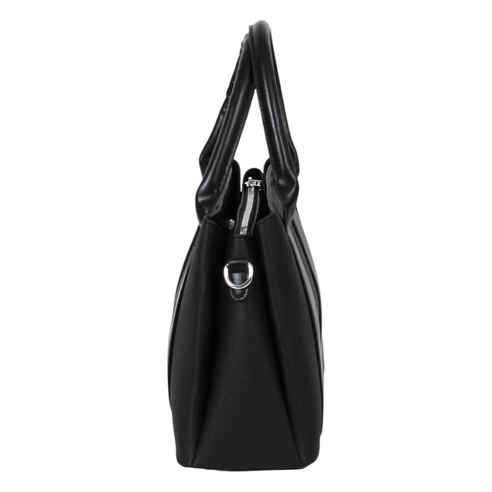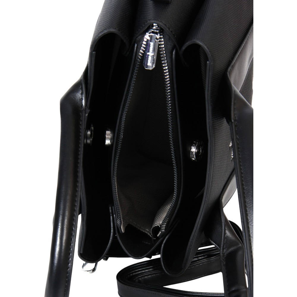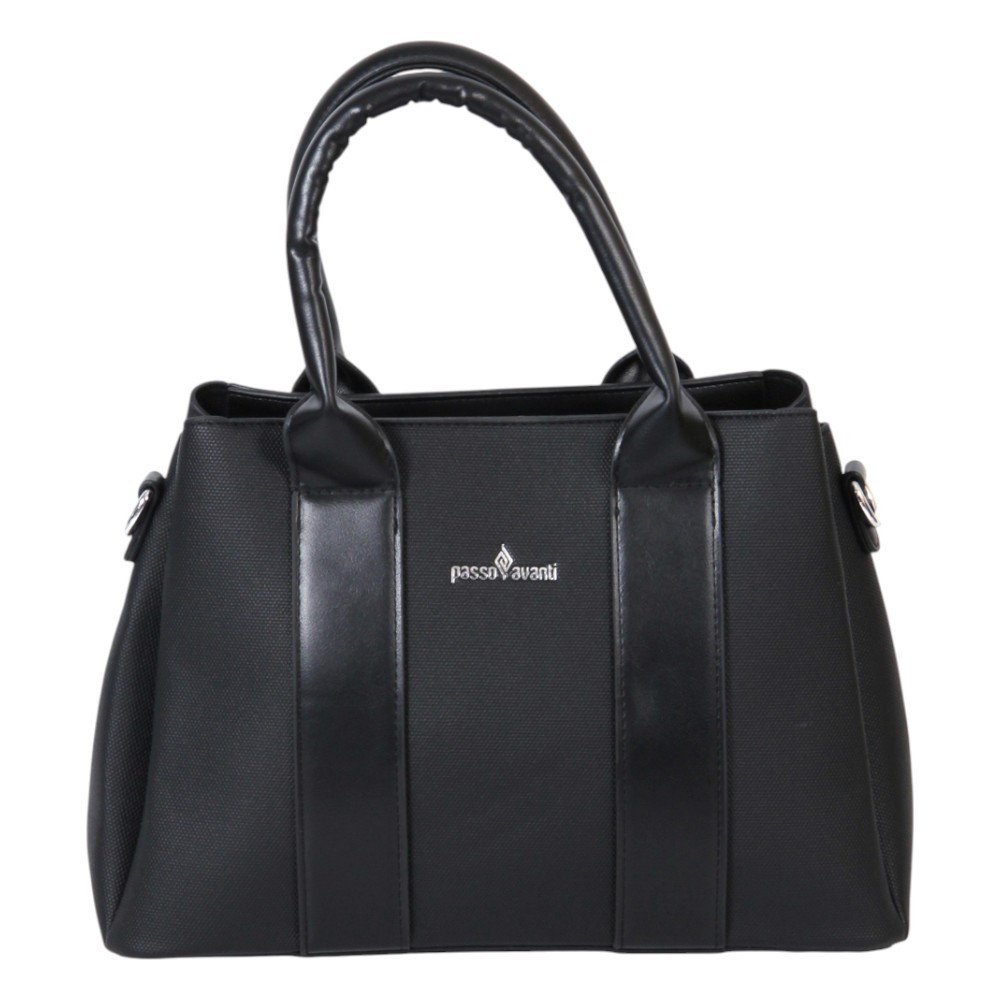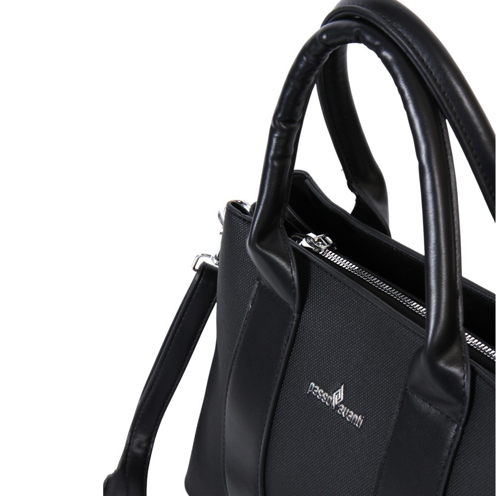 Сумка от бренда Passo Avanti выполнена из текстильного материала и искусственной кожи черного цвета. Модель с двумя ручками и съемным регулируемым плечевым ремнем. Три отделения: среднее — на молнии, боковые — на магнитной кнопке. Дно оснащено металлическими ножками для защиты от износа.