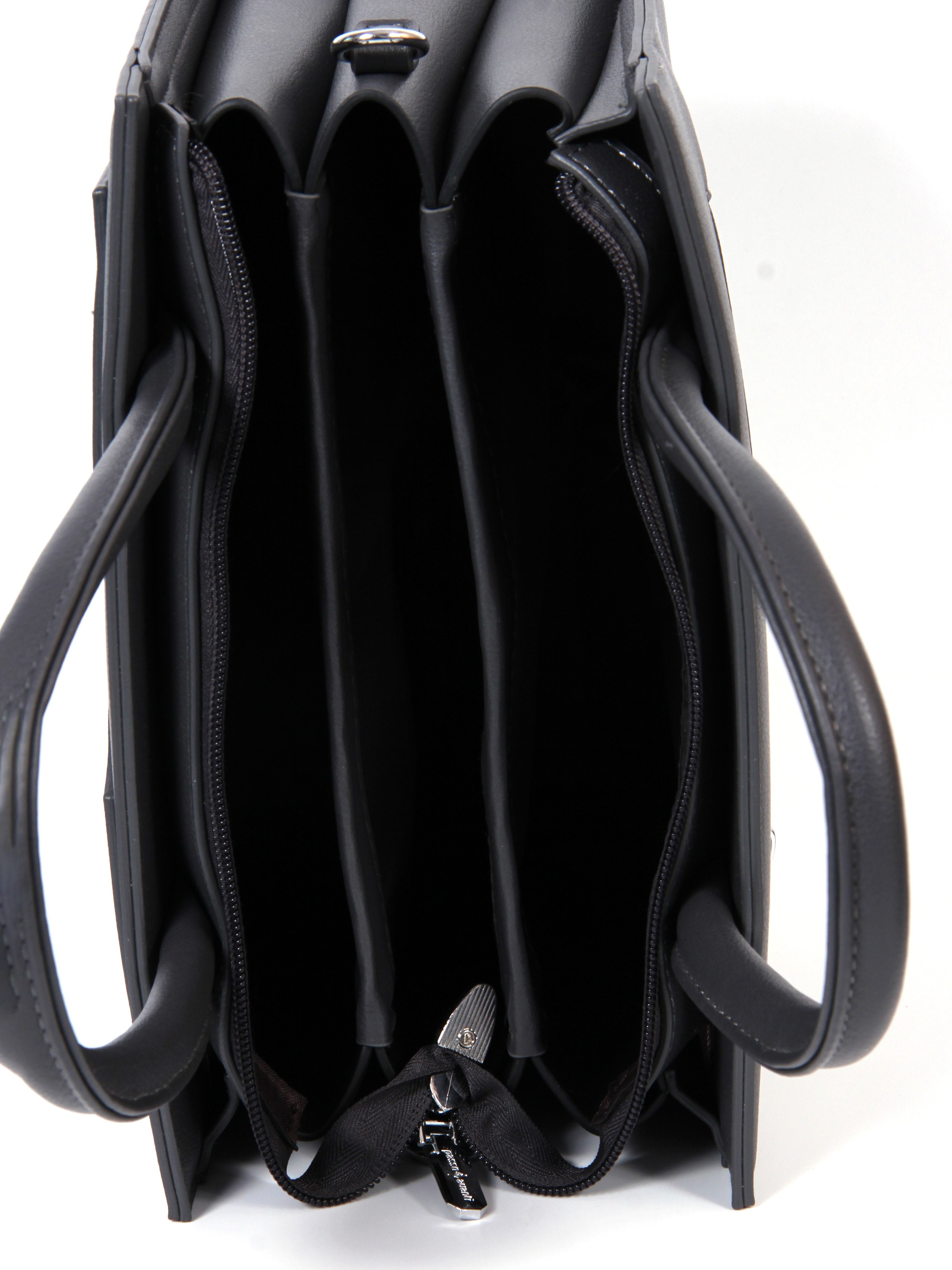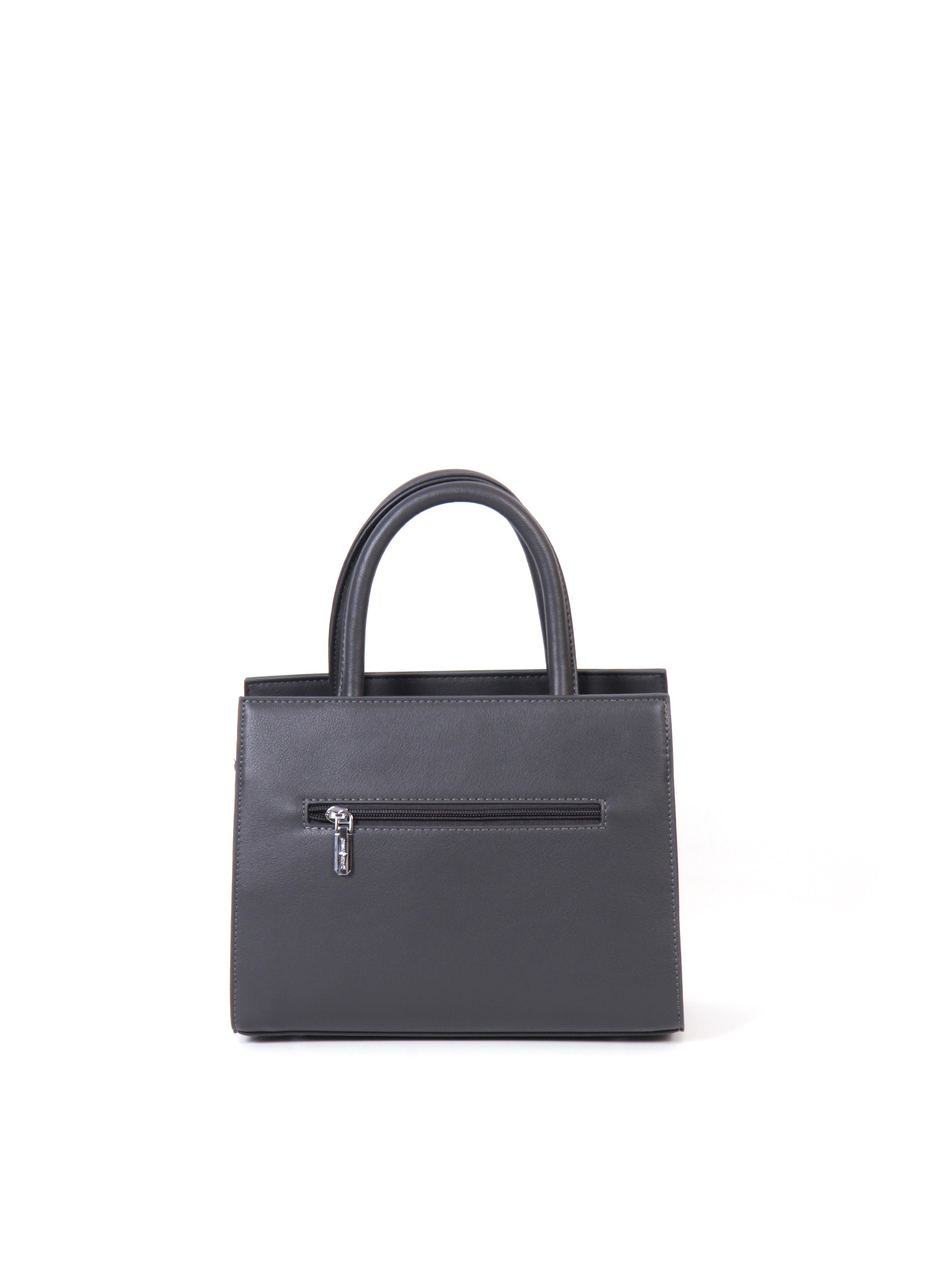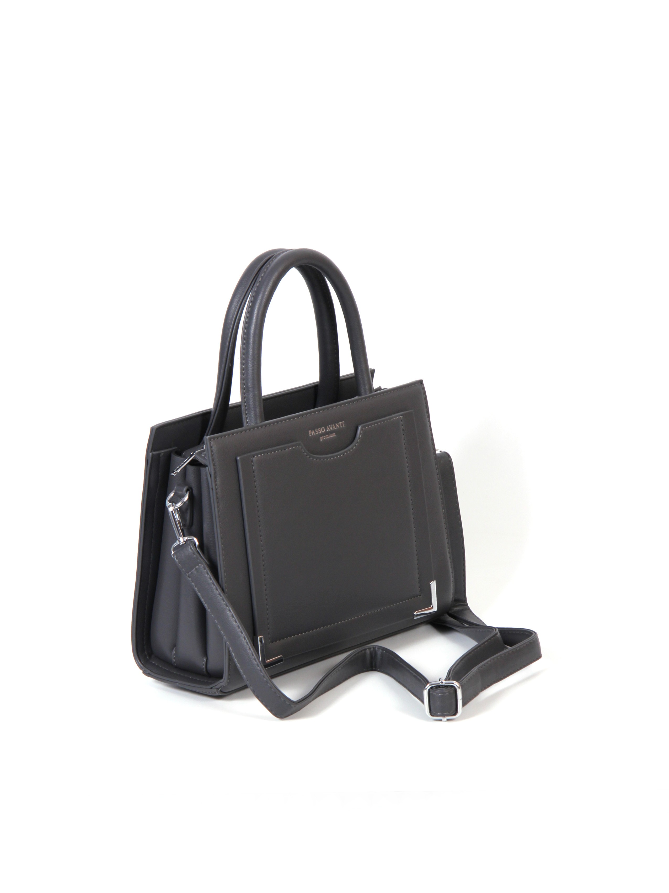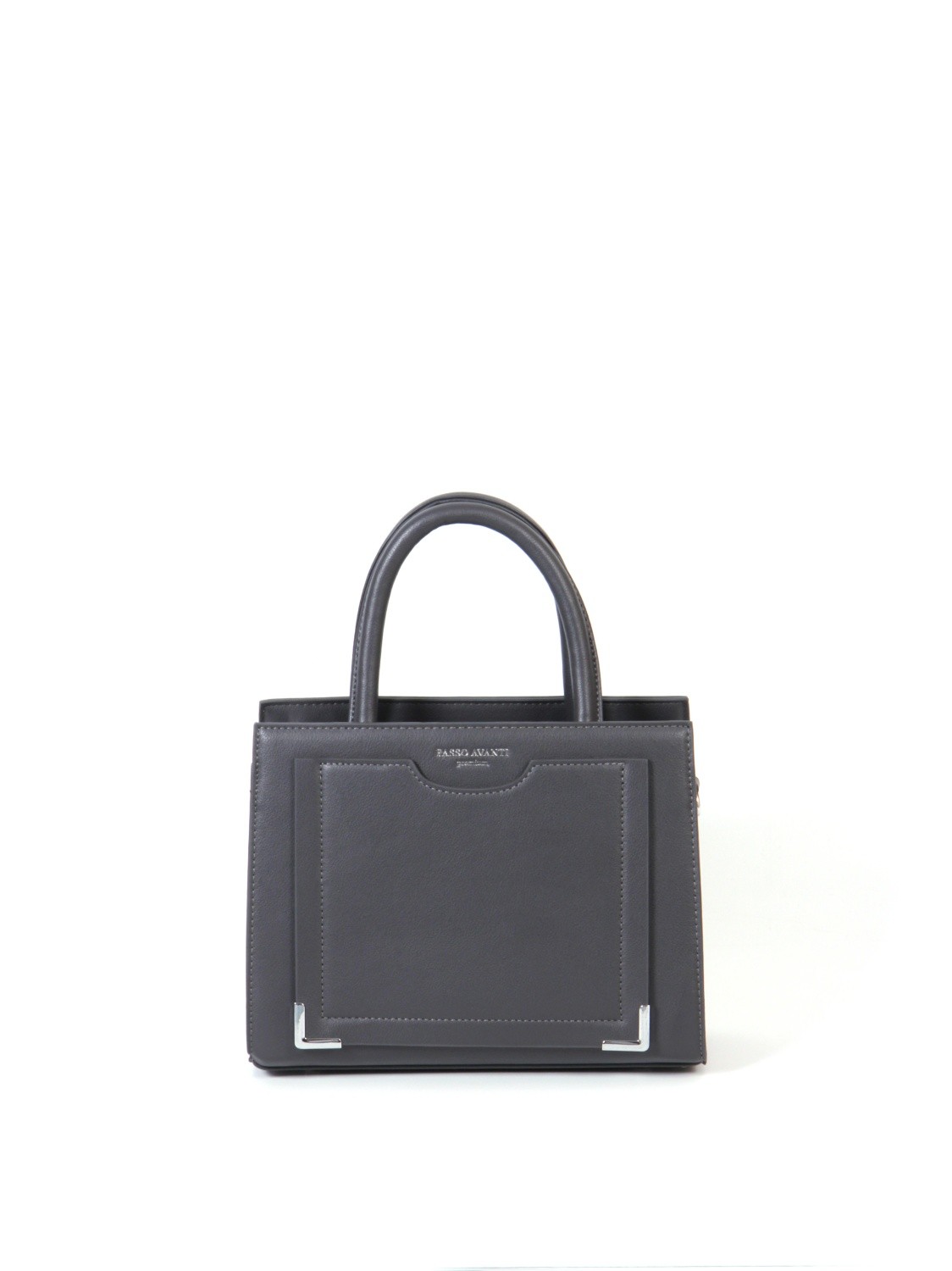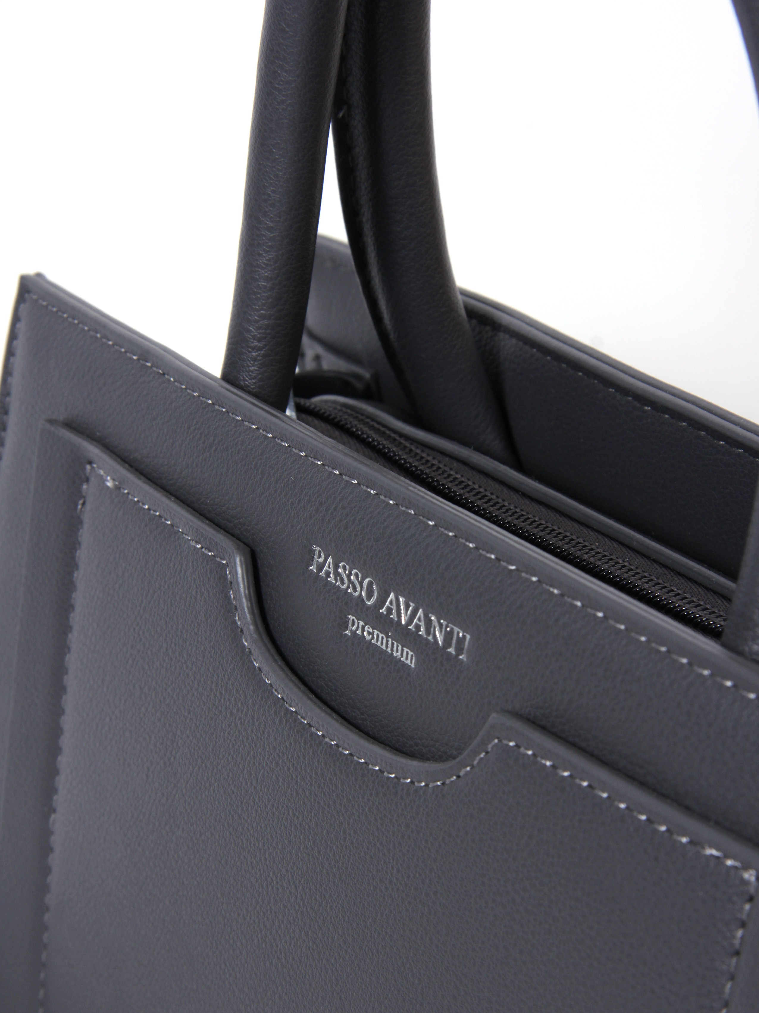 Сумка от бренда Passo Avanti из искусственной кожи серого цвета. Модель с двумя ручками и съемным регулируемым плечевым ремнем. Отделение на молнии. Внутри: два отсека, текстильная подкладка, карман на молнии, накладной карман. С лицевой стороны — накладной карман. С задней стороны — карман на молнии. Дно оснащено металлическими ножками для защиты от износа.