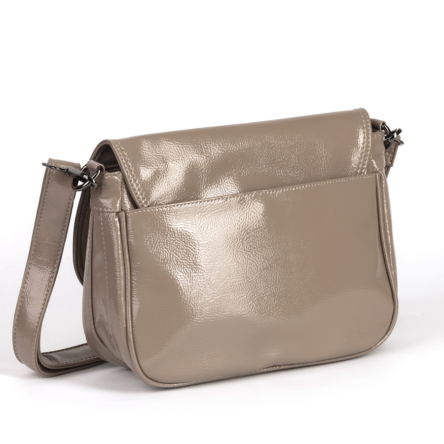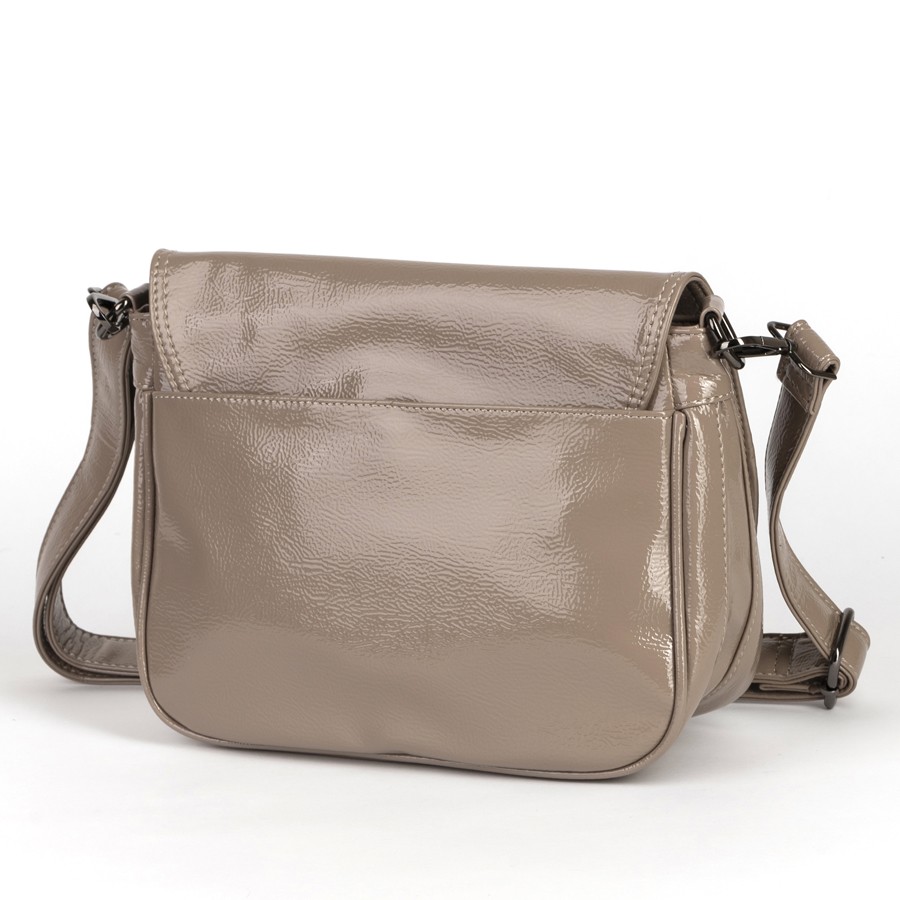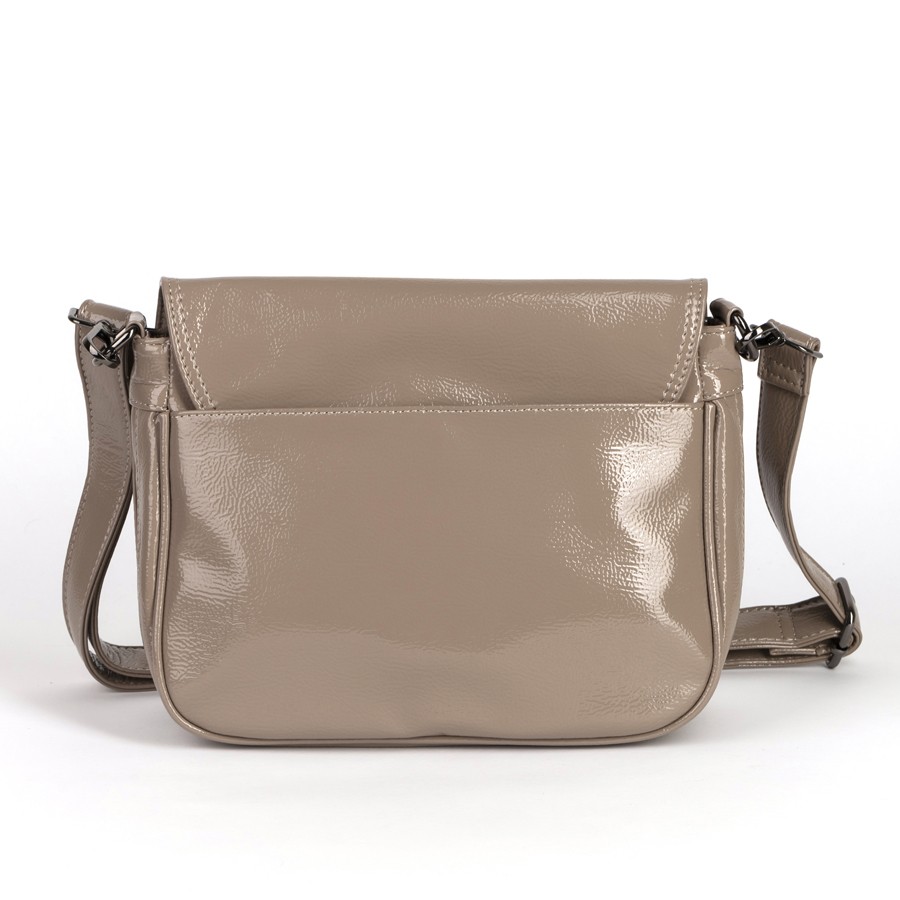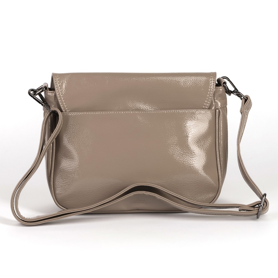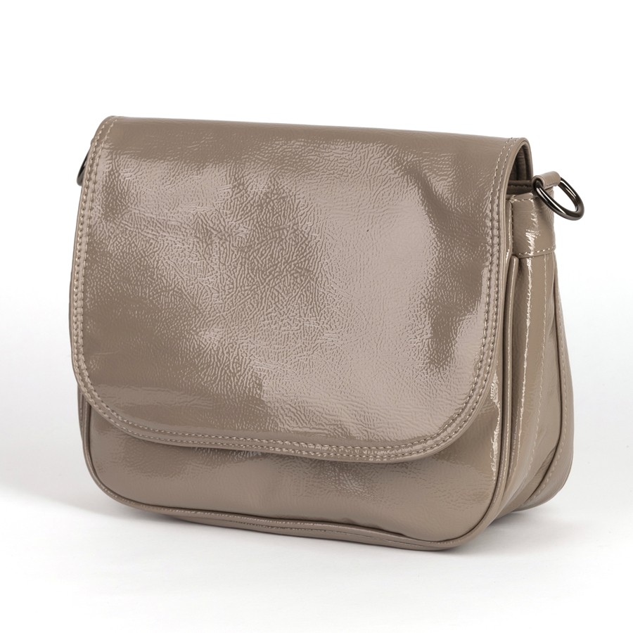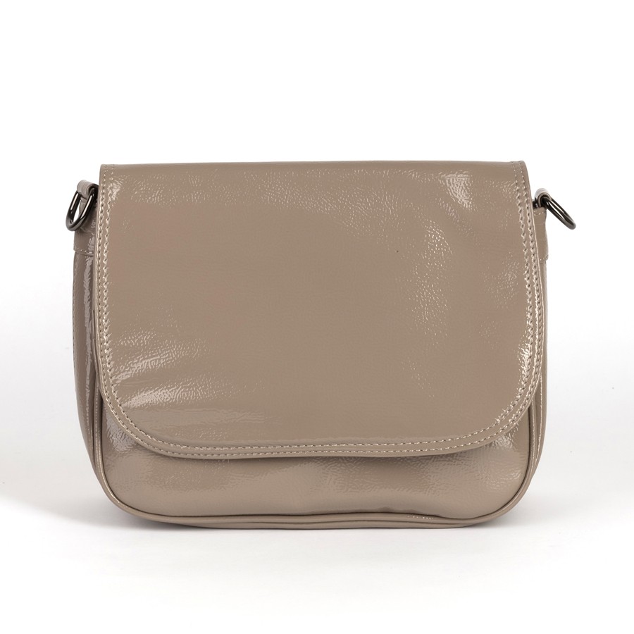 Женская сумка через плечо из гладкой искусственной кожи цвета тауpe с лёгким глянцевым блеском. Форма — прямоугольная, с клапаном на передней части и аккуратным передним карманом. Дизайн минималистичный и универсальный, подходит для повседневного использования.