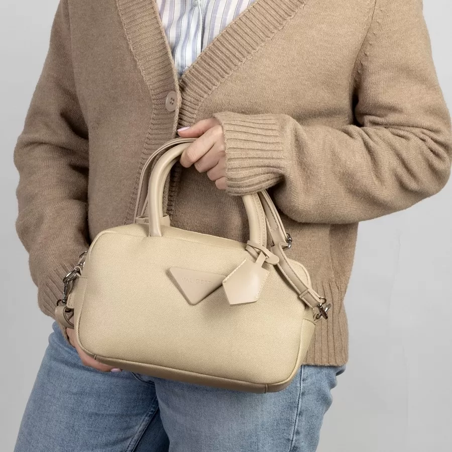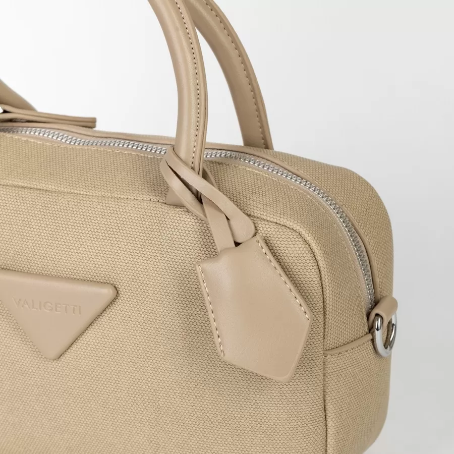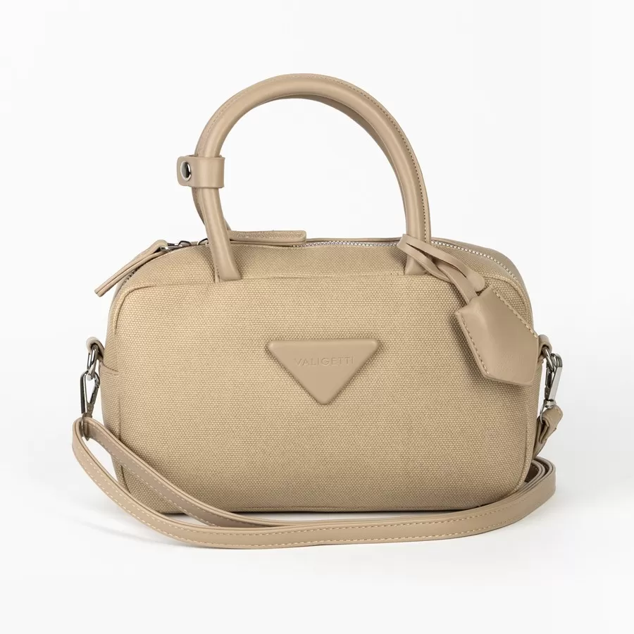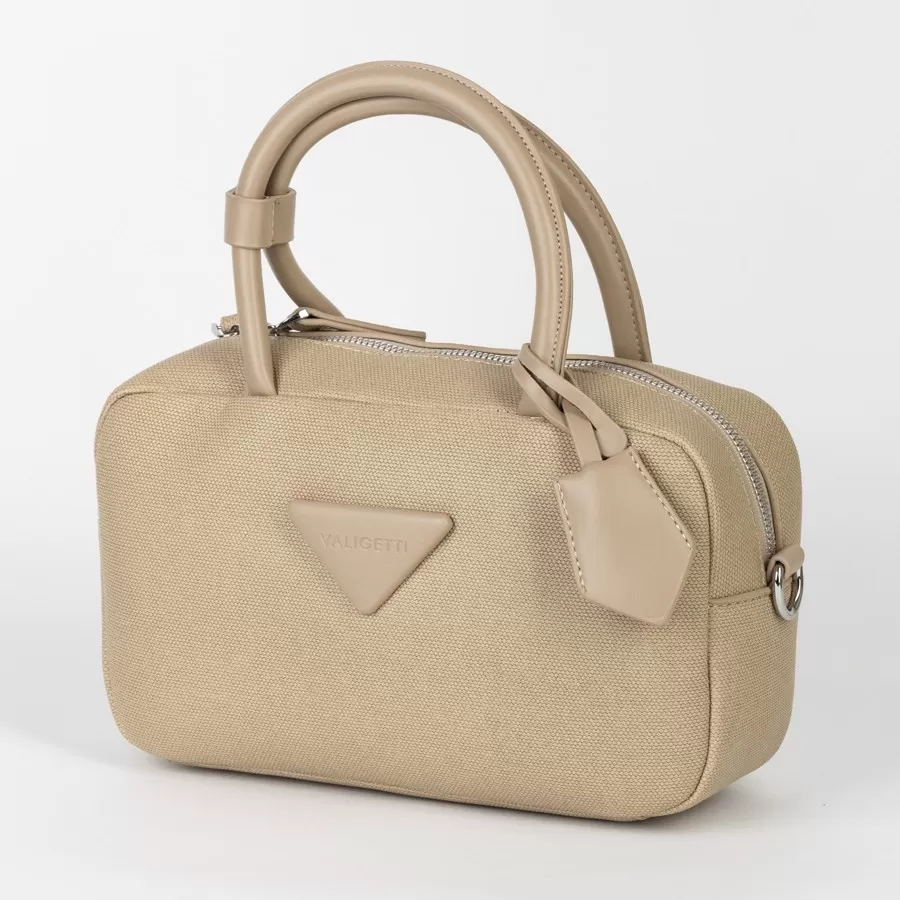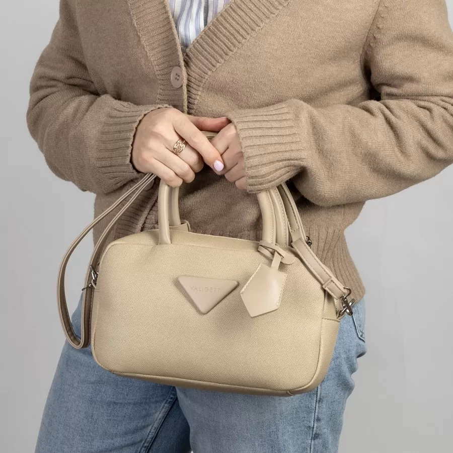 Женская сумка бренда Valigetti из искусственной кожи зернистой структуры. Имеет пришитые кожаные ручки и плечевой ремень на карабинах. Внутри есть карман на молнии и кармашек