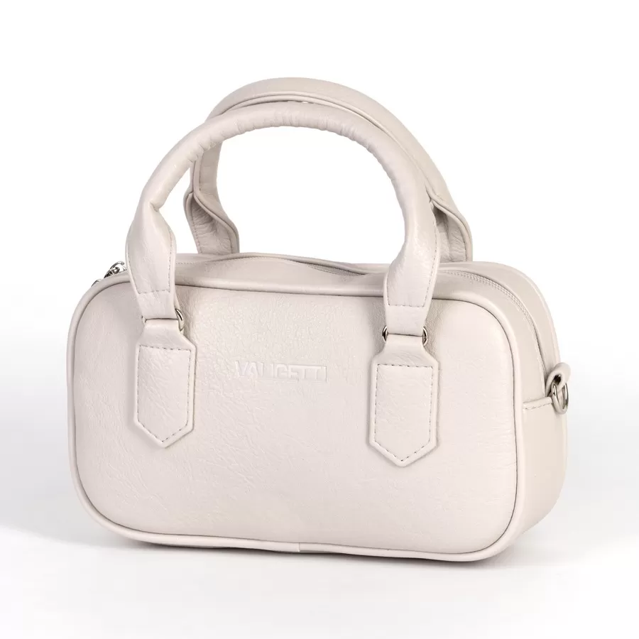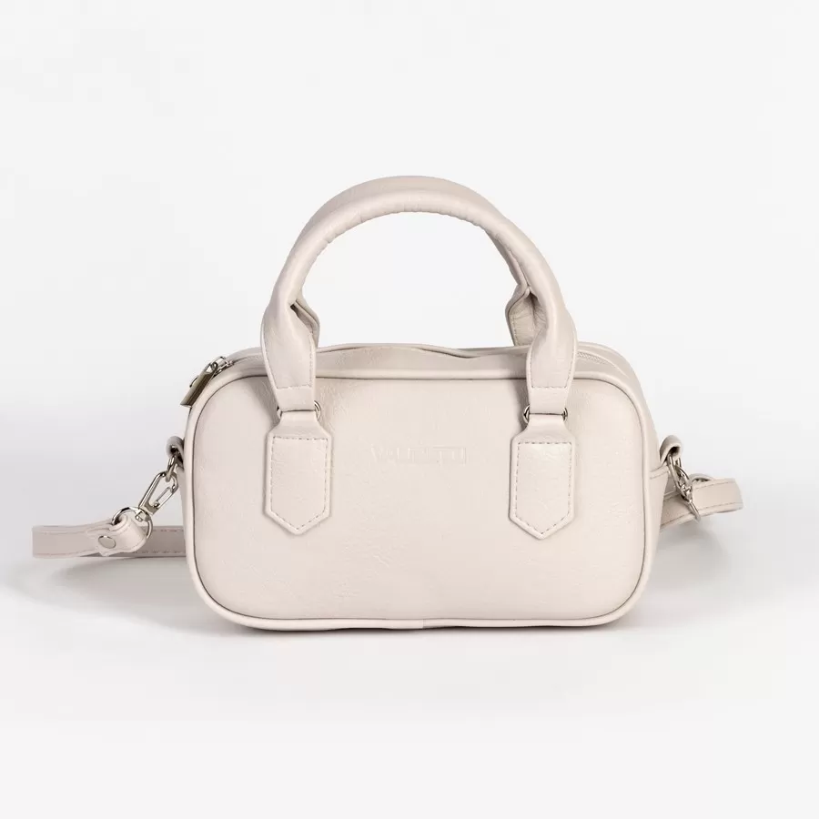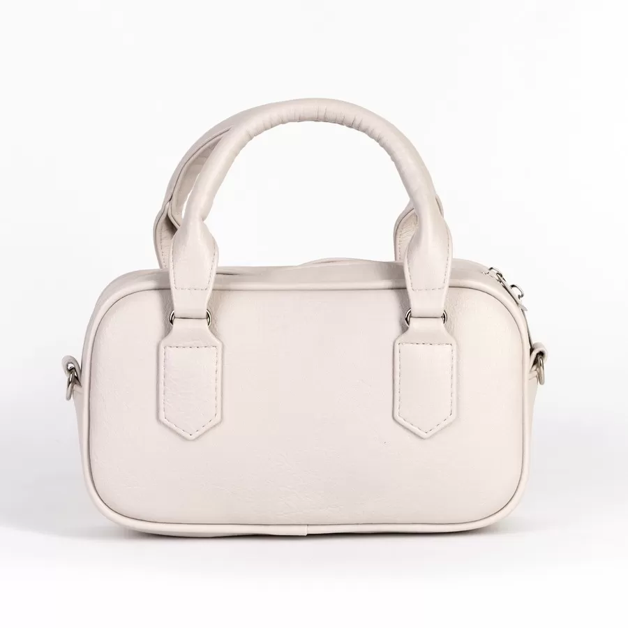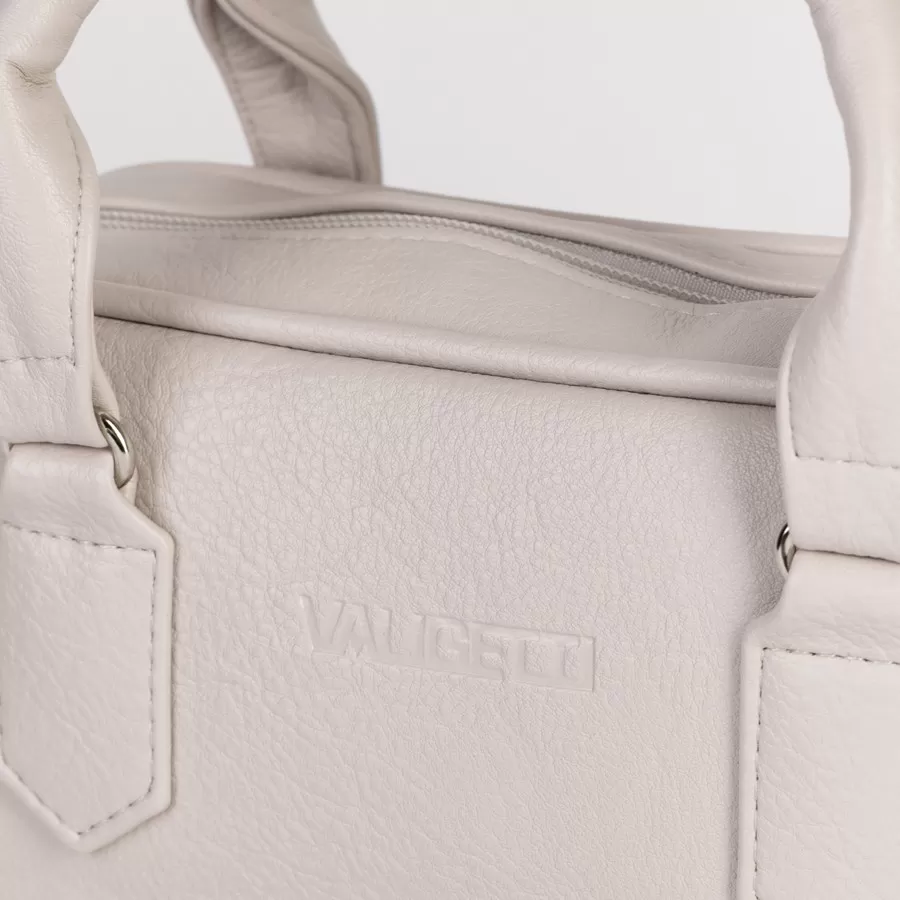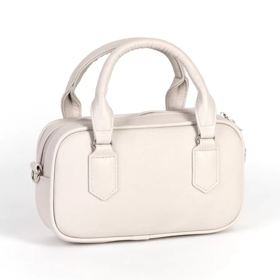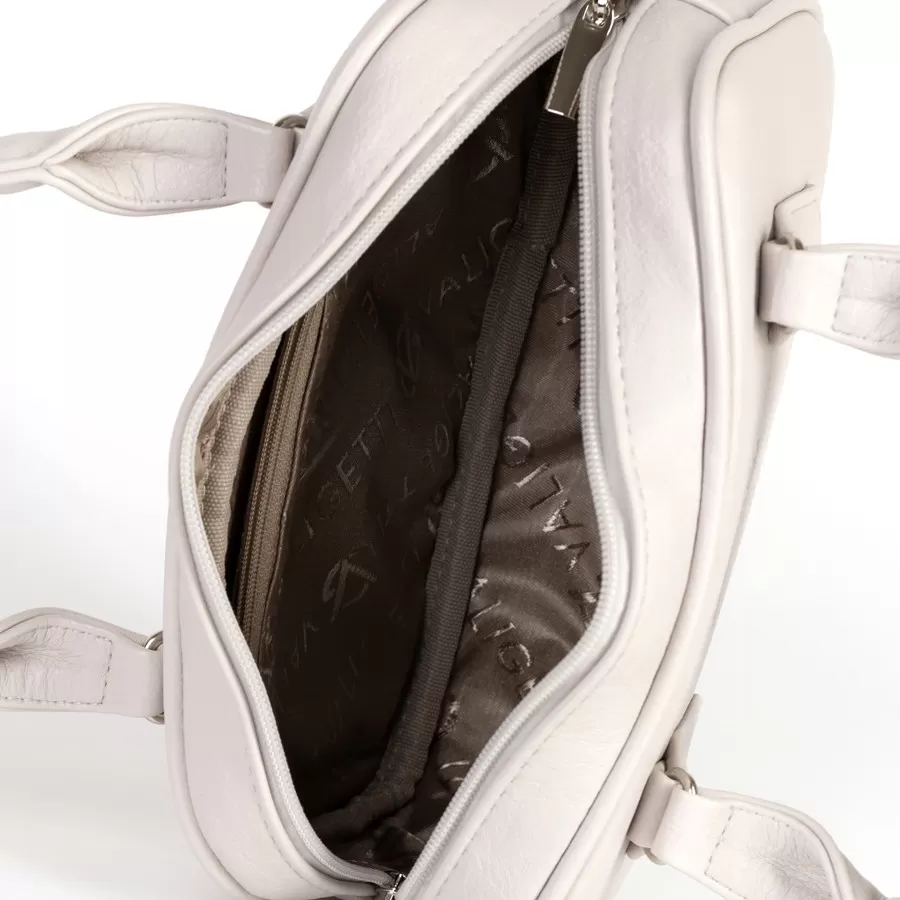 Женская сумка светло‑бежевого цвета с лаконичным дизайном и жёсткой формой. Внутри — подкладка из ткани коричневого оттенка с узорным принтом и карманом на молнии. Длинный плечевой ремень в комплекте.