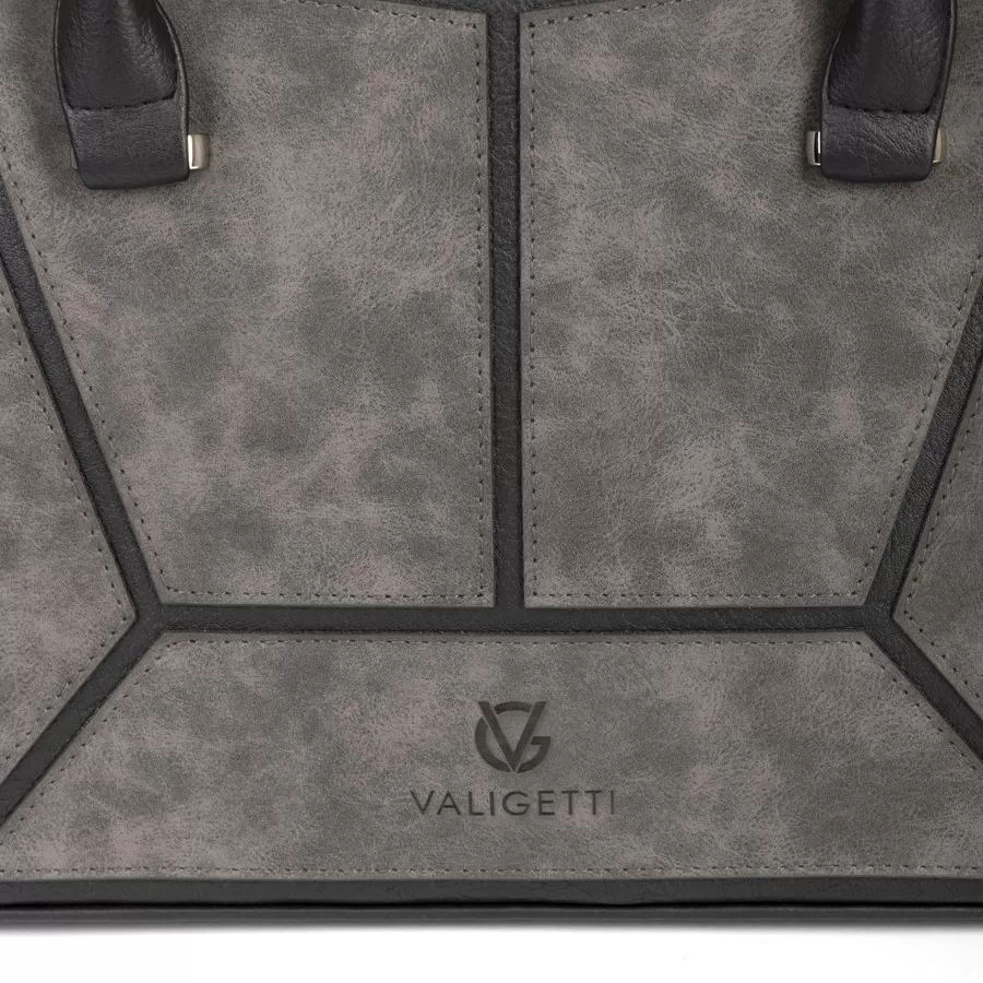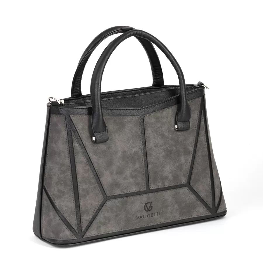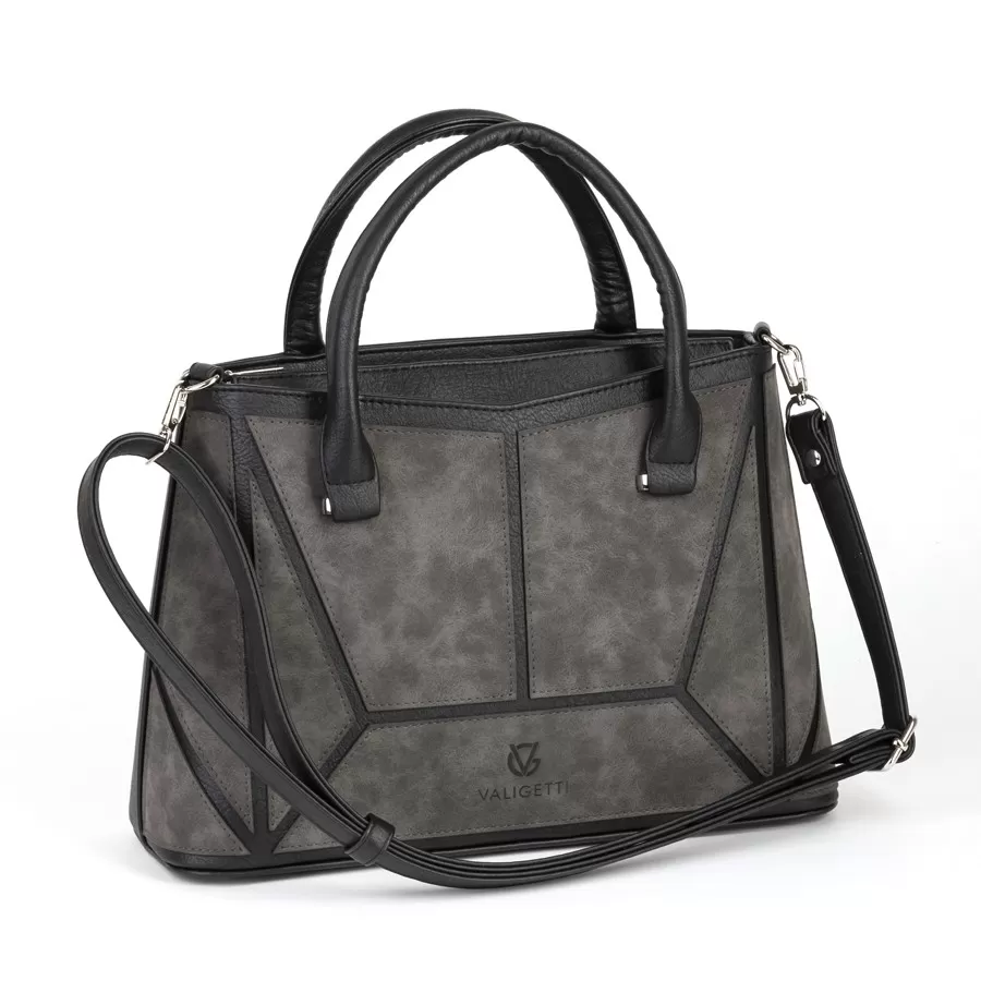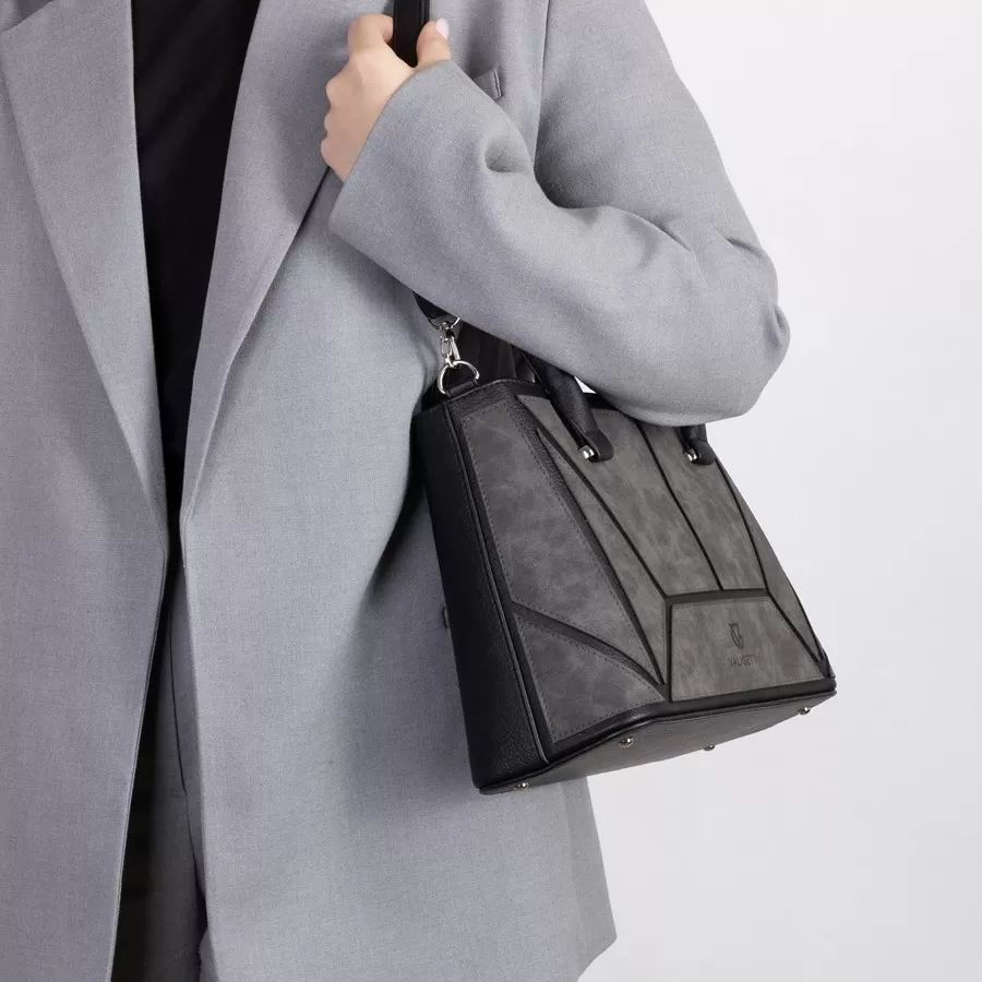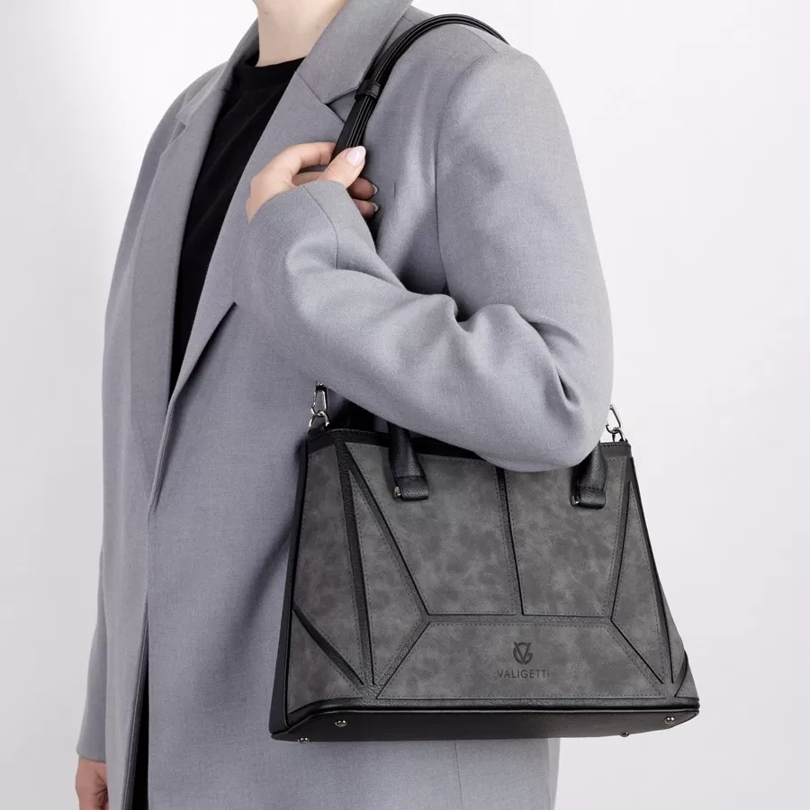 Женская сумка с современным геометрическим дизайном. Корпус выполнен в сером цвете с чёрными вставками, образующими чёткие угловые линии. Форма — трапециевидная, структурированная, с жёстким силуэтом. Внутри одно большое отделение, два кармана на молнии и плечевой ремень в комплекте.