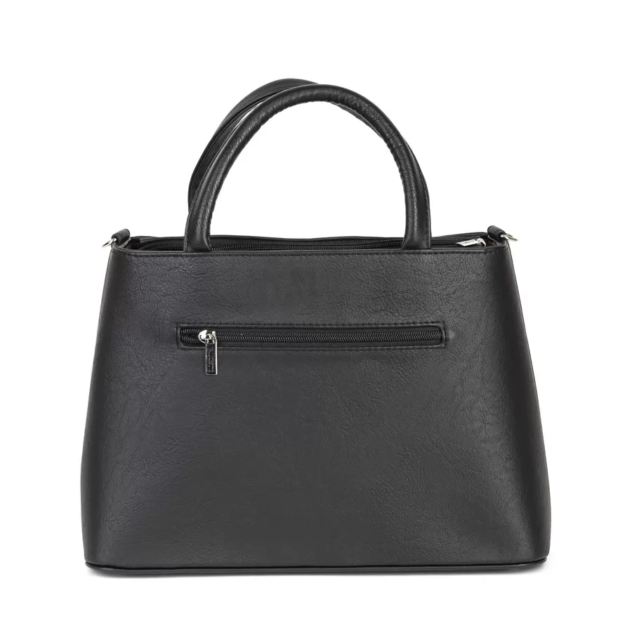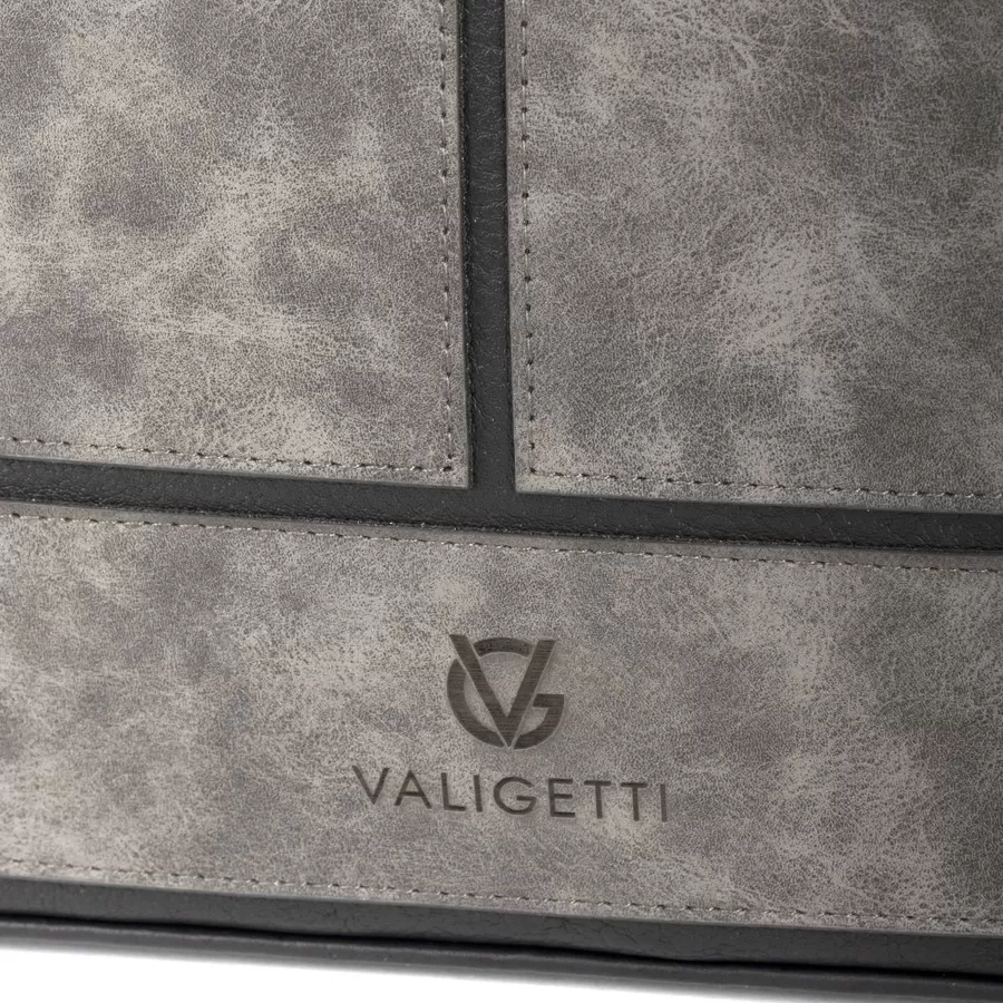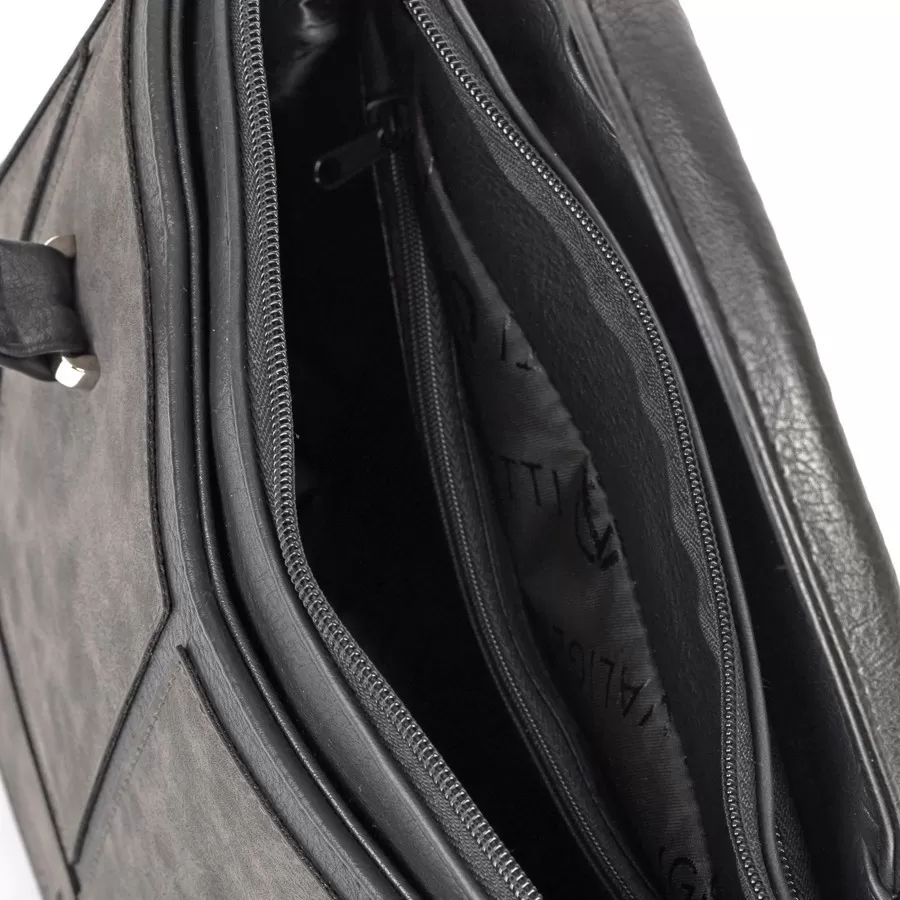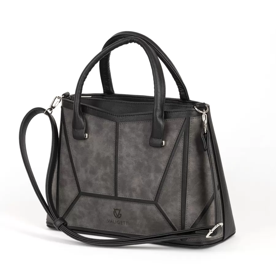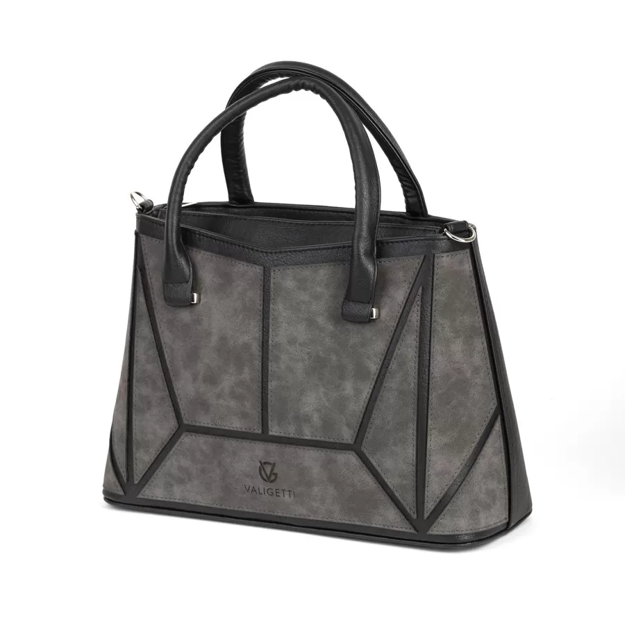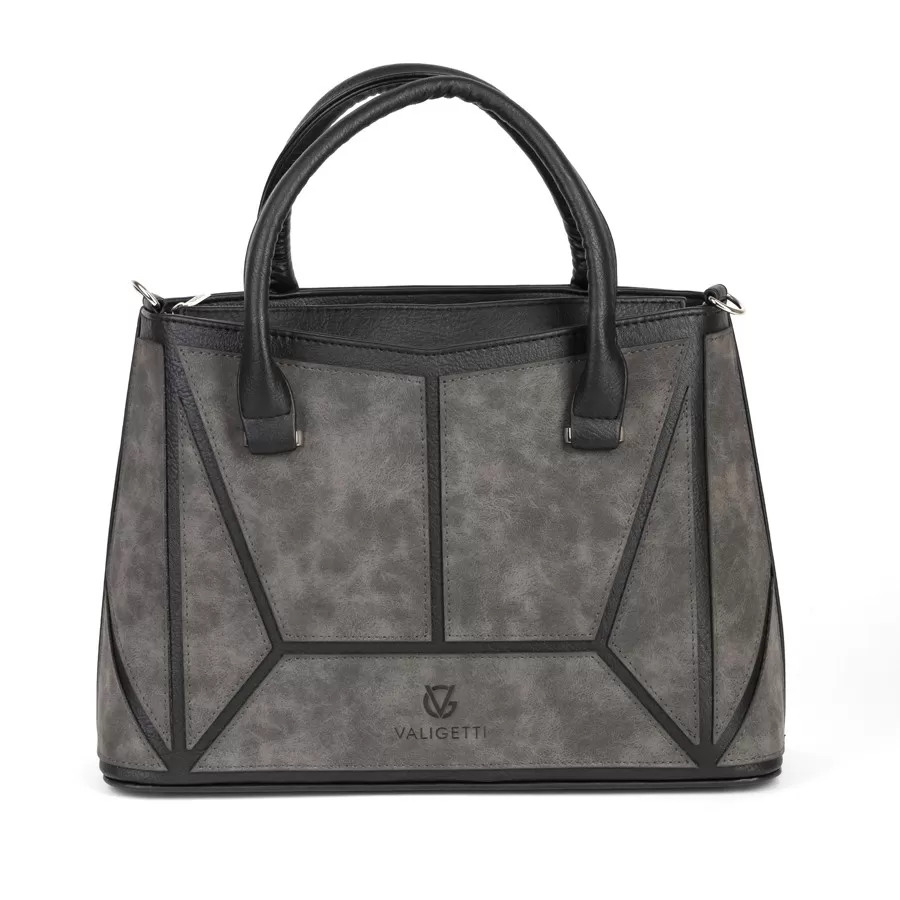 Женская сумка с современным геометрическим дизайном. Корпус выполнен в сером цвете с чёрными вставками, образующими чёткие угловые линии. Форма — трапециевидная, структурированная, с жёстким силуэтом. Внутри одно большое отделение, два кармана на молнии и плечевой ремень в комплекте.