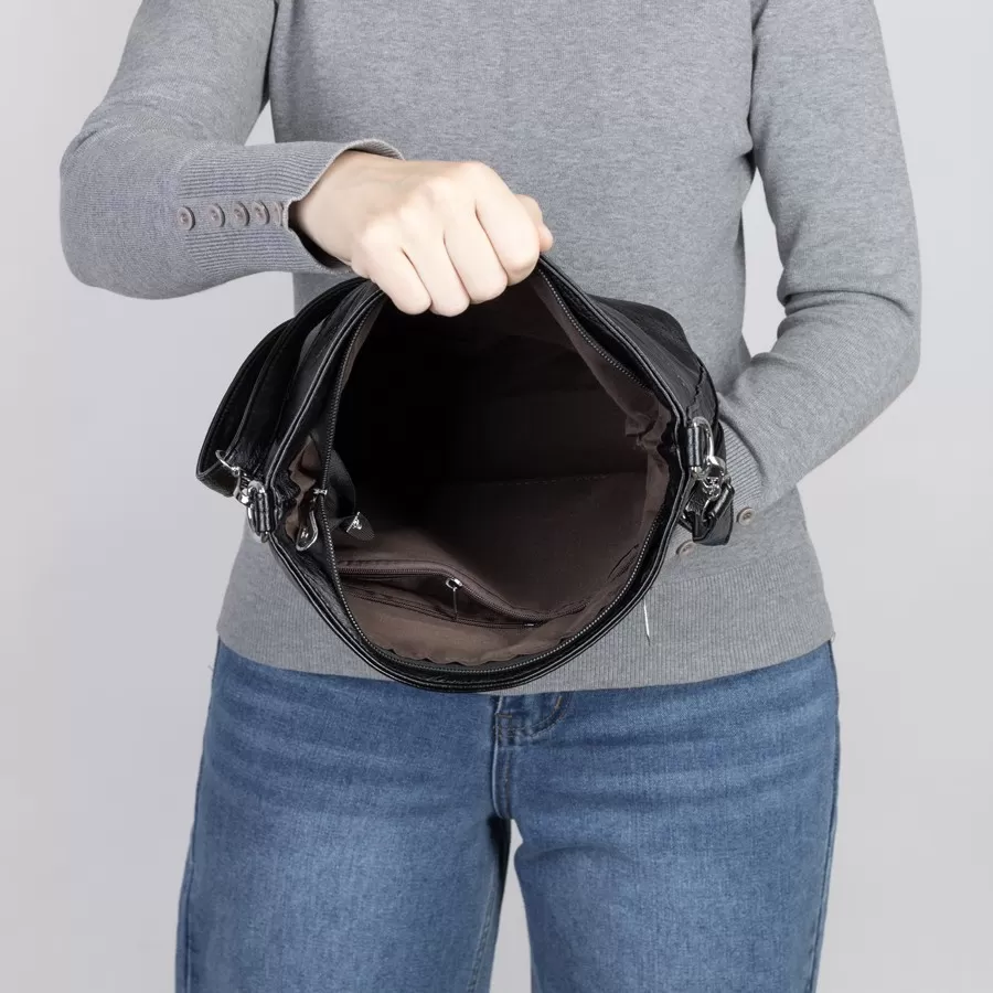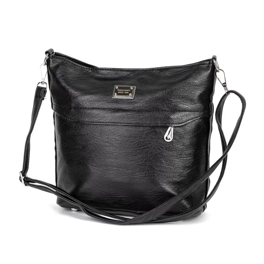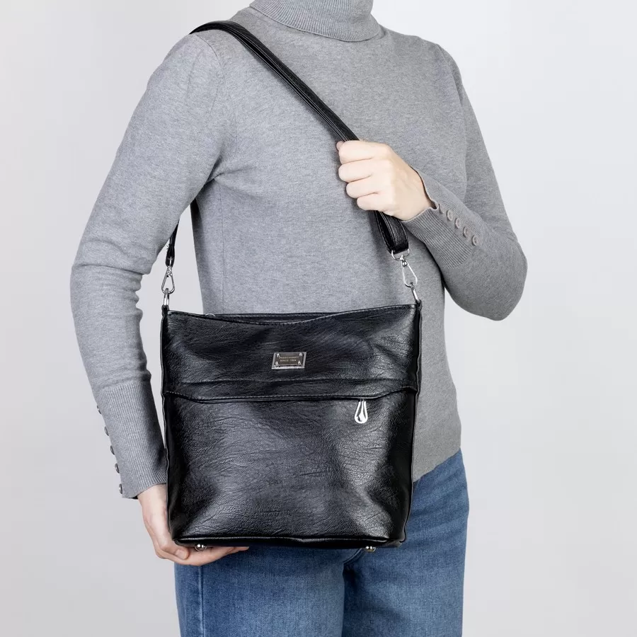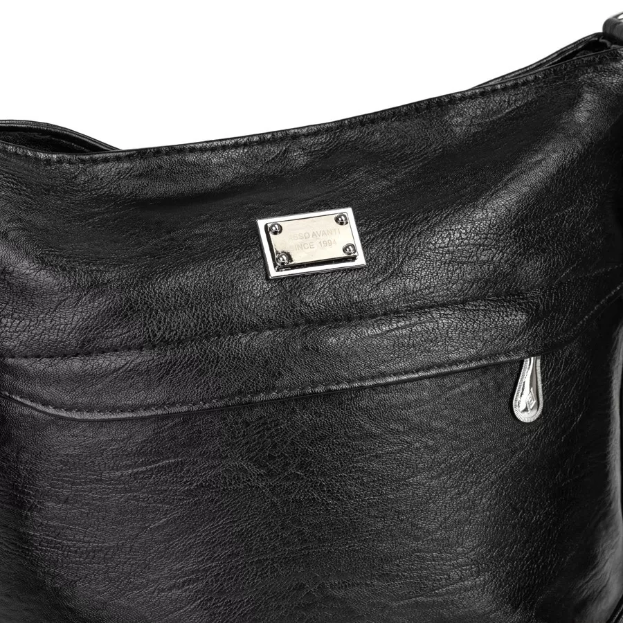 Сумка от торговой марки Passo Avanti из искусственной кожи черного цвета. Модель со съемным регулируемым плечевым ремнем. Отделение на молнии. Внутри: текстильная подкладка, средник и карман на молнии, два накладных кармана. На лицевой стороне – карман на скрытой молнии, на задней – карман на молнии. Дно оснащено металлическими ножками для защиты от износа.