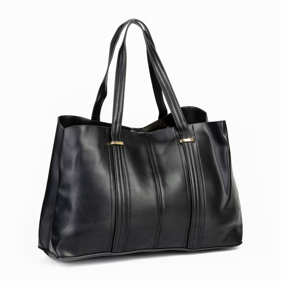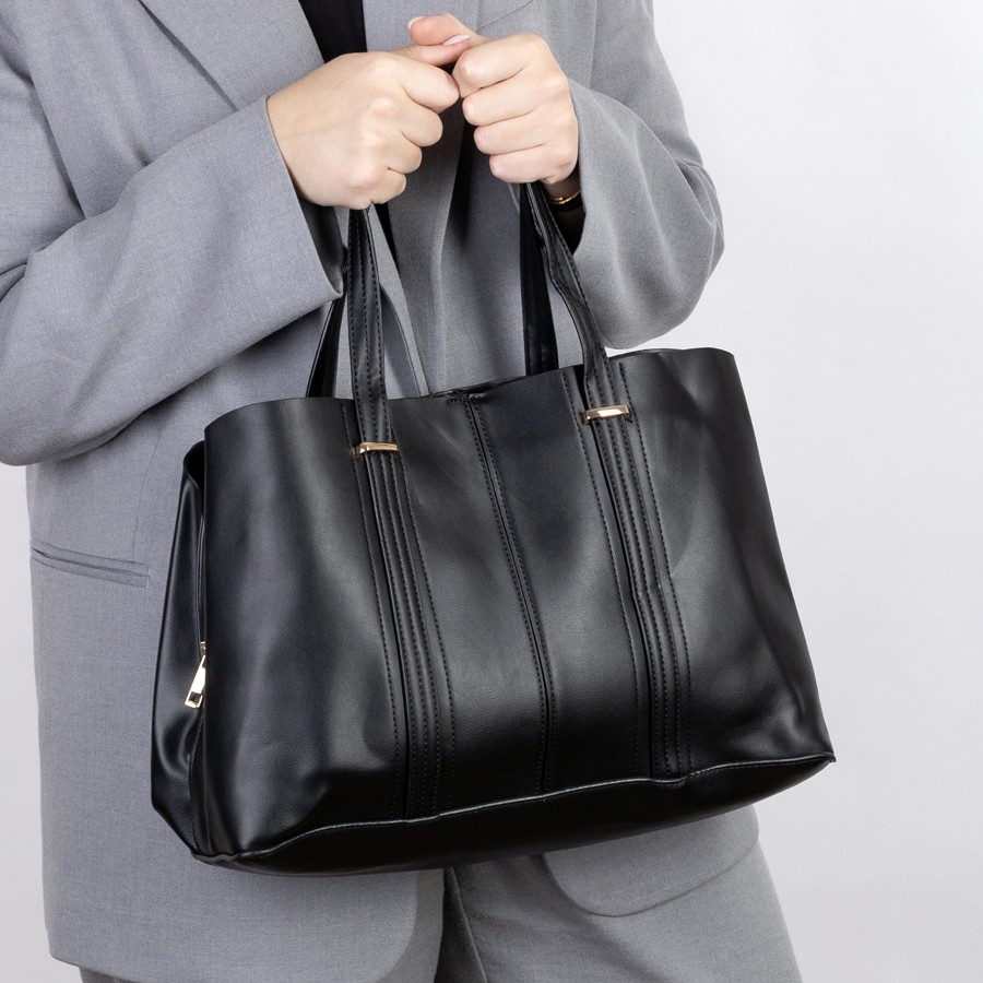 Сумка от торговой марки Marzia из искусственной кожи черного цвета с элегантным дизайном. Модель с двумя ручками. Фурнитура золотистого тона подчёркивает премиальный вид. Внутри — три просторных отделения и карманом на молнии.